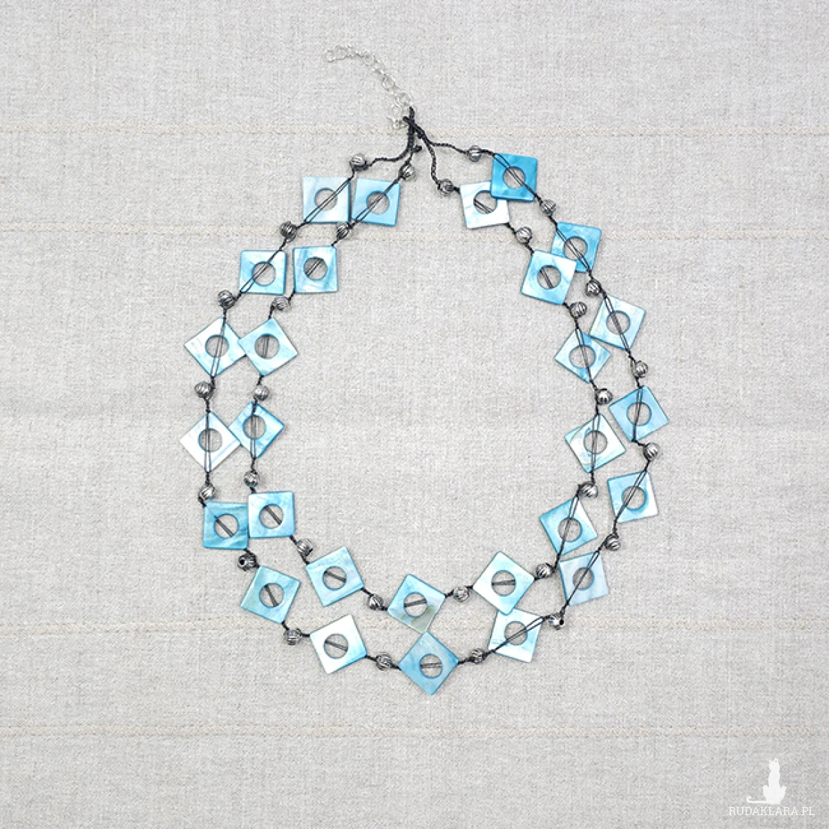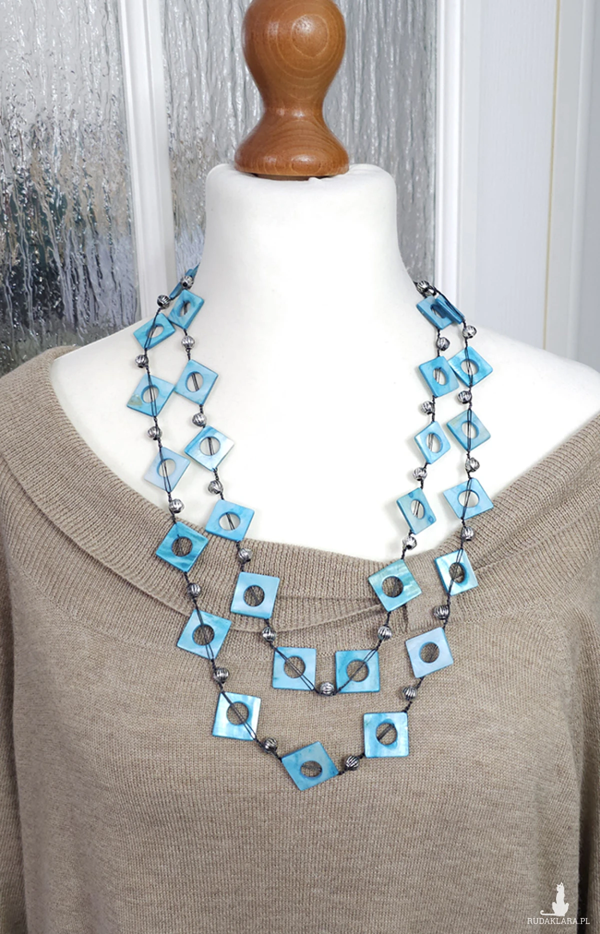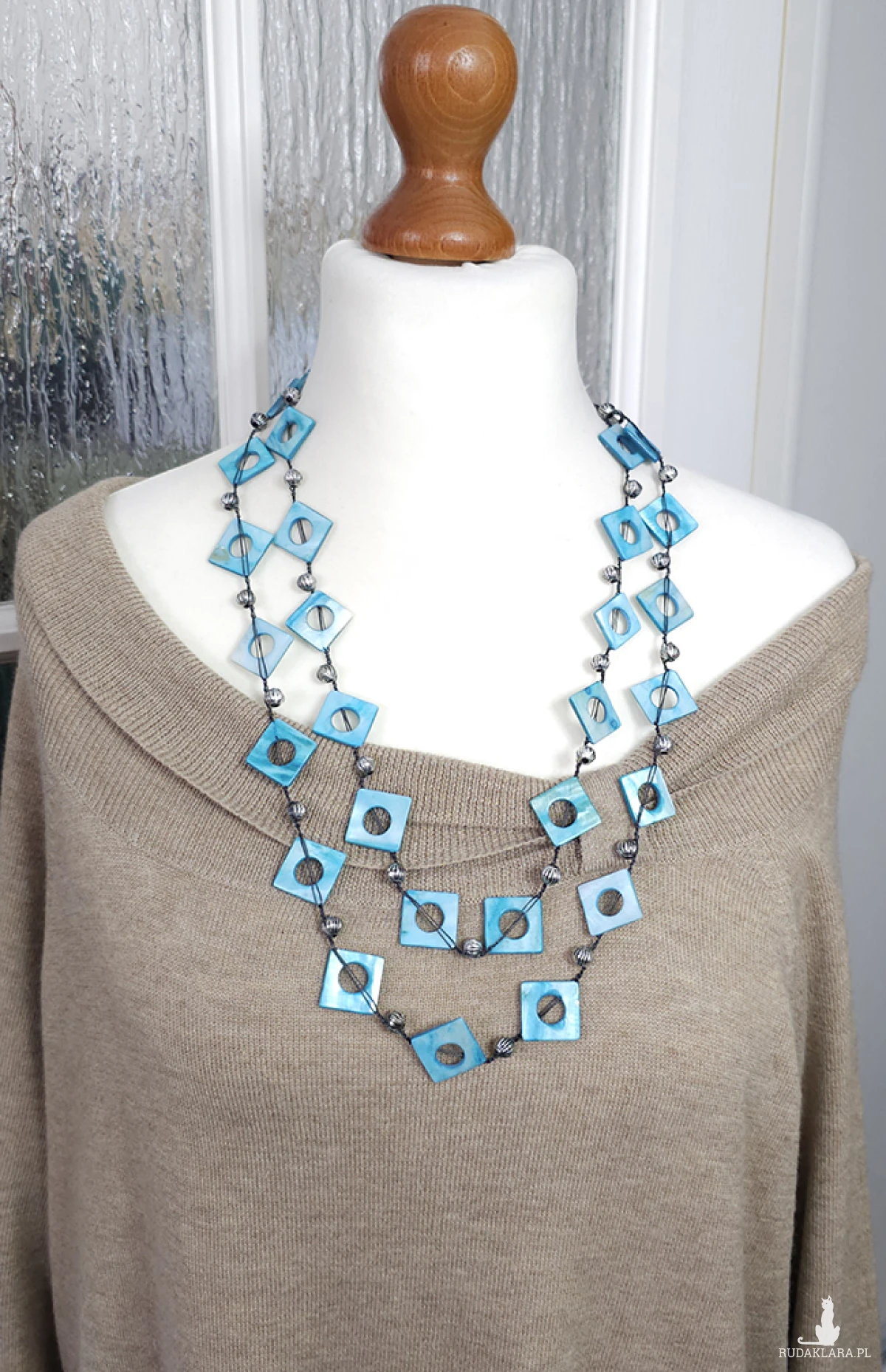 Wykonany z turkusowych, kwadratowych elementów z naturalnej masy perłowej przeplatanych metalicznymi, srebrnymi koralikami akrylowymi. To idealny dodatek, który ożywi każdą stylizację, dodając jej wakacyjnego lub artystycznego charakteru.