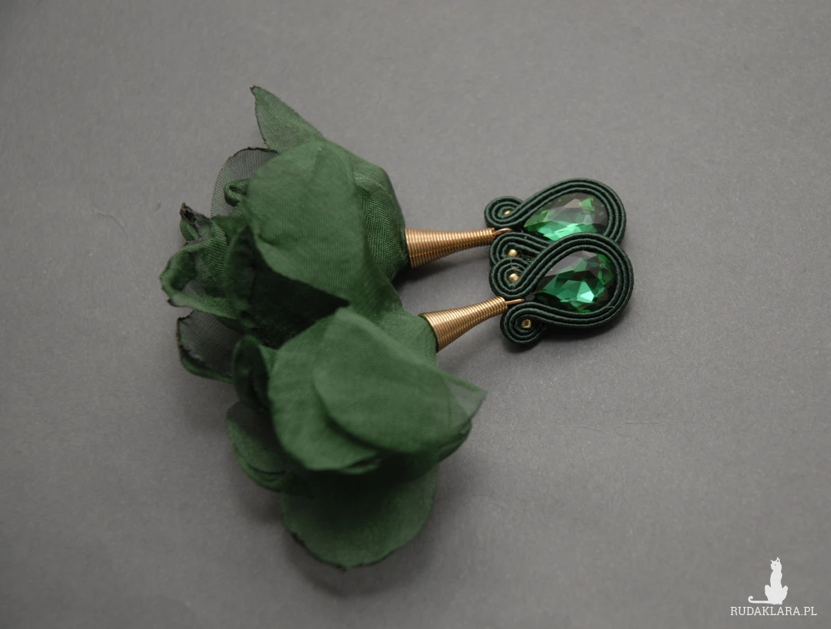 oferuję kolczyki (sztyfty) lub klipsy zrobione techniką sutasz, ozdobione fasetowanymi szklanymi kaboszonami i kwiatkami z materiału