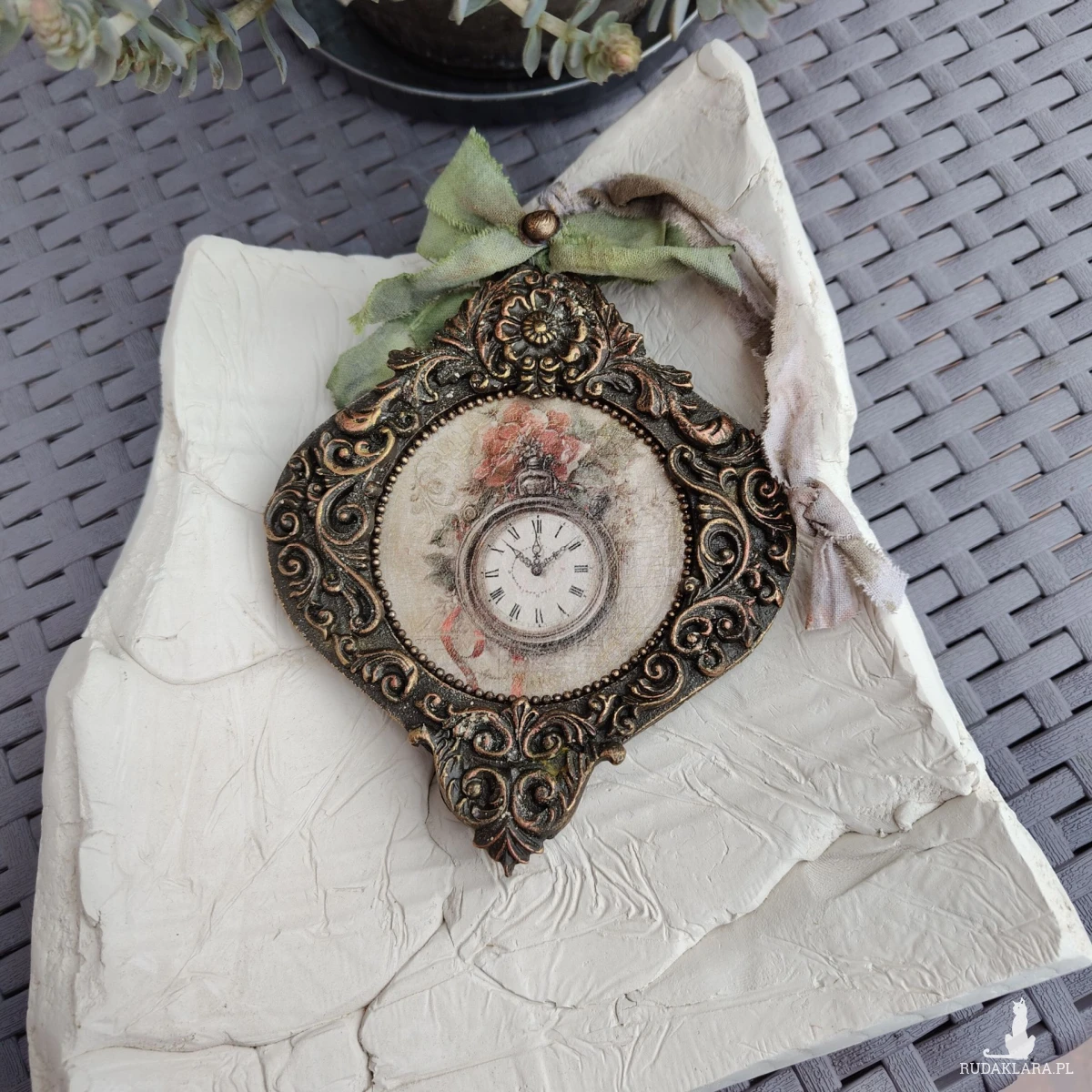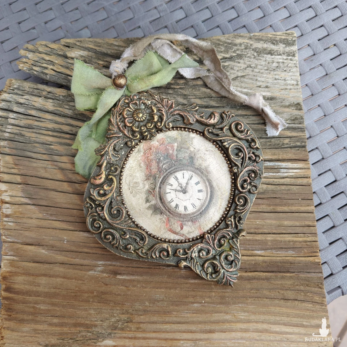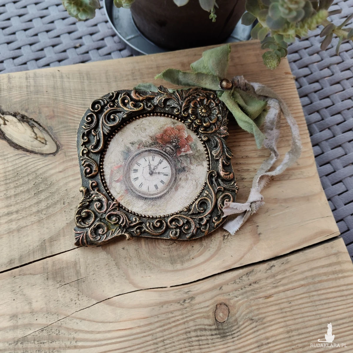 Ta elegancka zawieszka łączy w sobie klasyczny urok i nowoczesny styl. Antyczna rama w odcieniach brązu i złota, zdobiona misternymi wzorami kwiatowymi, otacza zegar o wyrafinowanym designie. Na górze ramy znajduje się zielona kokarda, która dodaje całości świeżości i uroku. Zawieszka doskonale wkomponuje się w różnorodne wnętrza, dodając im wyjątkowego charakteru.