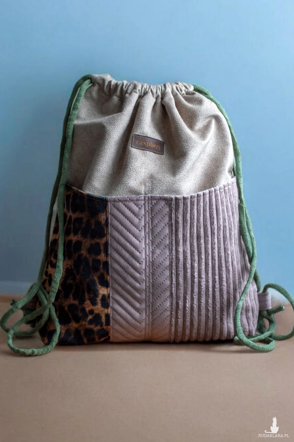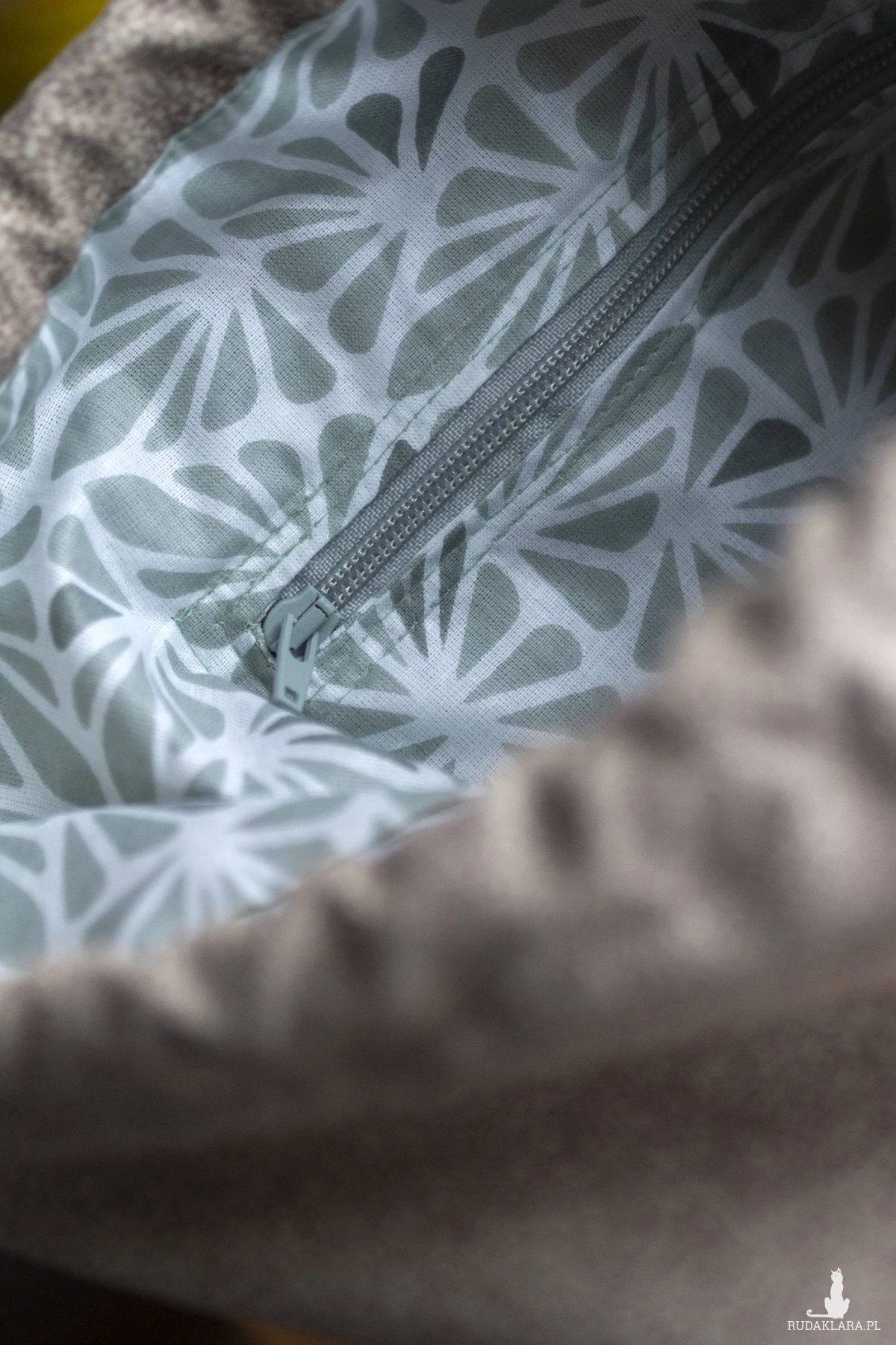 Dół tworzy dodatkowe miejsce na przechowywanie rzeczy - z przodu dwie kieszenie (np. na butelkę), z tyłu jedną duża kieszeń (idealna na tablet). Wykonane z różnych kawałków tkanin tworzących wspólnie ciekawą wizualnie całość.