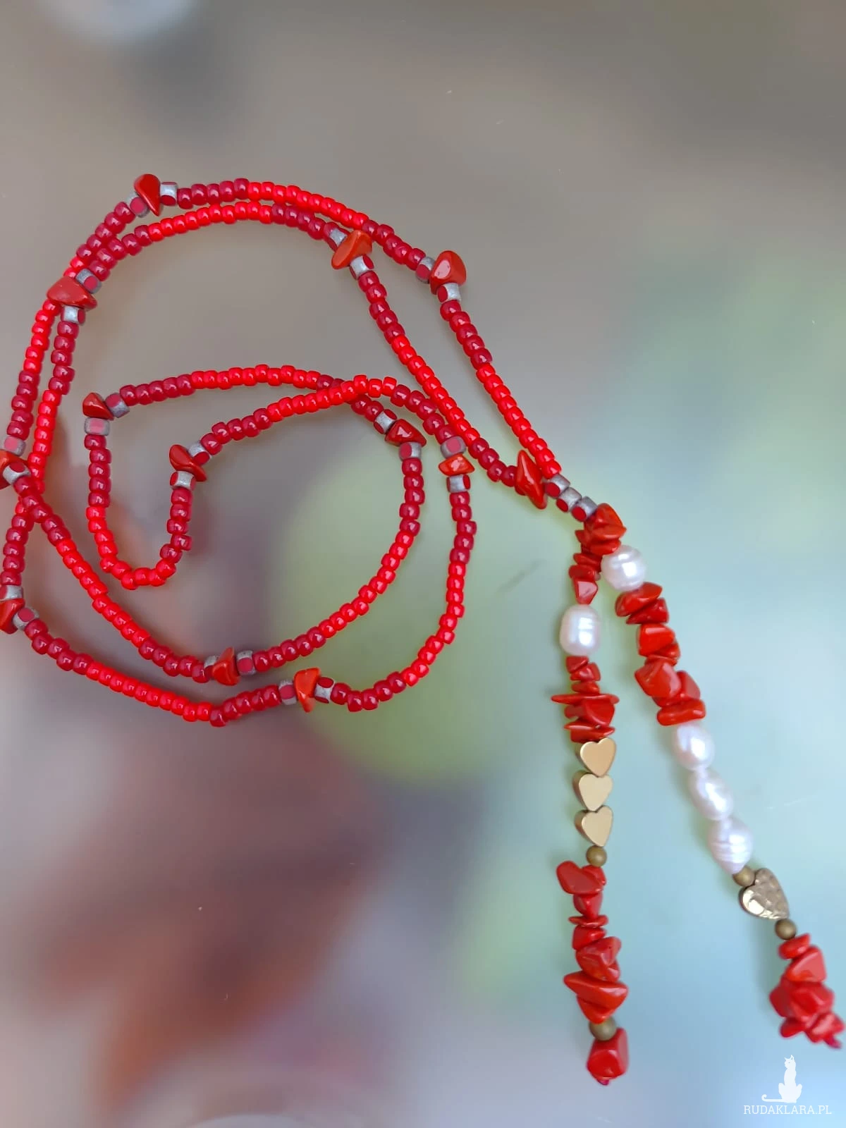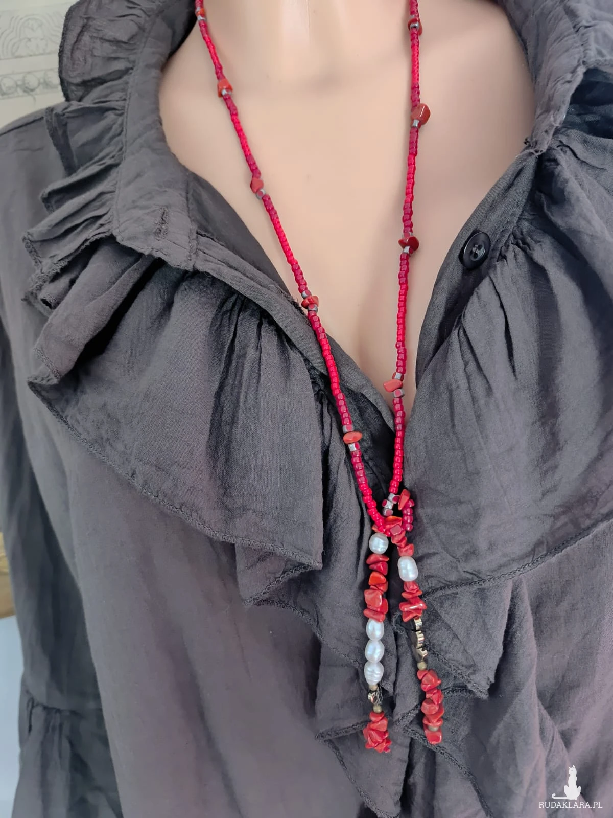 Naszyjnik długi z koralików. Koraliki szklane, czerwone różne i koral