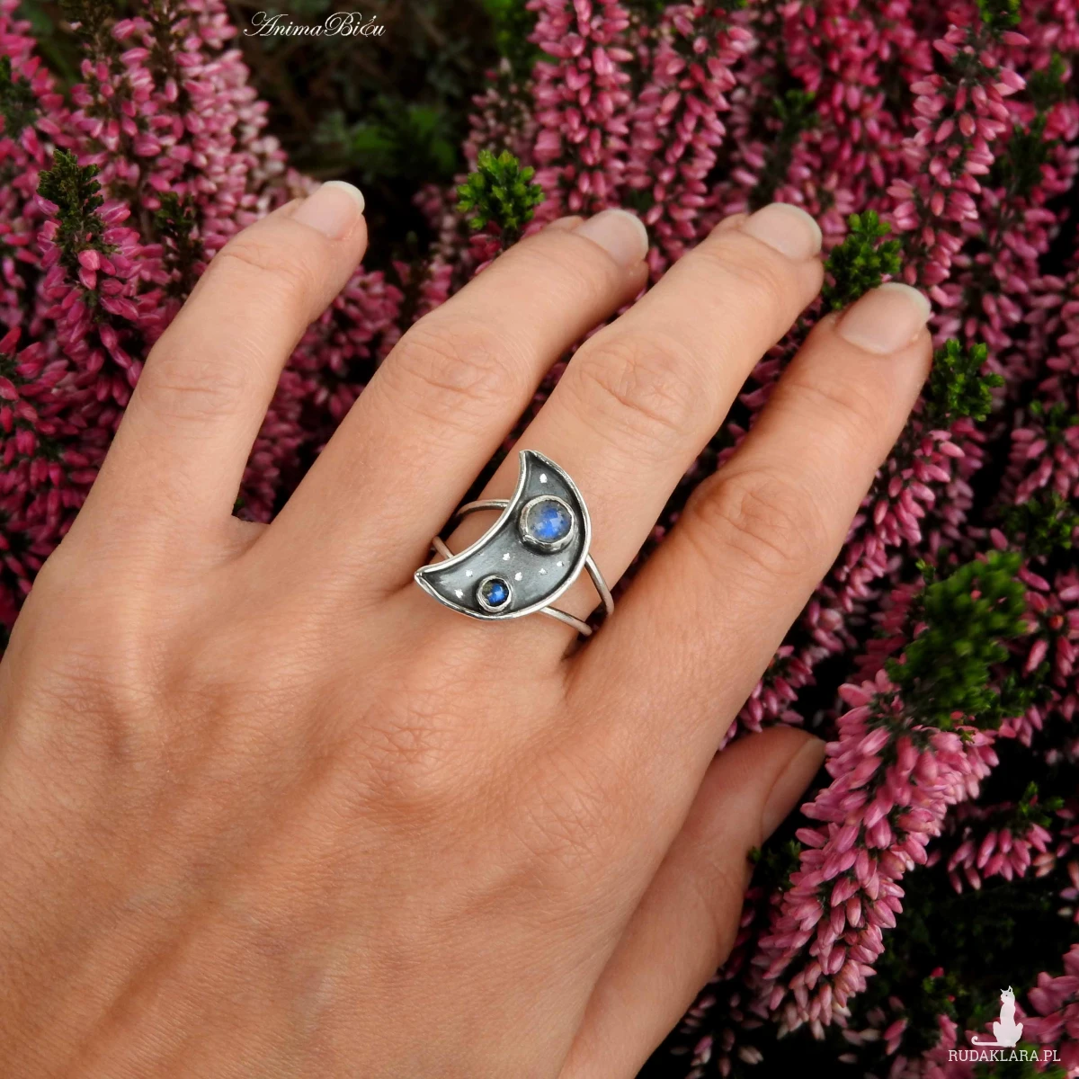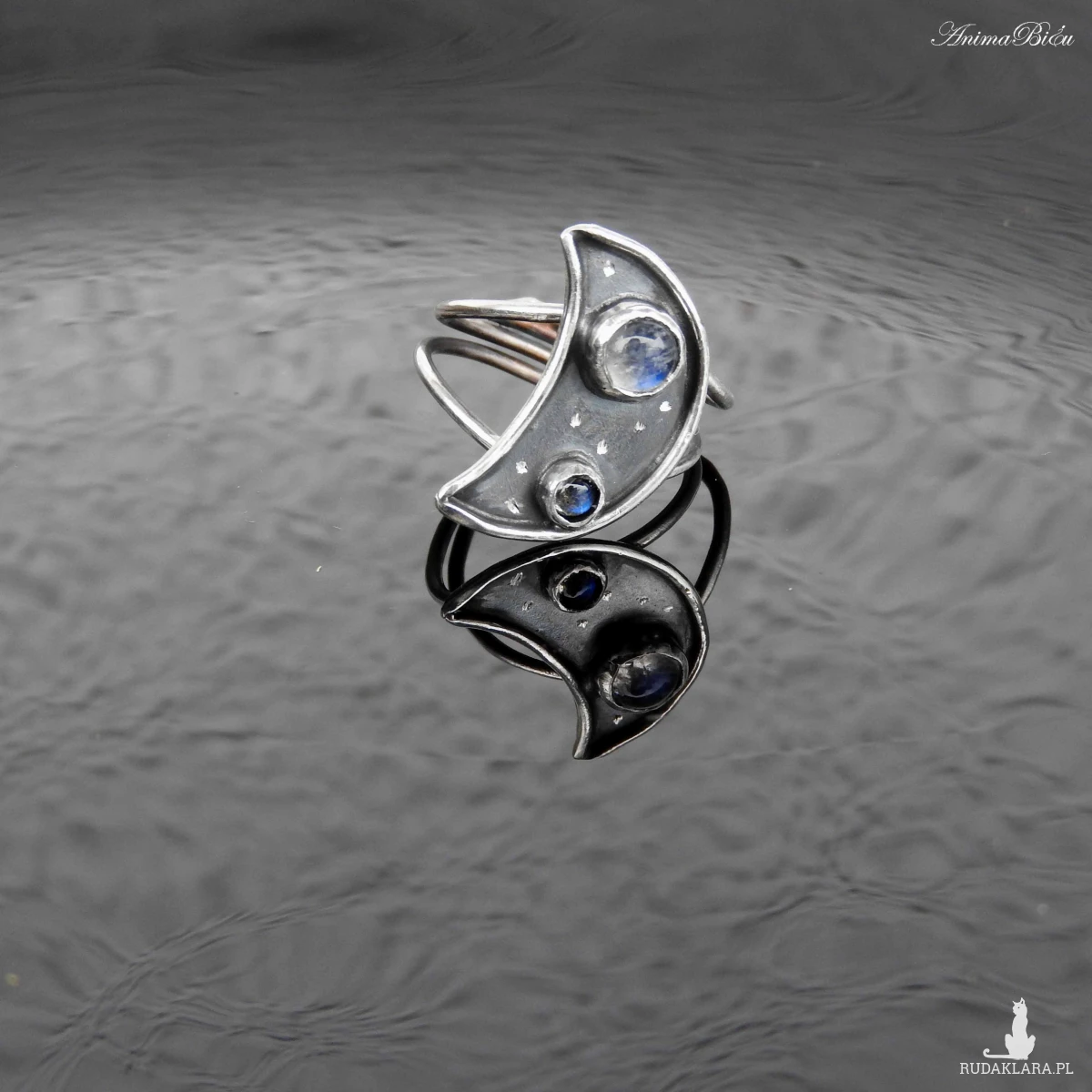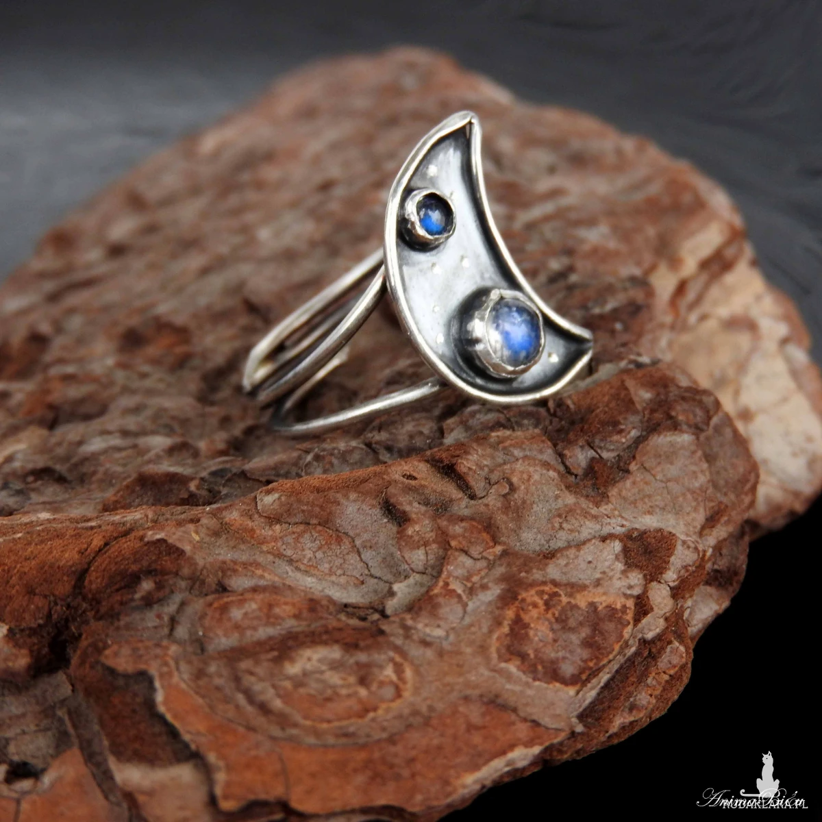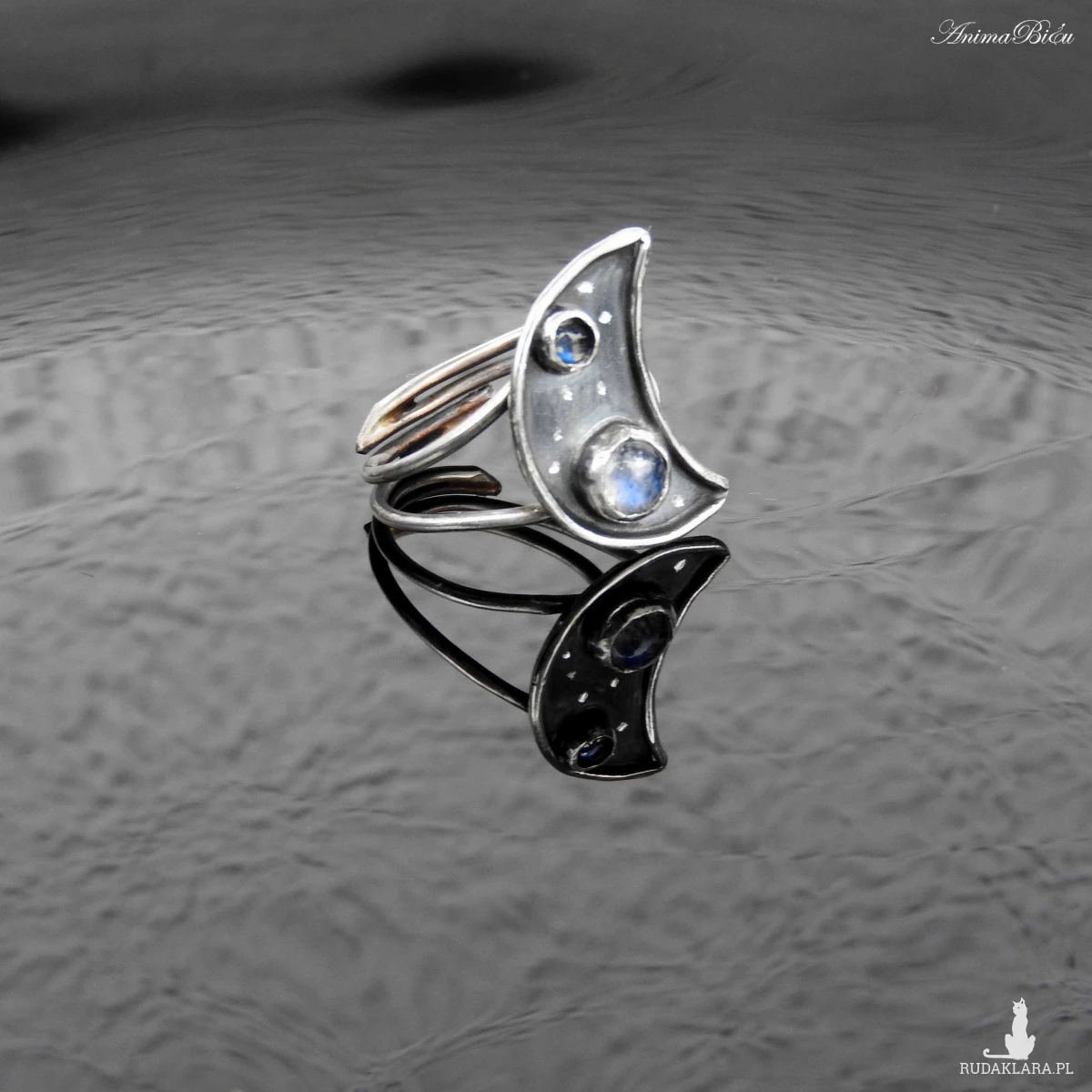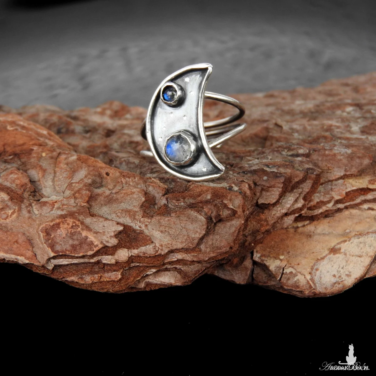 Pierścionek srebrny z kamieniem księżycowym i labradorytem.