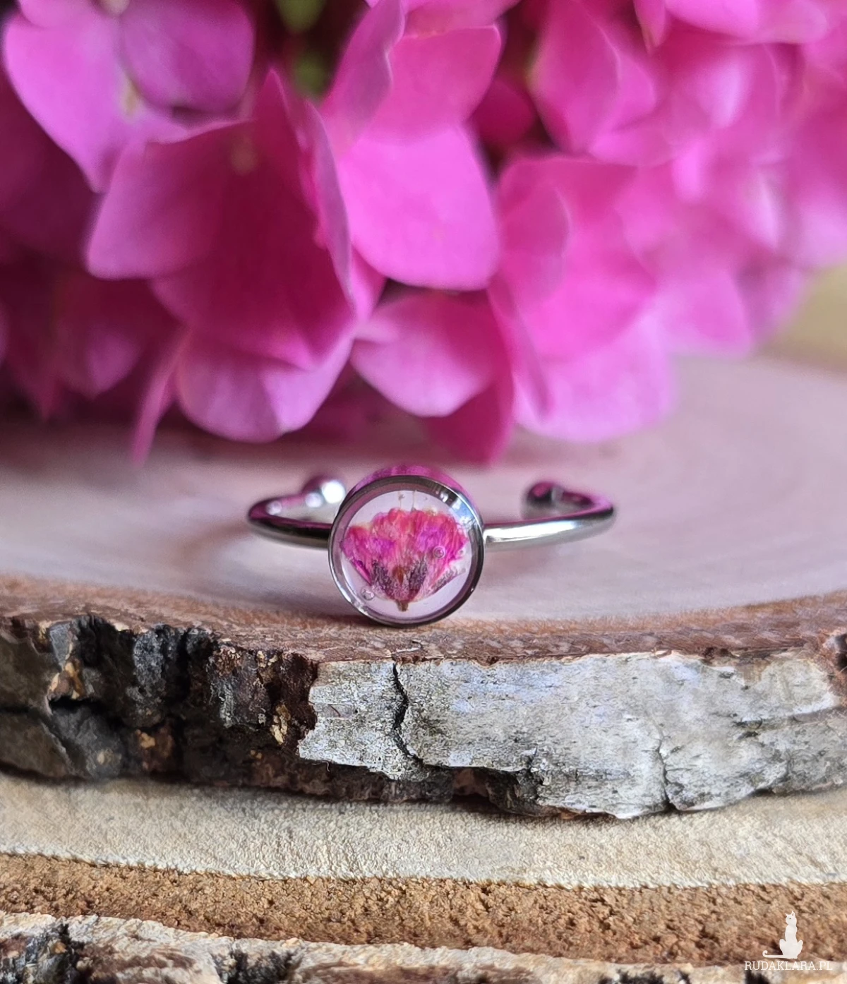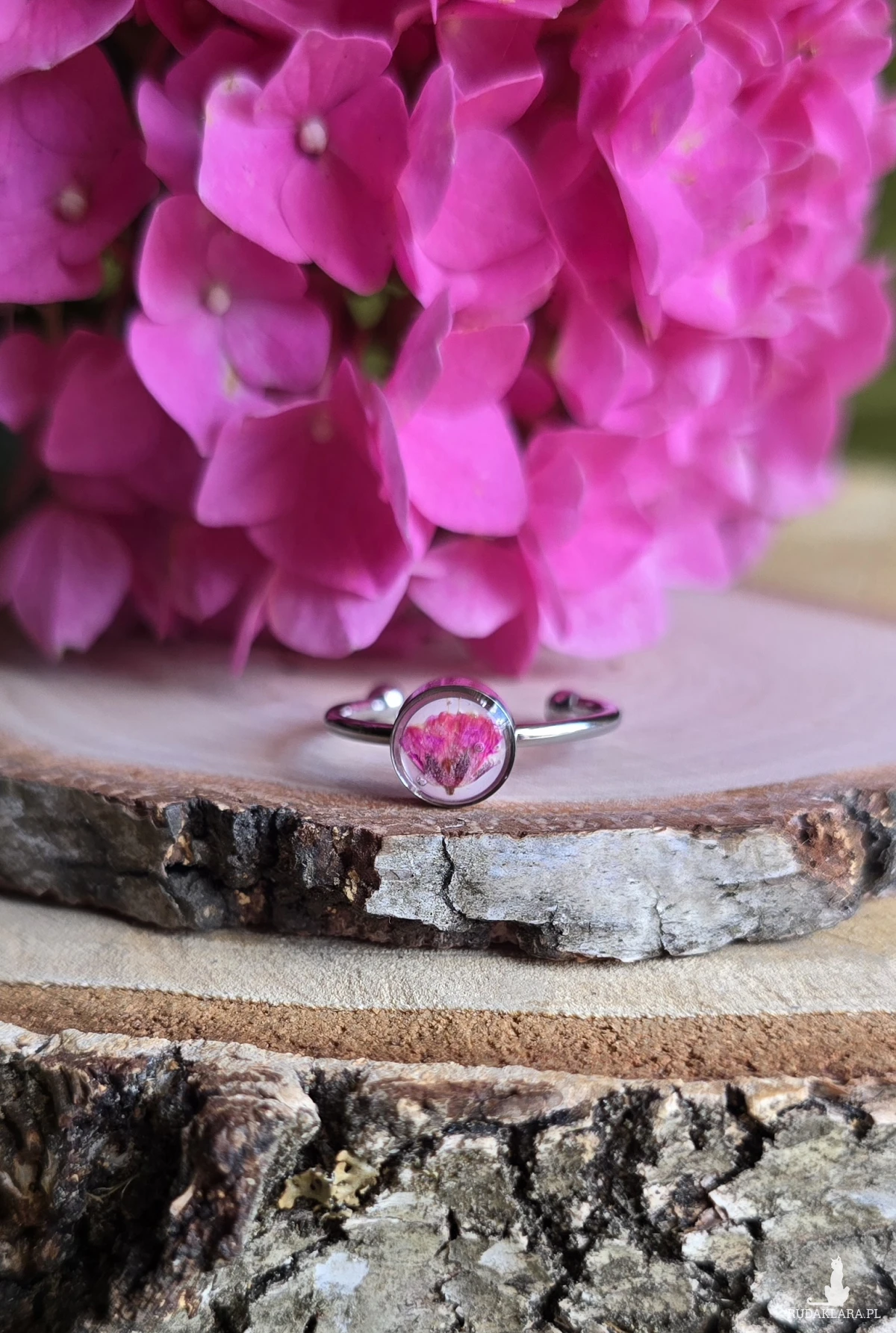 Oferuję Państwu unikalną biżuterię. Pierścionek jest wykonany z suszonych kwiatów i żywicy epoksydowej. Biżuteria jest wspaniałym i oryginalnym prezentem na lata.