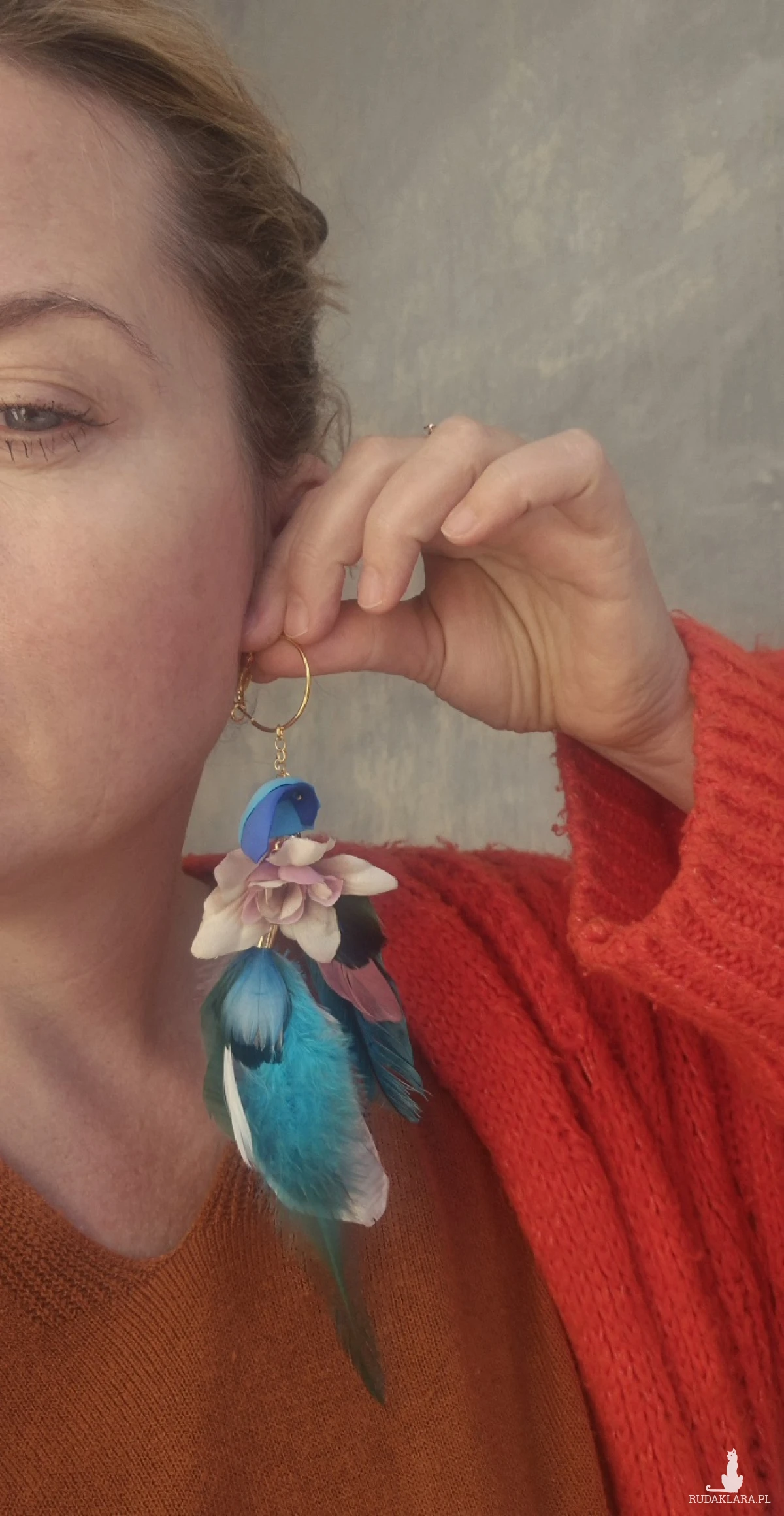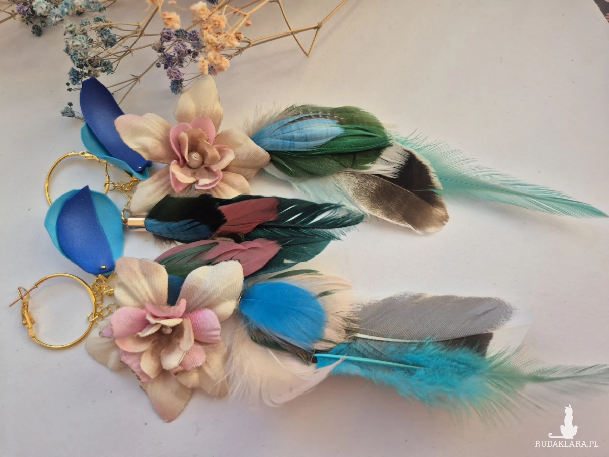 ręcznie robione kolczyki z piór i  kwiatów        Kolczyki pióra i kwiaty rękodzieło Boho cudne lekkie wykonane w pojedynczym egzemplarzu