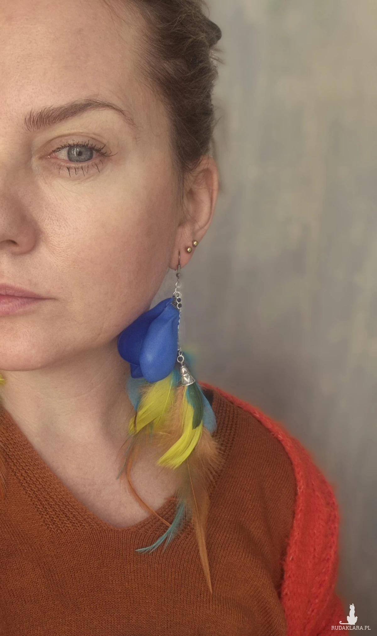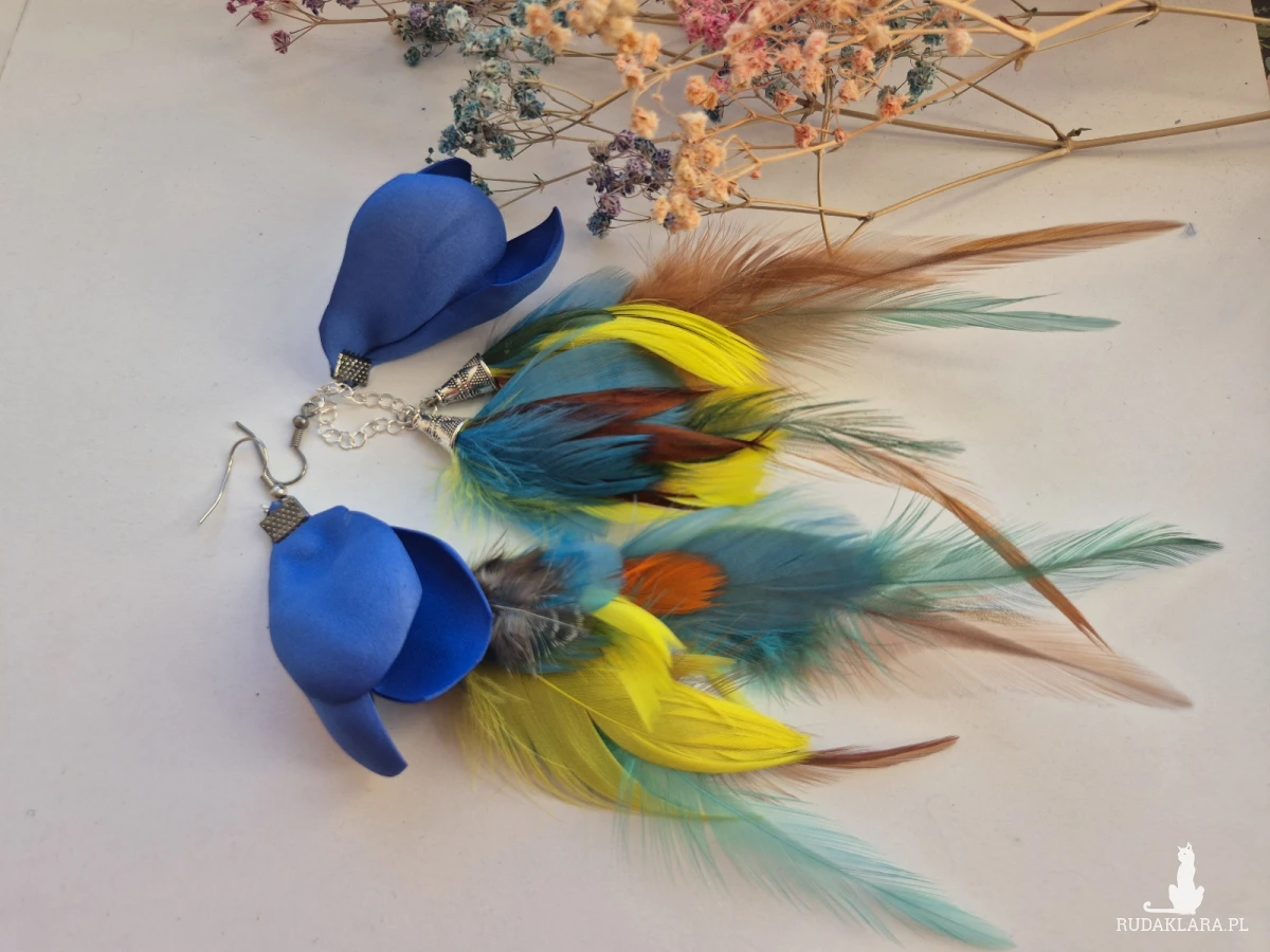 biżuteria handmade z kwiatami i piórami         Kolczyki pióra i kwiaty rękodzieło Boho cudne lekkie wykonane w pojedynczym egzemplarzu