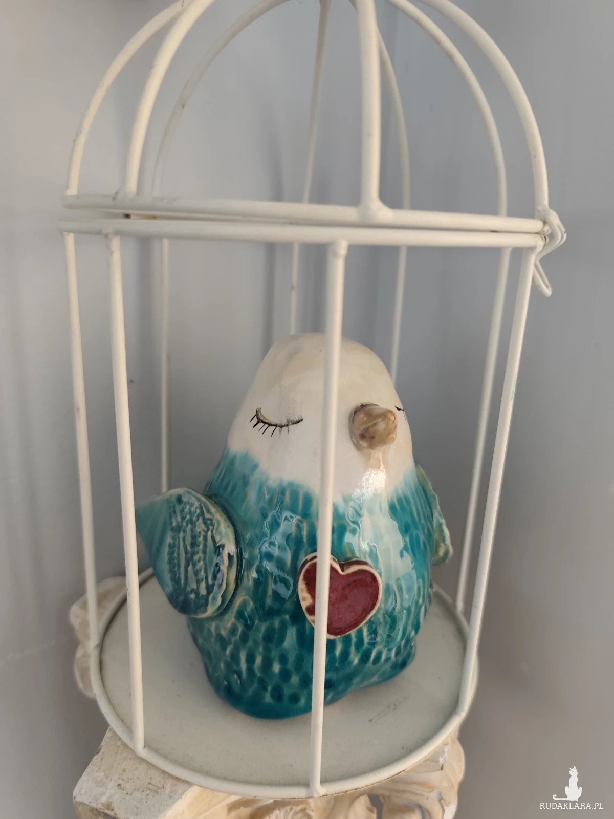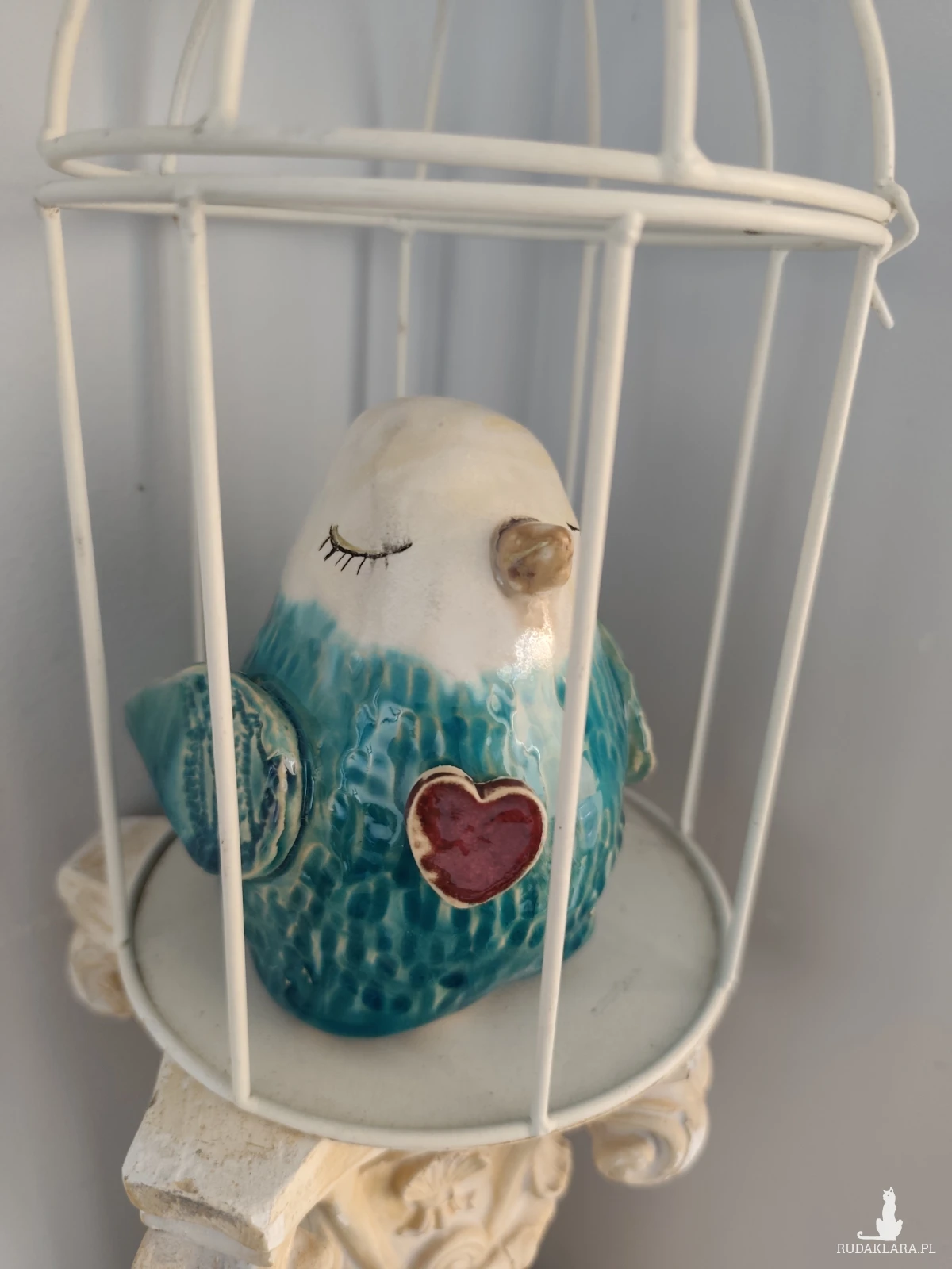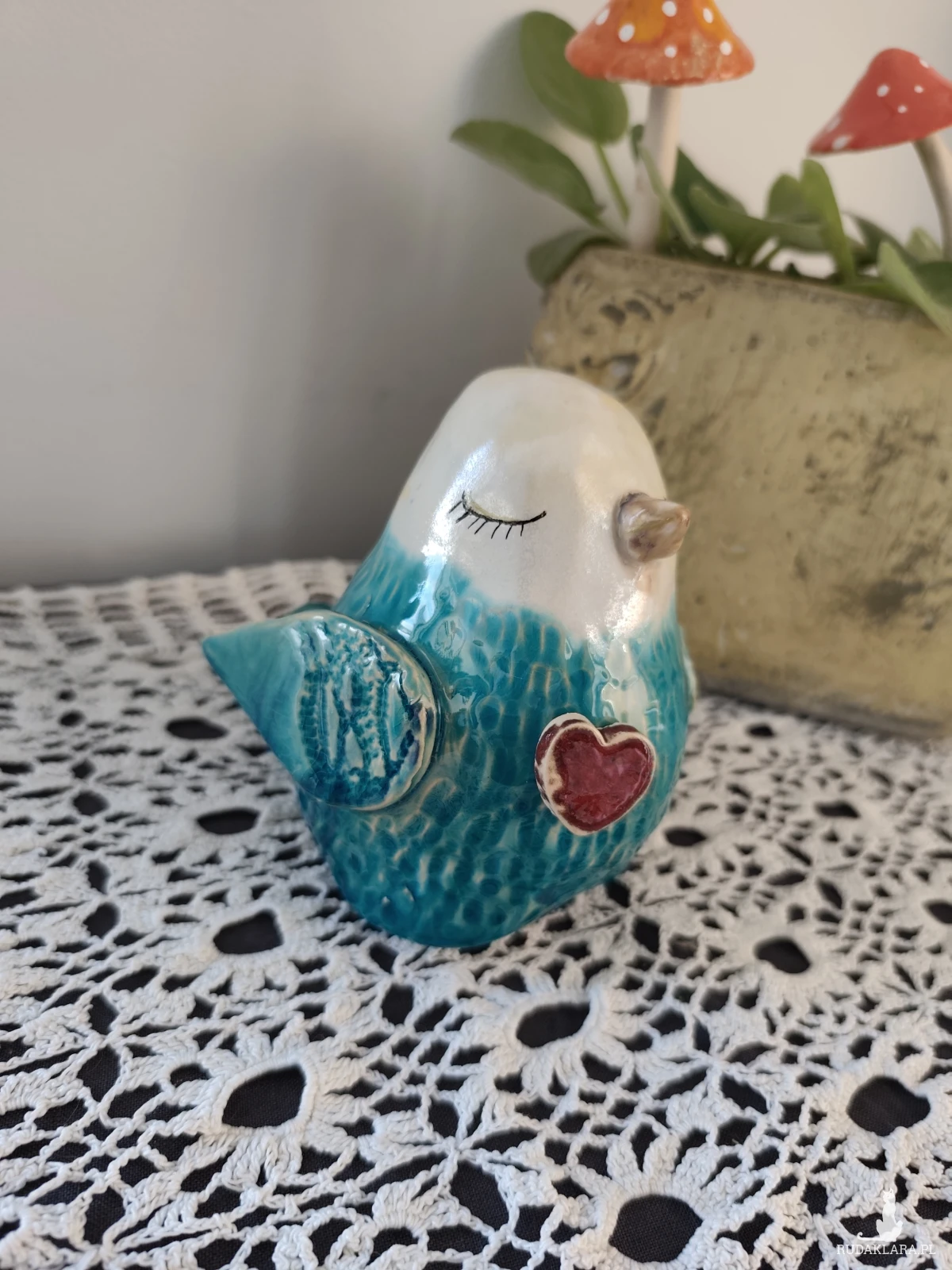 Ceramiczny zakochany wróbel, wykonany ręcznie, szkliwiony i dwukrotnie wypalany w piecu ceramicznym na wysoką temperaturę. Wielkość około 13 cm. Grubość w pasie nieokreślona 😉