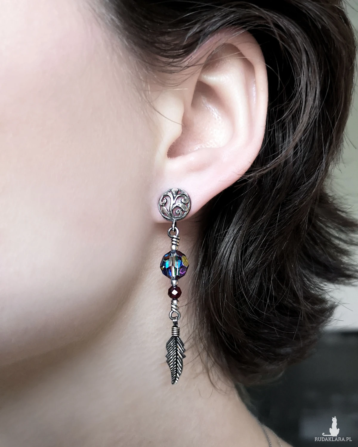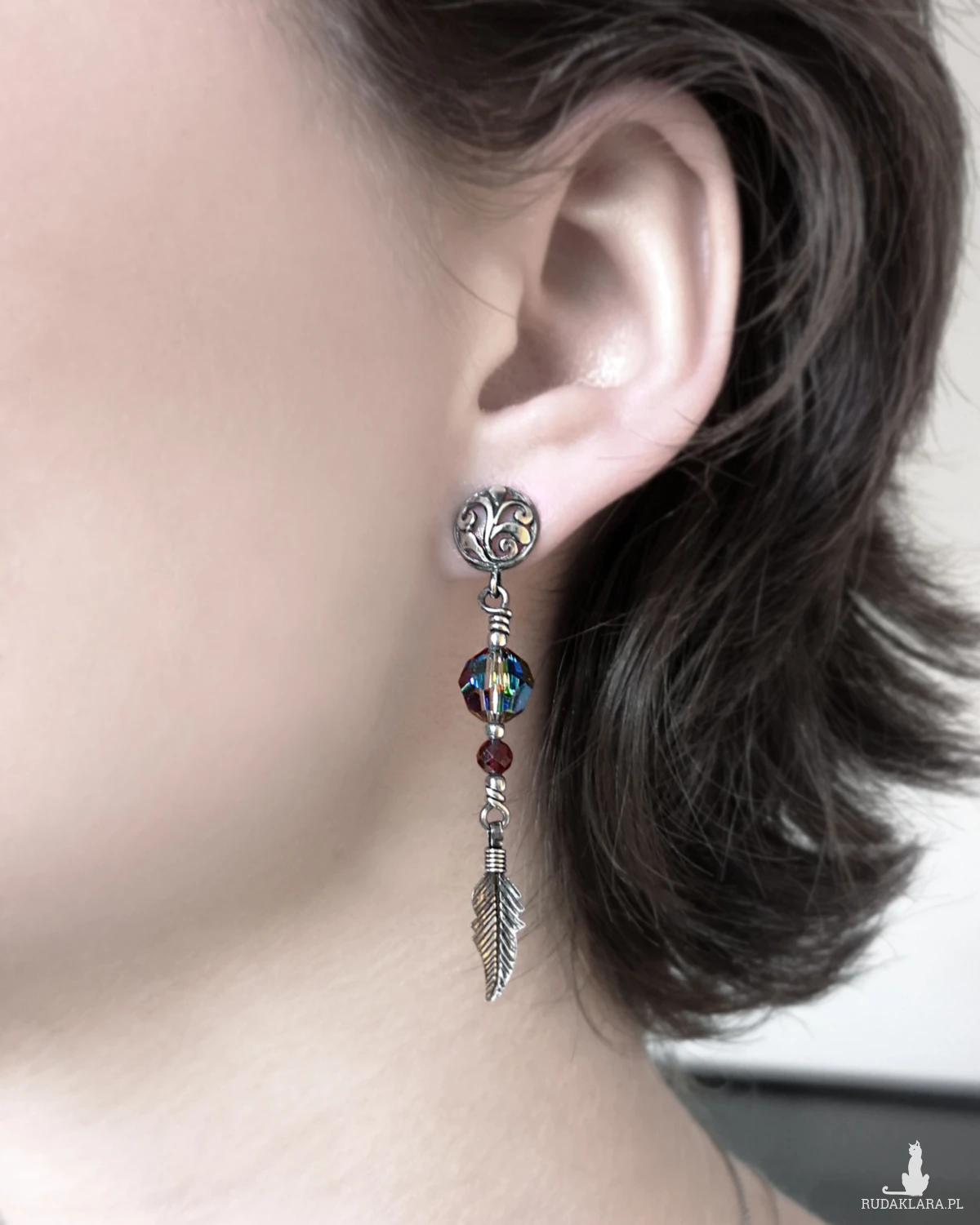 Kolczyki retro z fasetowanymi kulkami granatu o średnicy 4 mm i kolorowymi kryształkami o średnicy 8 mm.