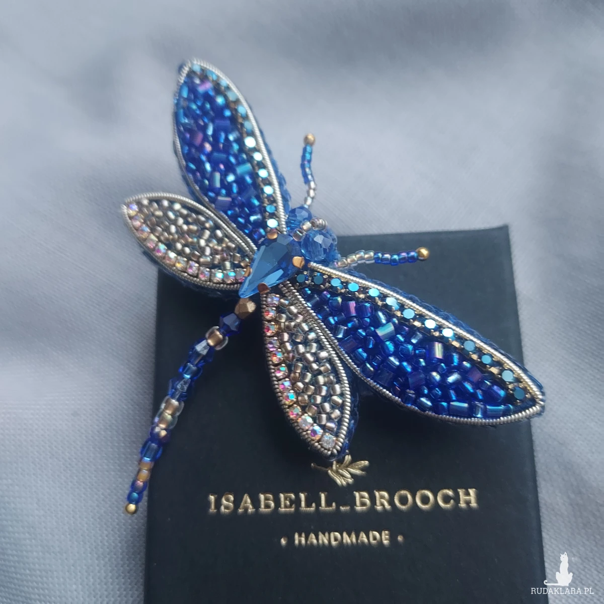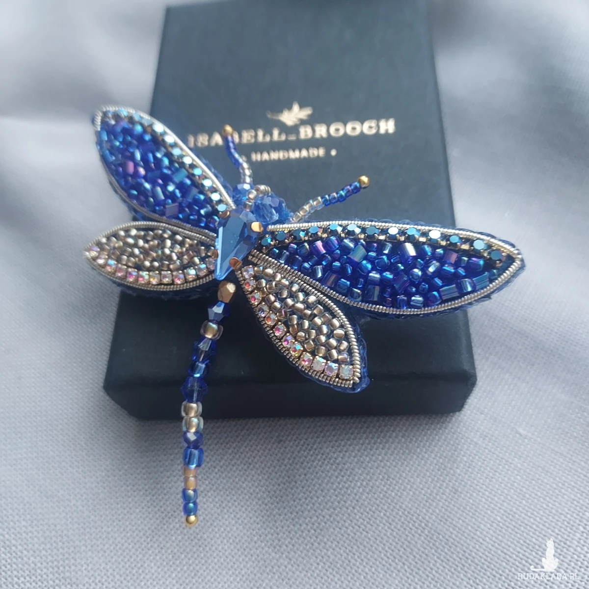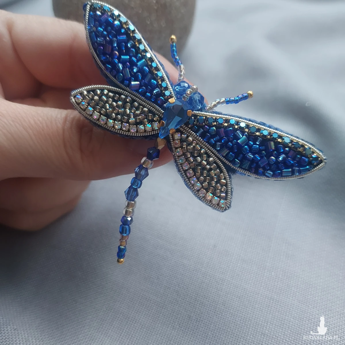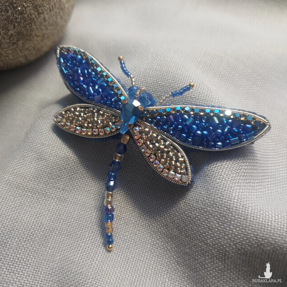 Broszka ważka w kolorze kobaltowo-szampańskim - wiosenno-letnie szaleństwo piękna oraz delikatności. Broszka powstała haftem koralikowym z dbałością o każdy szczegół.