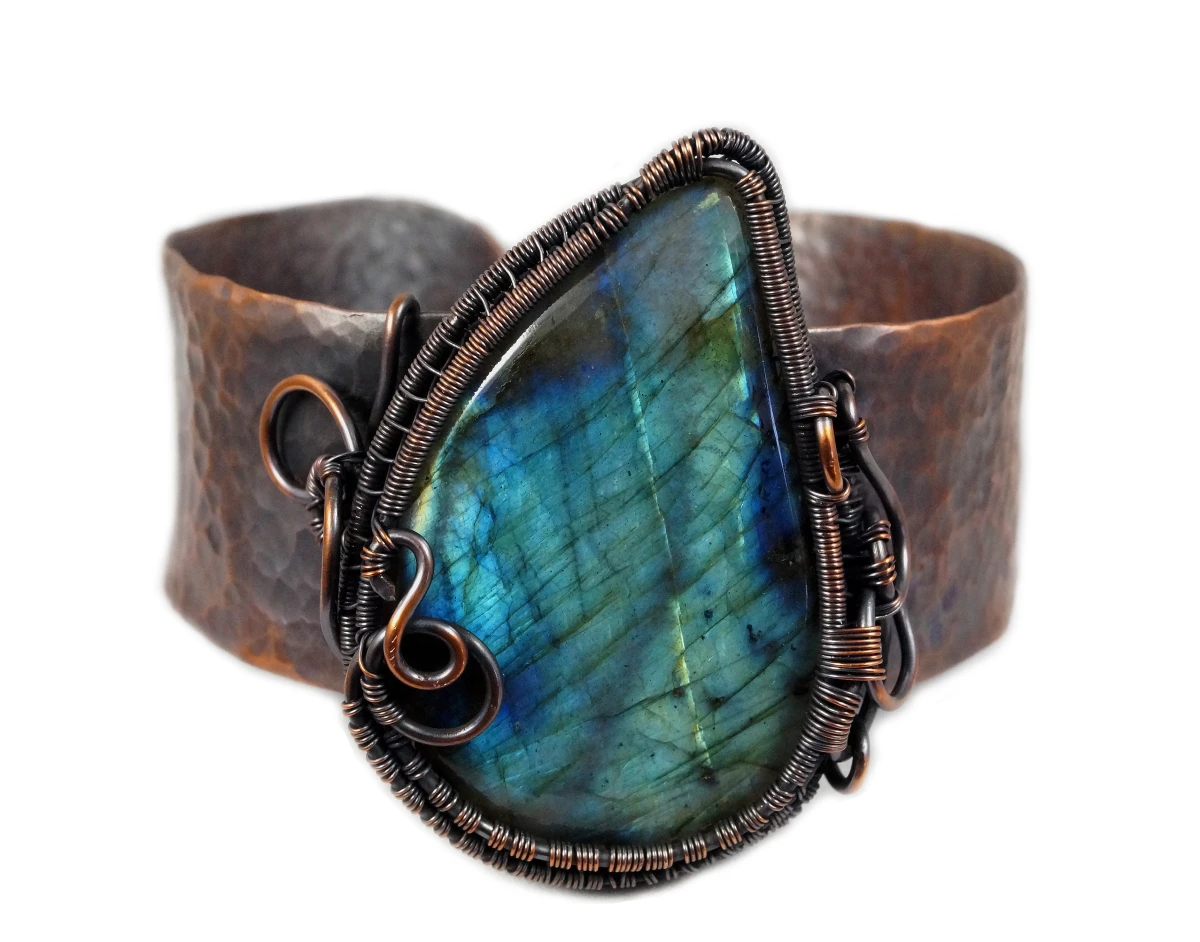 Bajeczna, misternie wykonana bransoletka z patynowanej miedzi z kaboszonem labradorytu w zielono niebieskim kolorze. Bransoletka wykonana z młotkowanej miedzi i z kaboszonu labradorytu osadzonego w technice wire wrapping. Bransoletka regulowana. Miedz młotkowana, patynowana polerowana i przecierana.