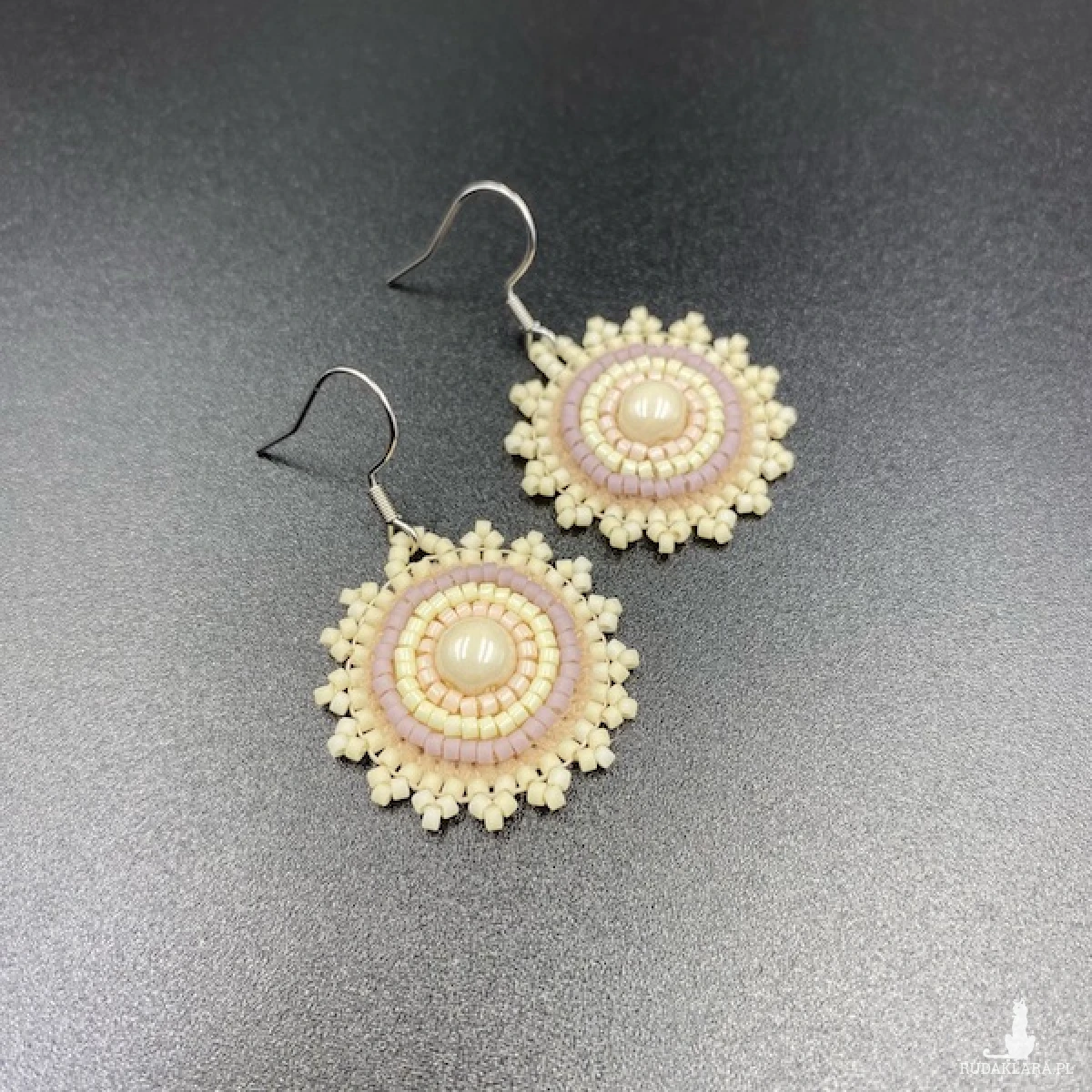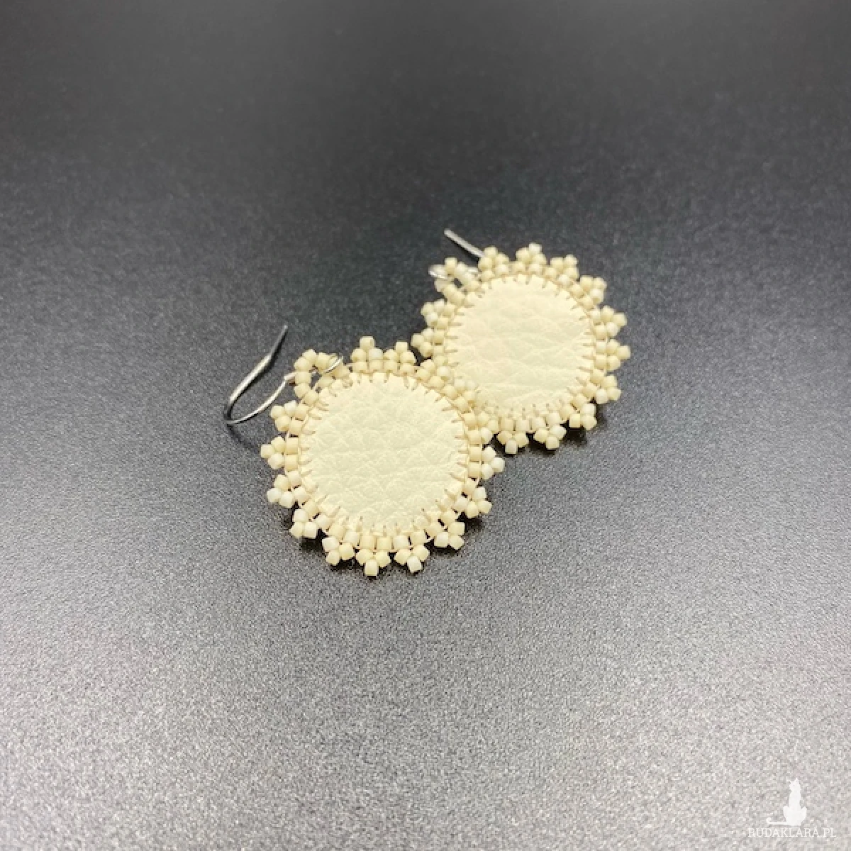 Okrągłe, małe kolczyki wykonane zostały techniką haftu koralikowego z drobnych koralików Miyuki, w 100% wyszyte ręcznie. Spód kolczyków podszyty jest kremową eko skórką. Bigle otwarte ze stali chirurgicznej.