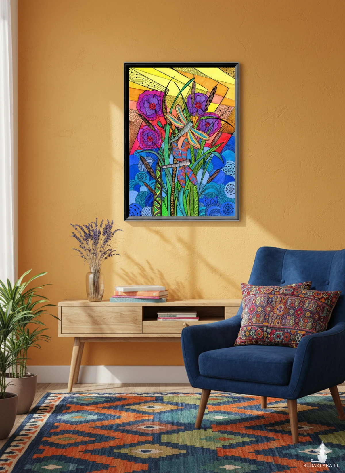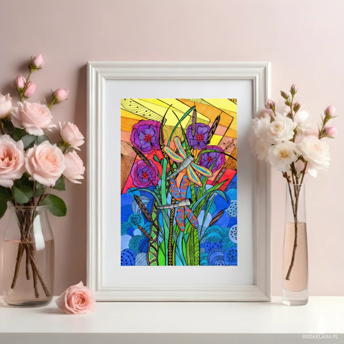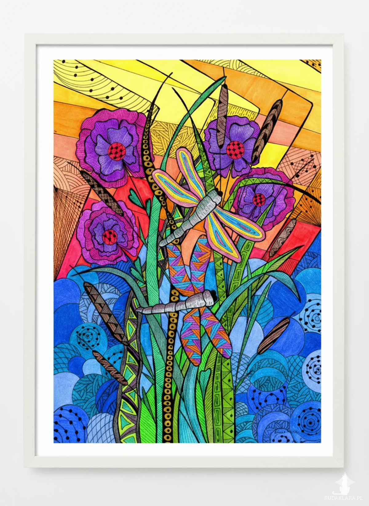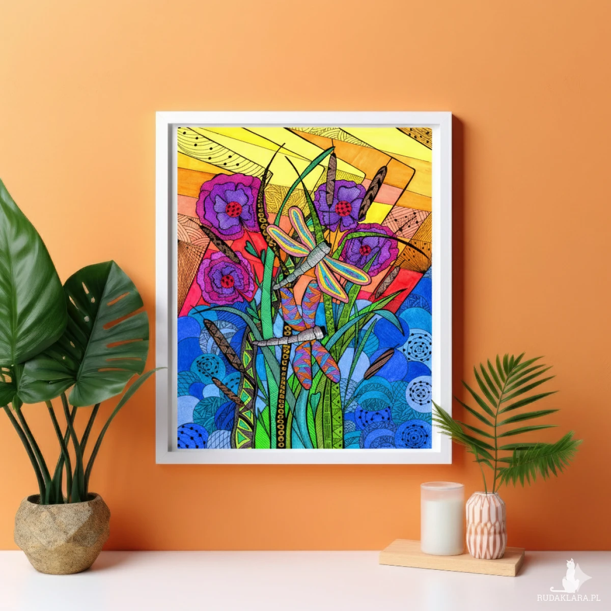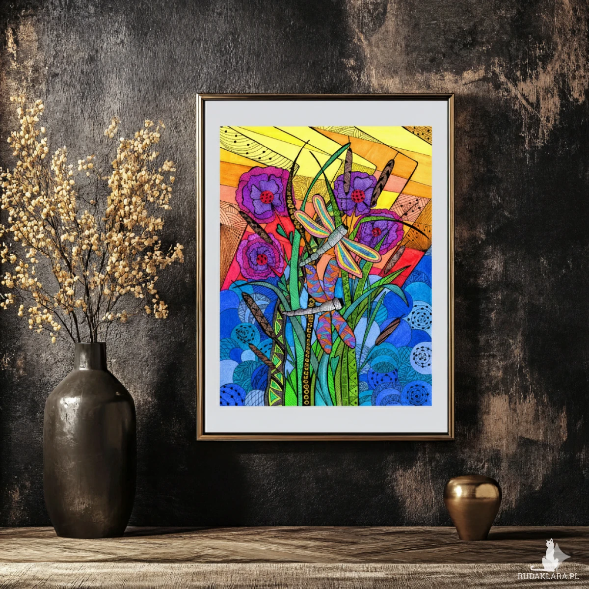 Intensywna, barwna ilustracja przedstawiająca scenę nad wodą. Kompozycja zdominowana jest przez bujne, stylizowane trzciny (pałki wodne), kwiaty o purpurowych płatkach oraz dwie geometrycznie stylizowane ważki o jaskrawo ubarwionych ciałach. Woda i niebo (tło) są wypełnione gęstymi, hipnotycznymi wzorami liniowymi (spirale, linie, zygzaki) w odcieniach błękitu, żółci i czerwieni, co nadaje całości wibrujący, psychodeliczny charakter, symbolizujący dynamiczne, eteryczne życie.
