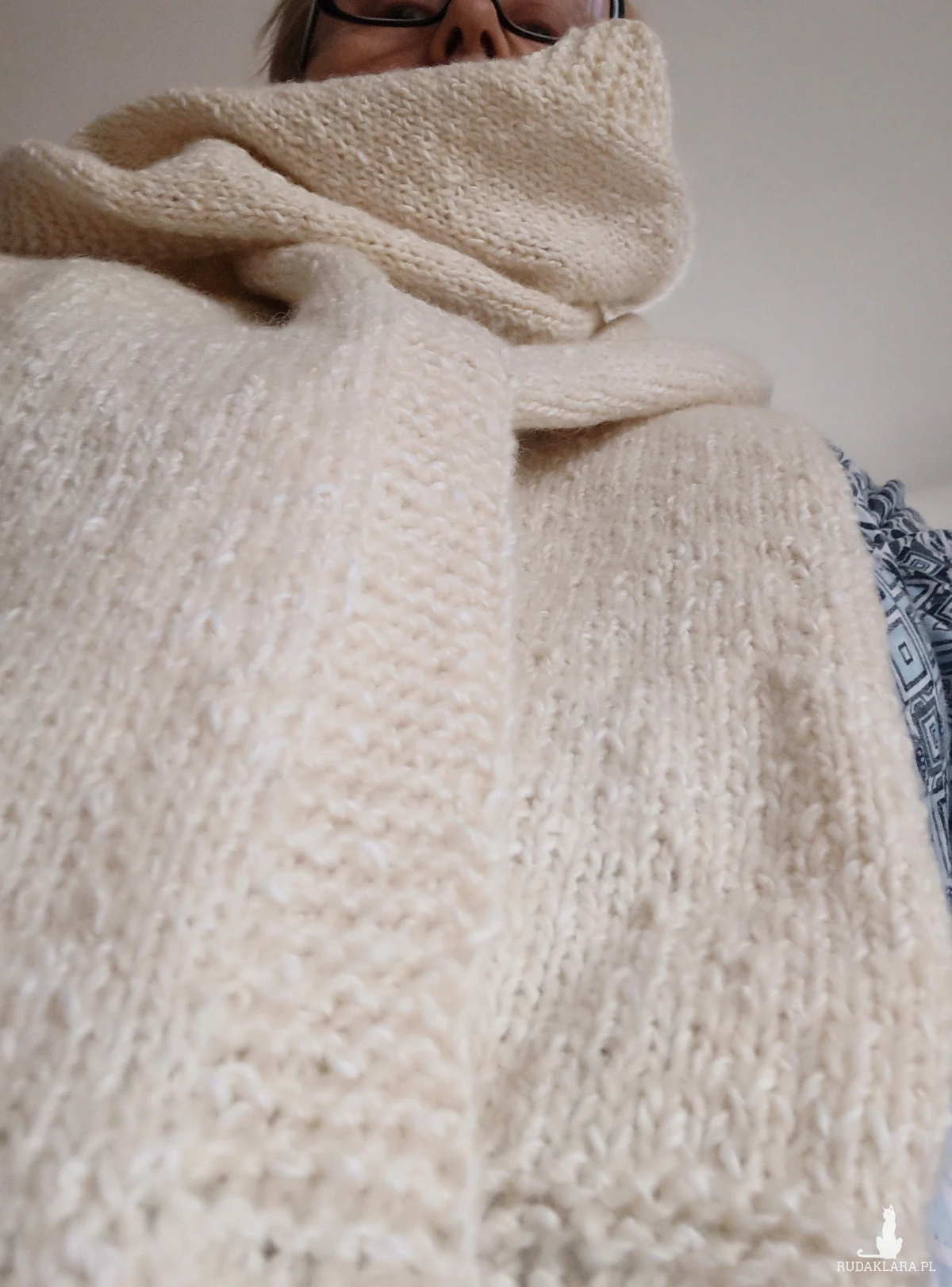 Bardzo obszerny i długi biały szal wykonany na drutach z wełny. Dekoracyjny wykonany tak, że obydwie strony są inne. Jedna strona oczka prawe druga strona oczka lewe. Cały wyrób zmyka pliska wykonana ściegiem francuskim. Bardzo skutecznie chroni przed zimnem ze względu na swoje wymiary oraz nić wełnianą, z której został wykonany. Z pewnością dobrze przepuszcza powietrze. Nie gryzie. Pranie ręczne. Polecam!