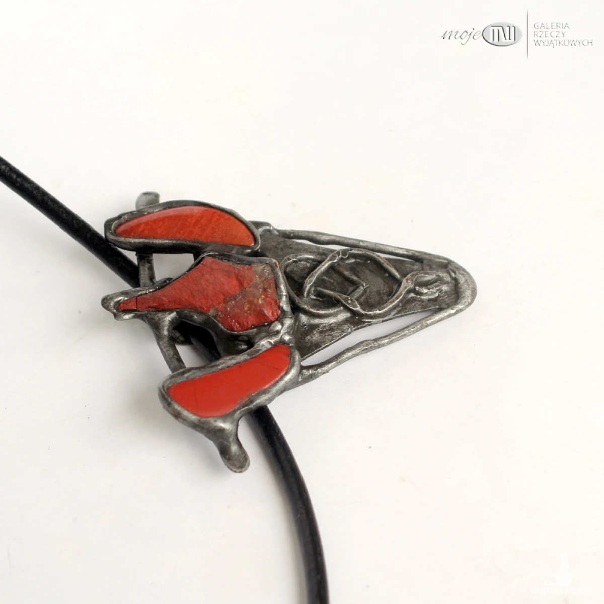 Męski naszyjnik z zawieszką w trójkątnym kształcie. Główną jego ozdobą są czerwone jaspisy - jeden surowy i dwa wygładzone. Całość zrobiona jest z miedzi - pokrytej cyną i patynowanej, potem przetartej dla wydobycia zdobień nawiązujących do celtyckiej plecionki. Wisior zawieszony jest na czarnym skórzanym rzemieniu o gr. 3 mm i długości ok 50 cm