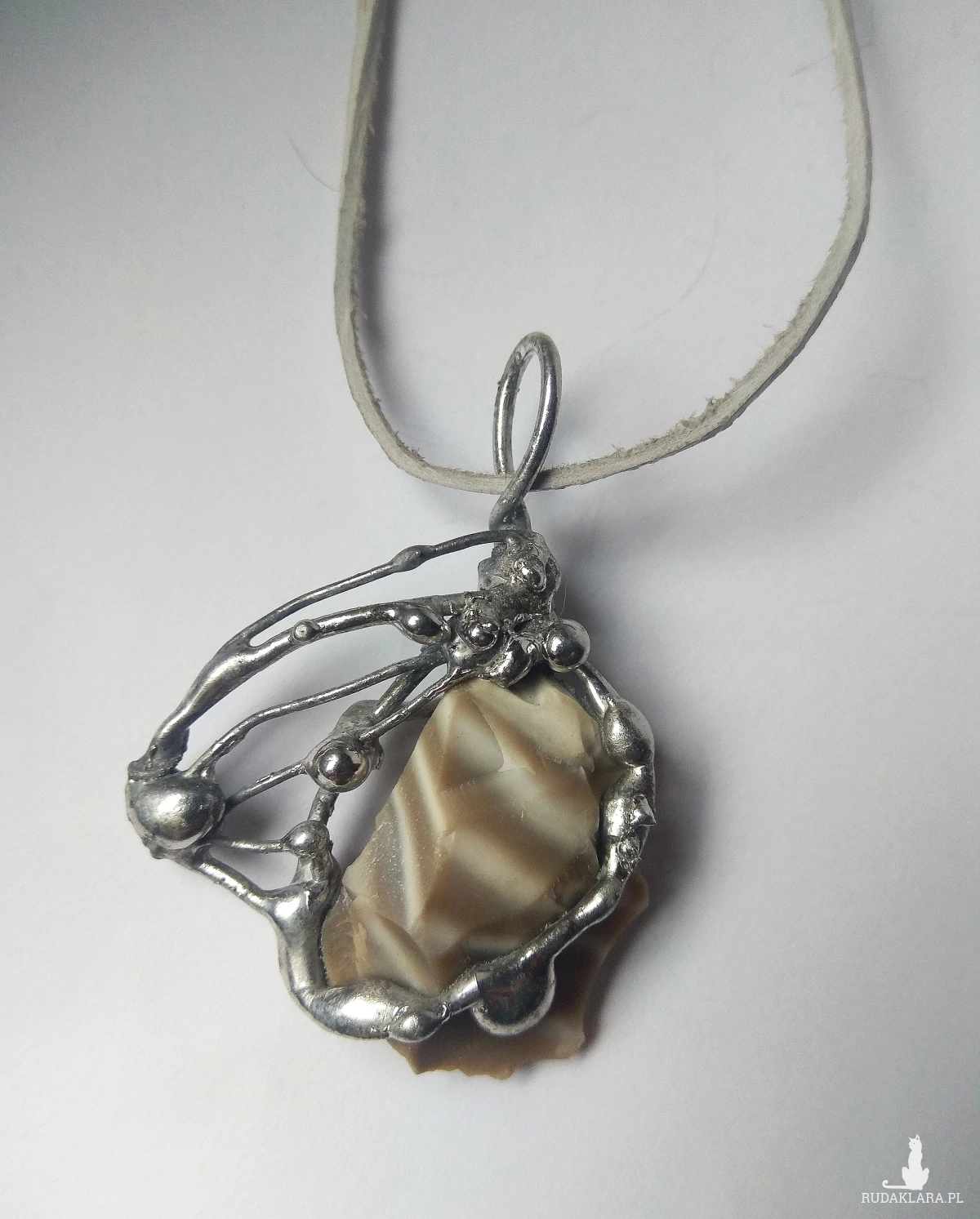 Naszyjnik z krzemieniem pasiastym, oprawa cynowa na miedzianym