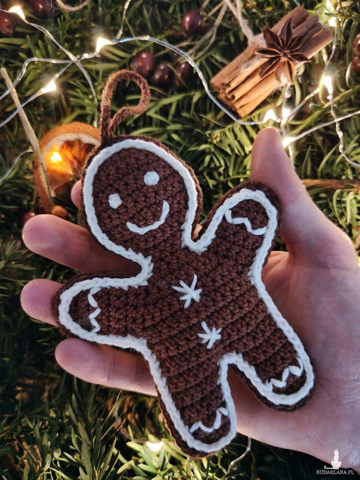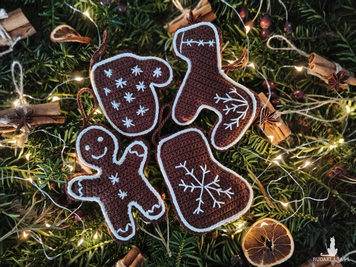 Cztery szydełkowe zawieszki w kształcie pierniczków będą nietuzinkową dekoracją każdej choinki.