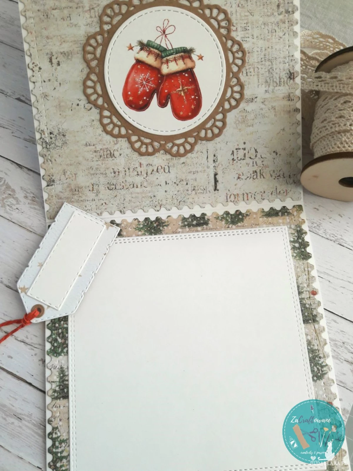 Wnętrze i tył kartki także zostały ozdobione. Śnieżynki są wycięte z kremowego papieru z delikatnym perłowym połyskiem. Grafika jest wykończona preparatem szklącym i brokatem, dzięki czemu całość, mimo naturalnego wyglądu, będzie się pięknie mienić w blasku światełek choinki.