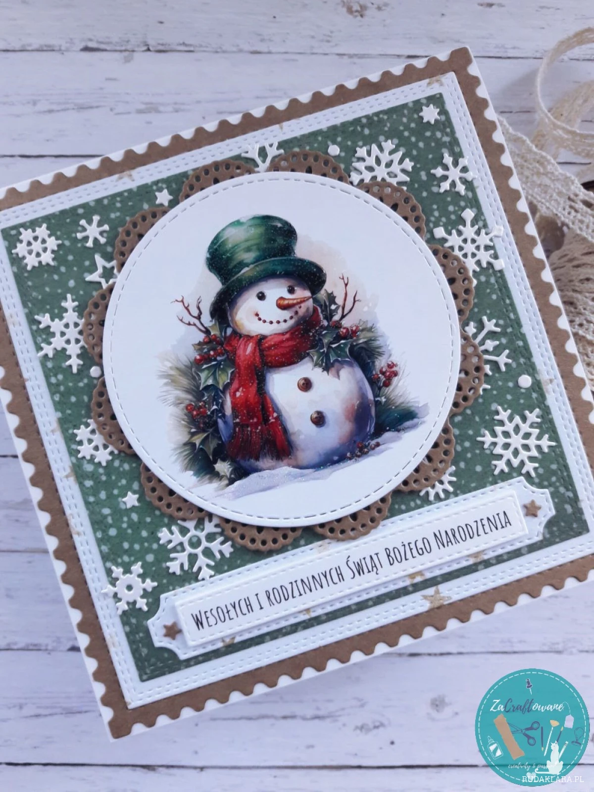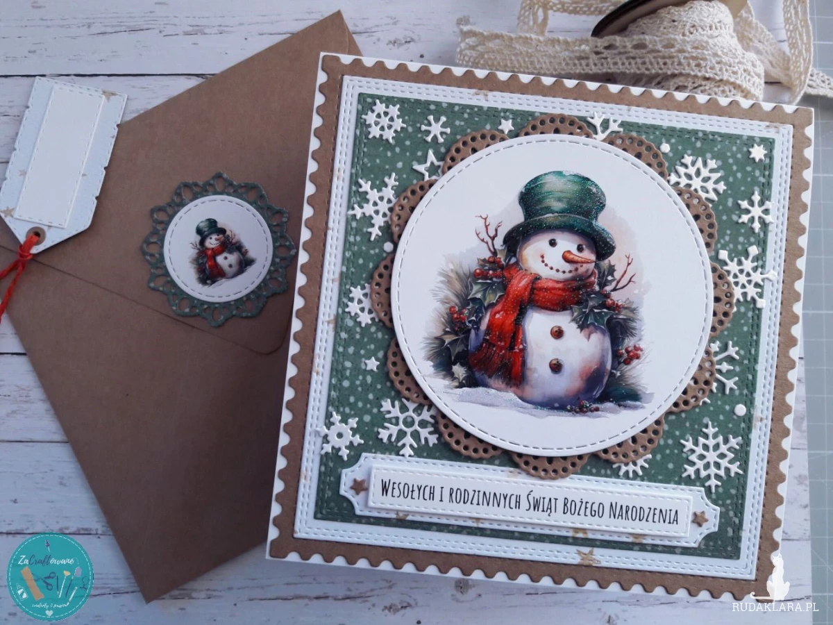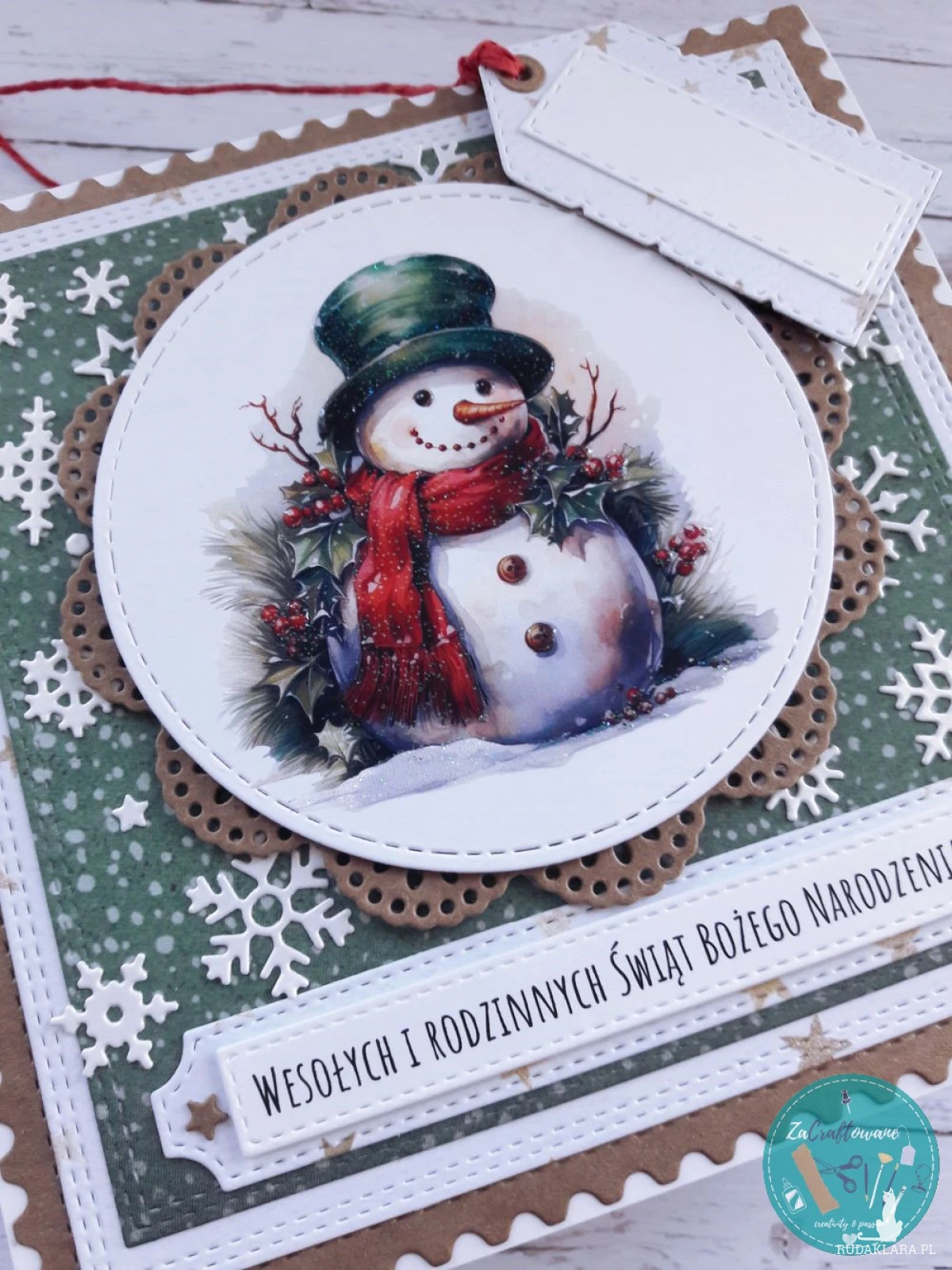 Kartka bożonarodzeniowa z bałwankiem wykonana metodą scrapbookingu z wykorzystaniem profesjonalnych materiałów i z dbałością o każdy szczegół.