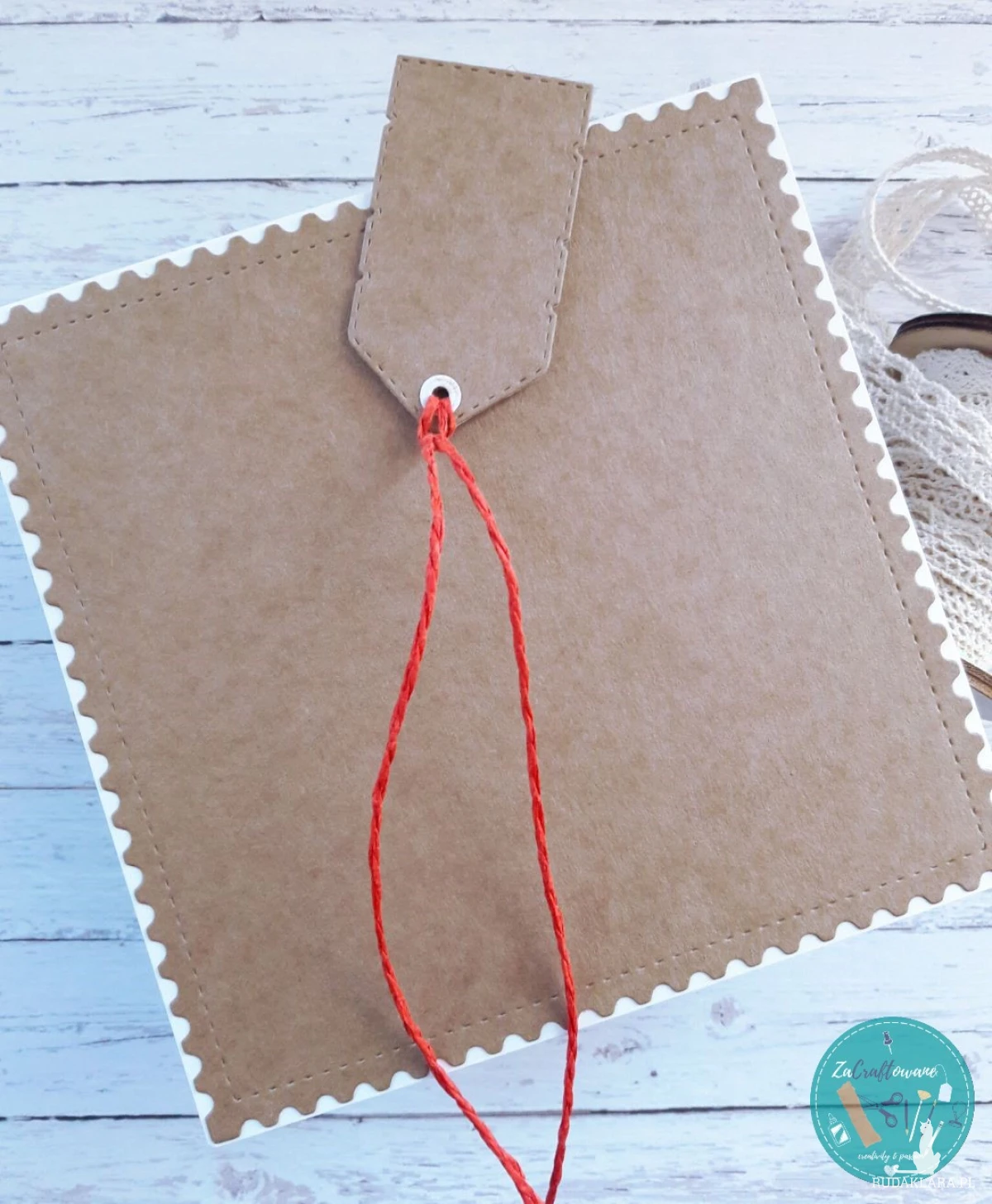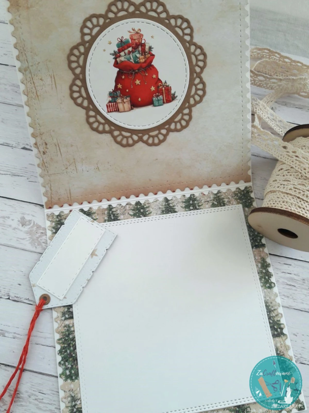 Do kartki dołączam GRATIS w postaci widocznej na zdjęciu etykietki, za pomocą której można podpisać prezent dla osoby obdarowywanej świątecznym upominkiem i przyczepić ją do wstążki, którą obwiązany jest podarunek, za pomocą sznureczka, który również znajduje się w zestawie.