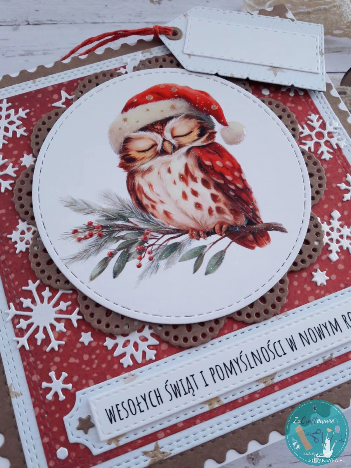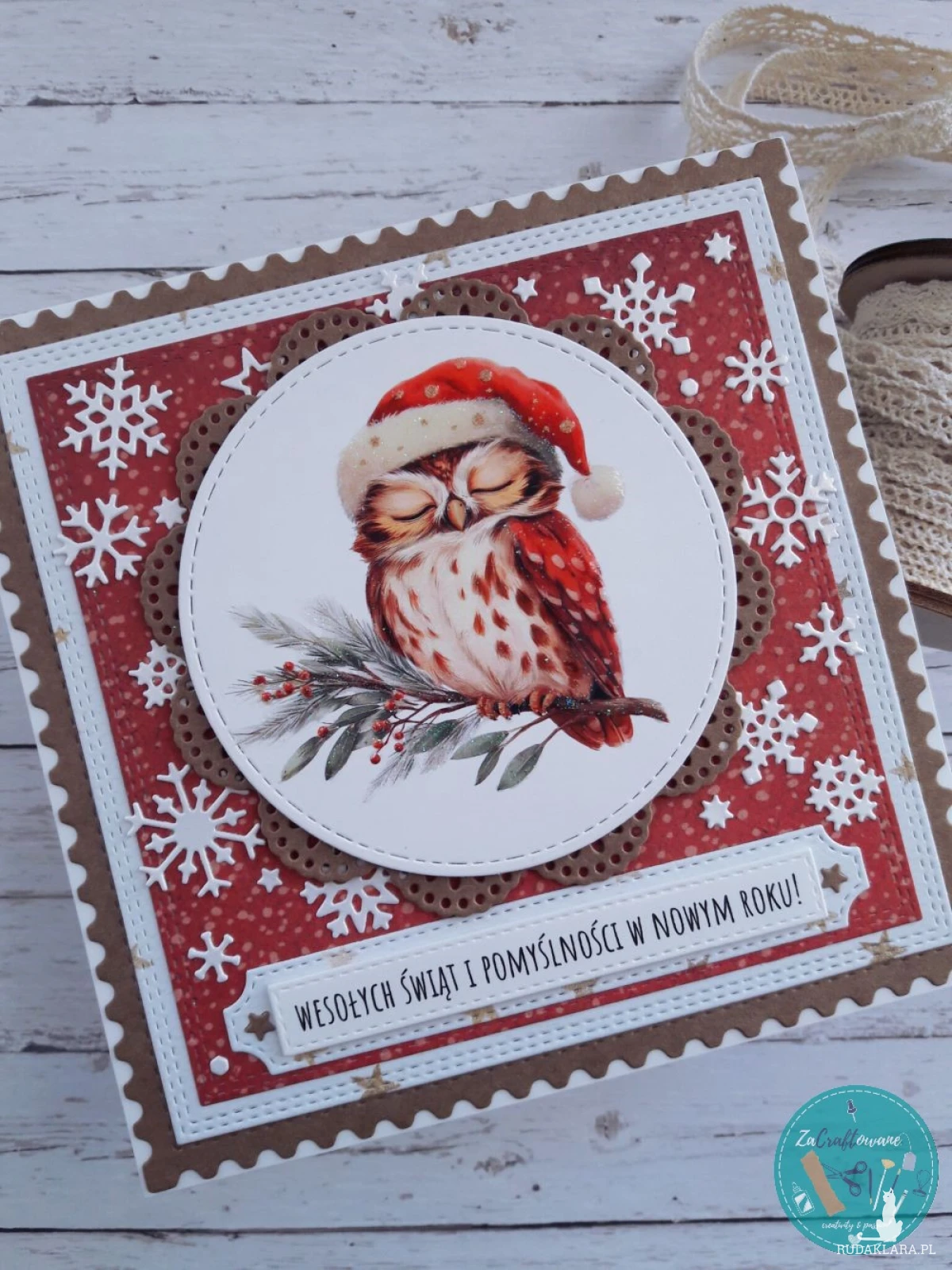 Kartka bożonarodzeniowa z sową wykonana metodą scrapbookingu z wykorzystaniem profesjonalnych materiałów i z dbałością o każdy szczegół.