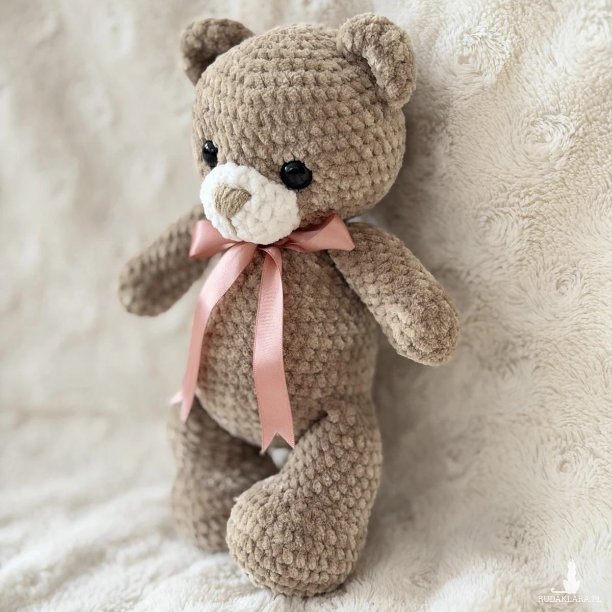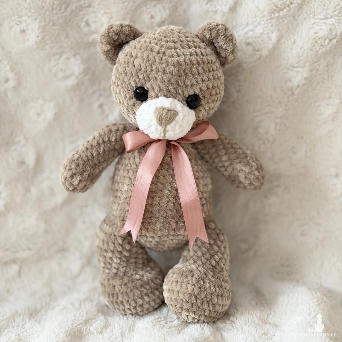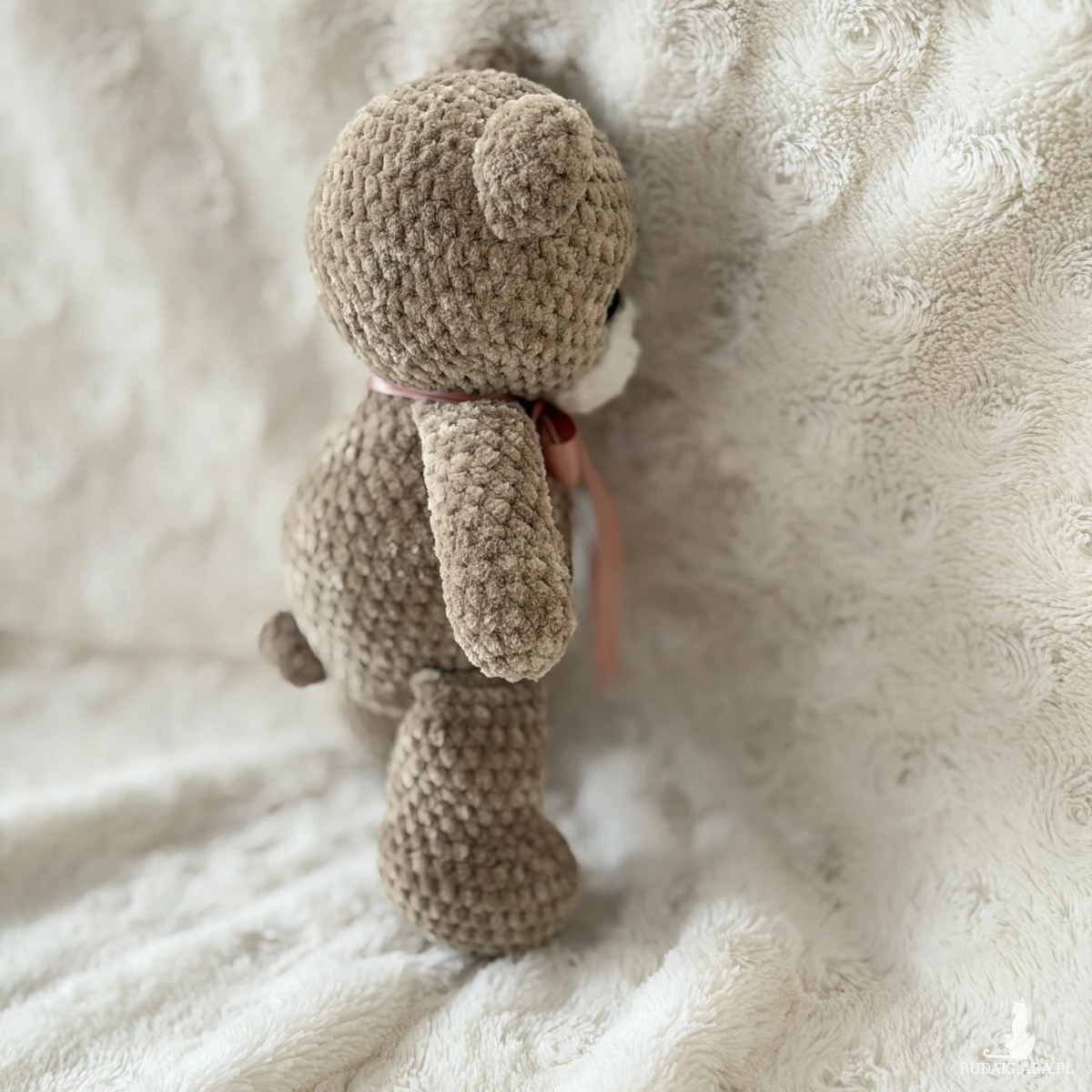 Ma delikatną, pudrowo-różową kokardkę, która dodaje mu subtelnego uroku. To idealny prezent dla dziecka, dekoracja pokoju lub słodki towarzysz do tulenia.