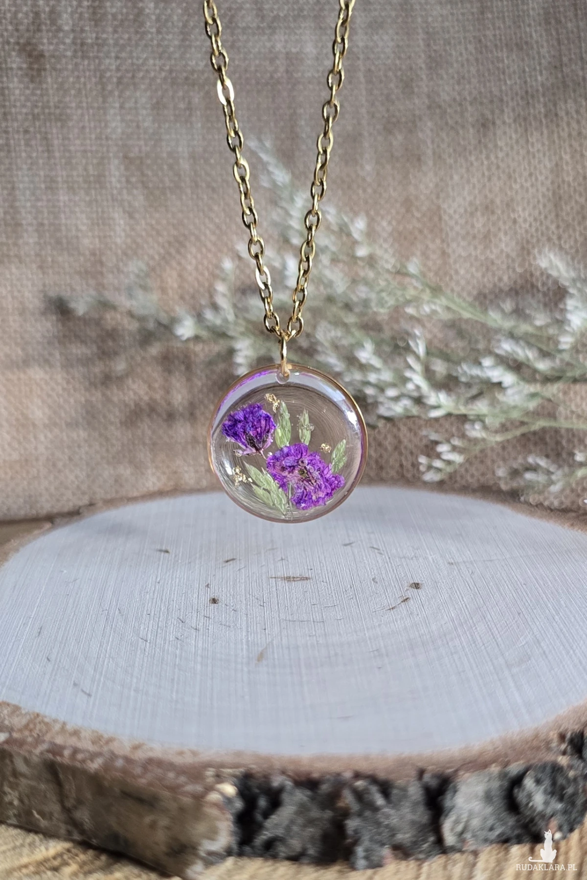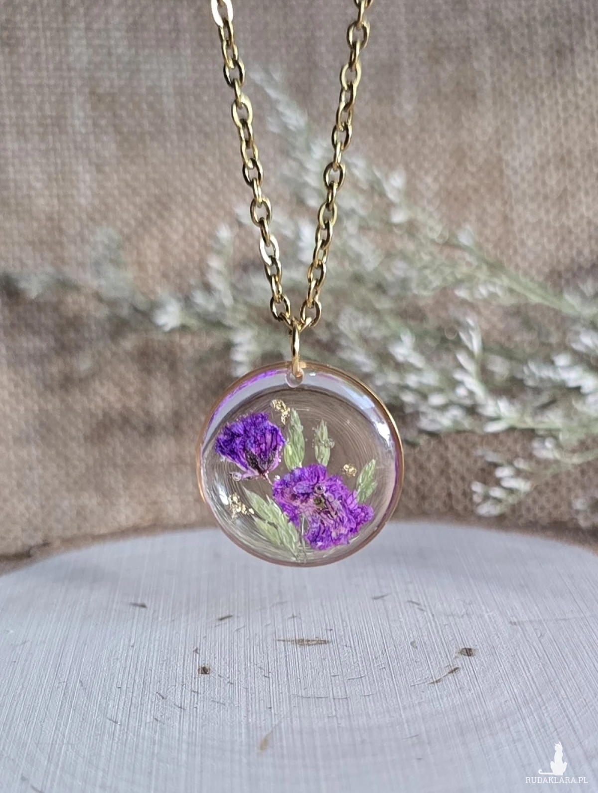 Oferuję Państwu unikalną biżuterię. Zawieszka jest wykonana z suszonych kwiatów i żywicy epoksydowej. Biżuteria jest wspaniałym i oryginalnym prezentem na lata.