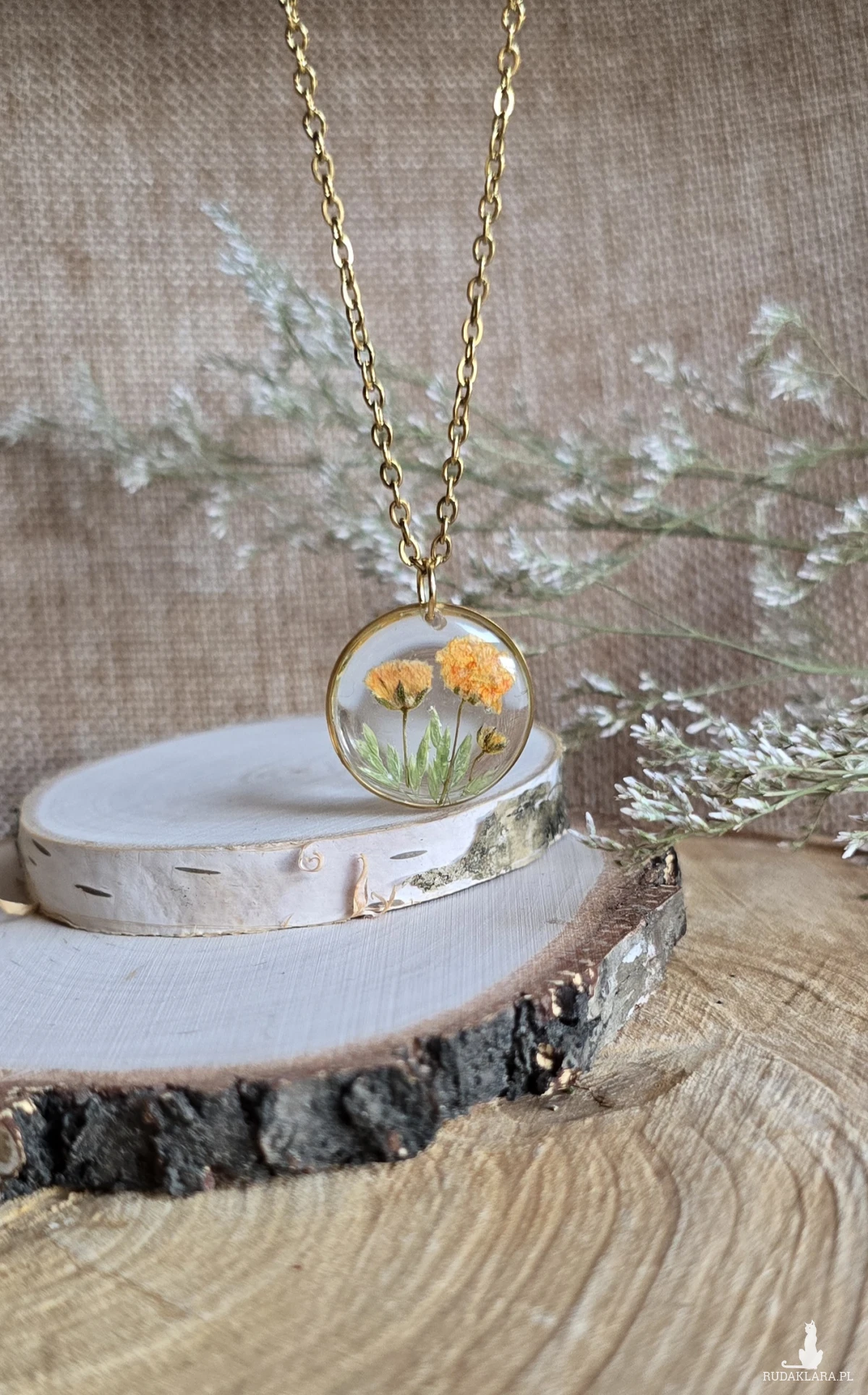 Oferuję Państwu unikalną biżuterię. Zawieszka jest wykonana z suszonych kwiatów i żywicy epoksydowej. Biżuteria jest wspaniałym i oryginalnym prezentem na lata.