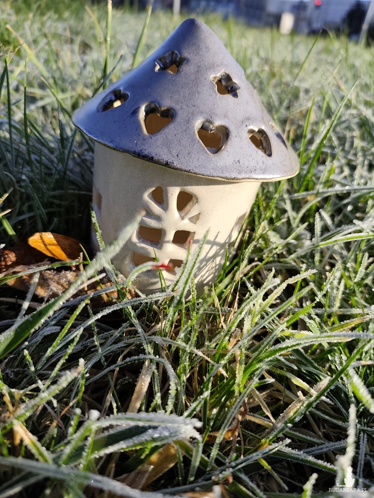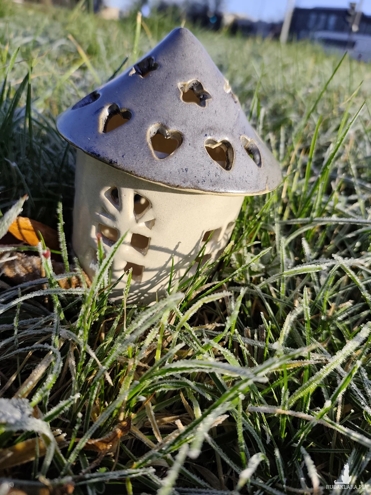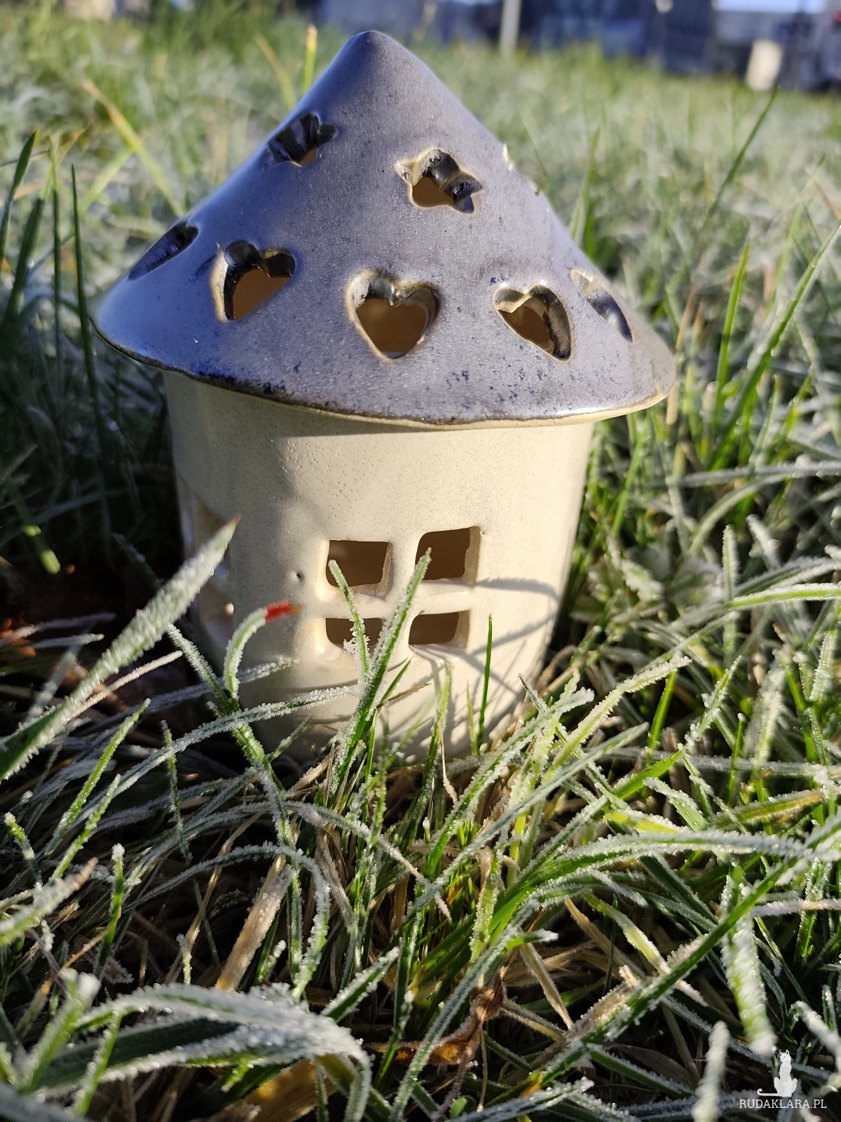 Lampiony domki na świece ceramiczne, szkliwione i dwukrotnie wypalane w piecu ceramicznym na wysoką temperaturę. Wysokość z daszkiem około 14 cm. Nie nadają się na zewnątrz, zdjęcie robione na trawie bo urzekło mnie piękno oszronionego trawnika. Polecam