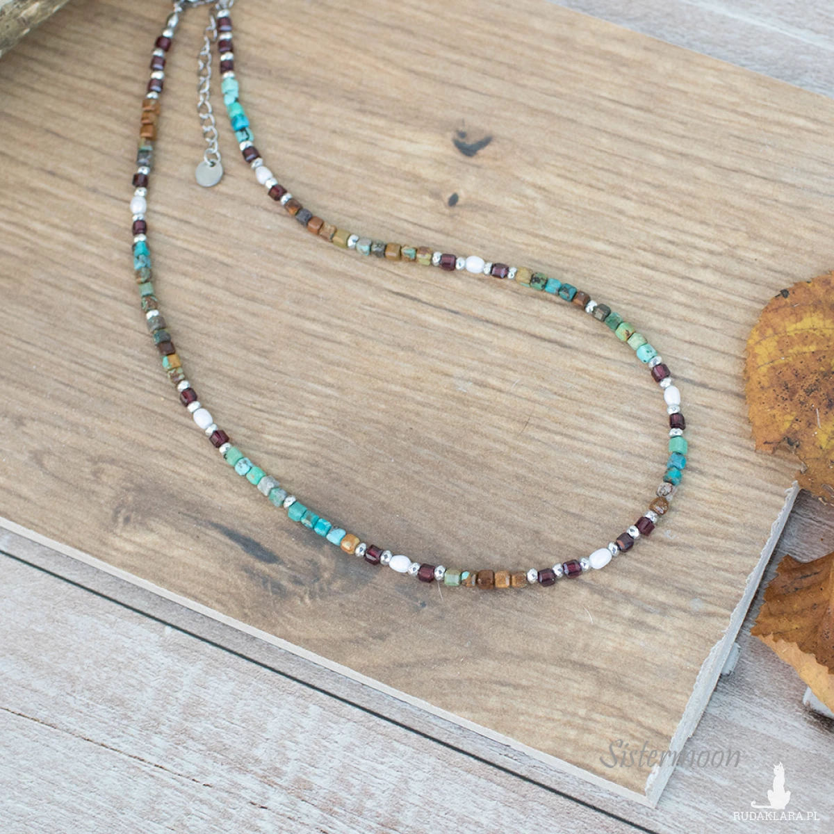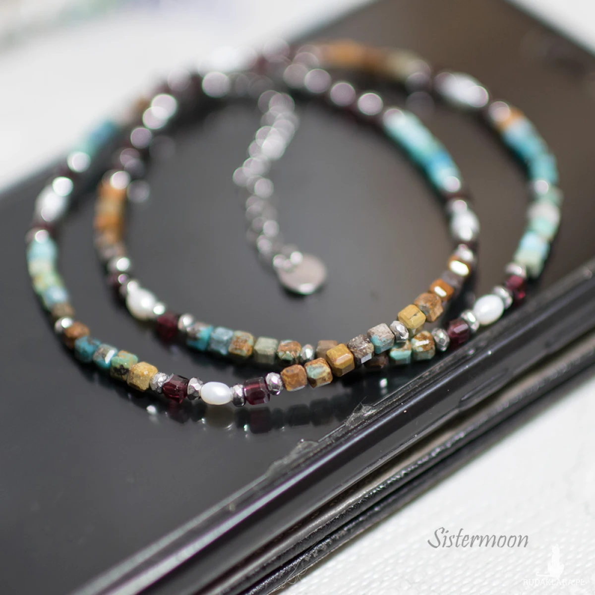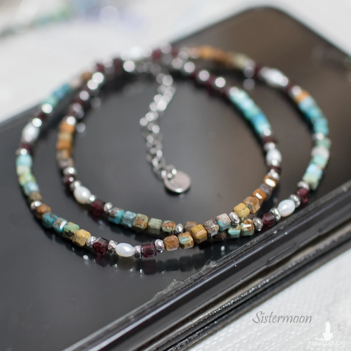 Wykonanie: Elementy wysokiej jakości ze stali szlachetnej, białe perełki rzeczne, prawdziwe turkusy, granaty, hematyty. Średnica minerałów 2-3 mm. Zapinanie na karabińczyk z łańcuszkową przedłużką. Długość: 38 cm plus 5 cm łańcuszek.
