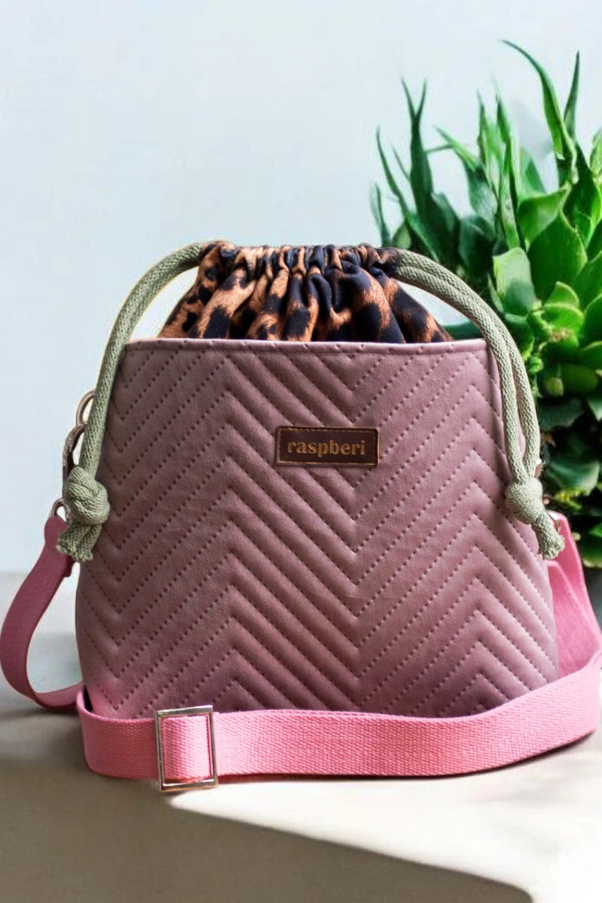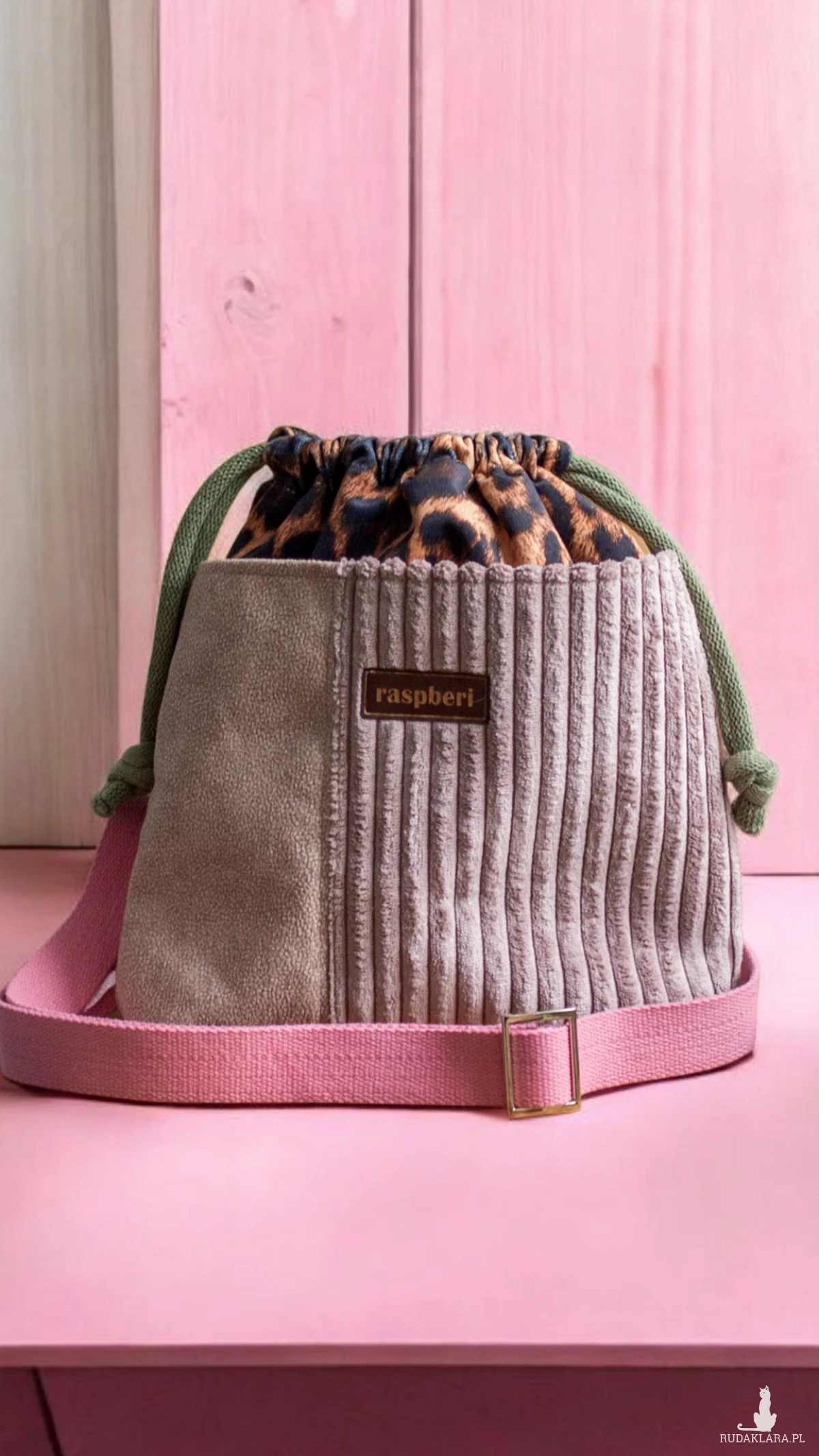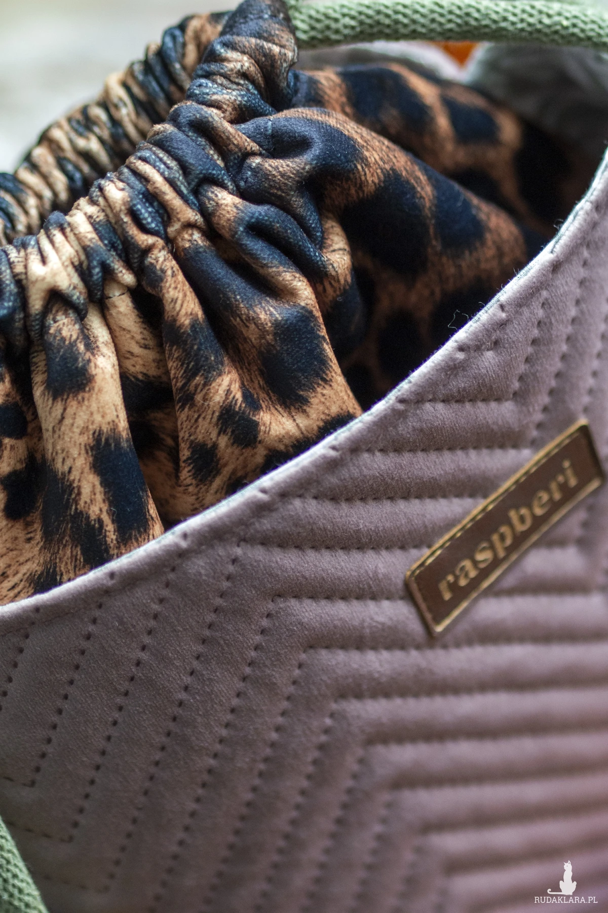Wykonana z weluru w panterkę. Z przodu oraz z na tyle torebki kieszenie (np. na telefon czy chusteczki) z pudroworóżowego pikowanego weluru. W środku kieszonka zapinana na suwak.