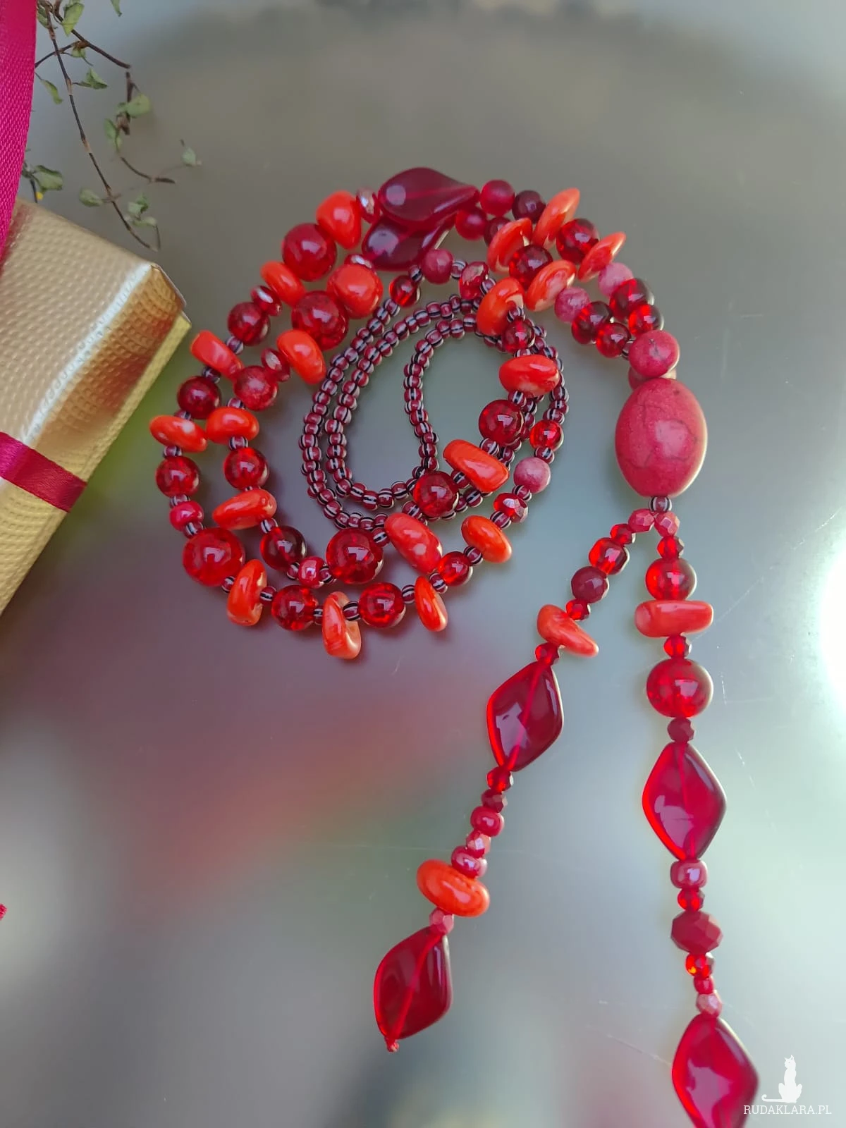 Naszyjnik długi z koralików. Mix koralików szklanych, howlit czerwony i koral czerwony bryłki, hematyt. Delikatny, efektowny naszyjnik. Bez zapięcia, przekładany przez głowę. Na sznurku syntetycznym czerwonym. Długość naszyjnika z frędzlami wynosi 48 cm @wszyscy