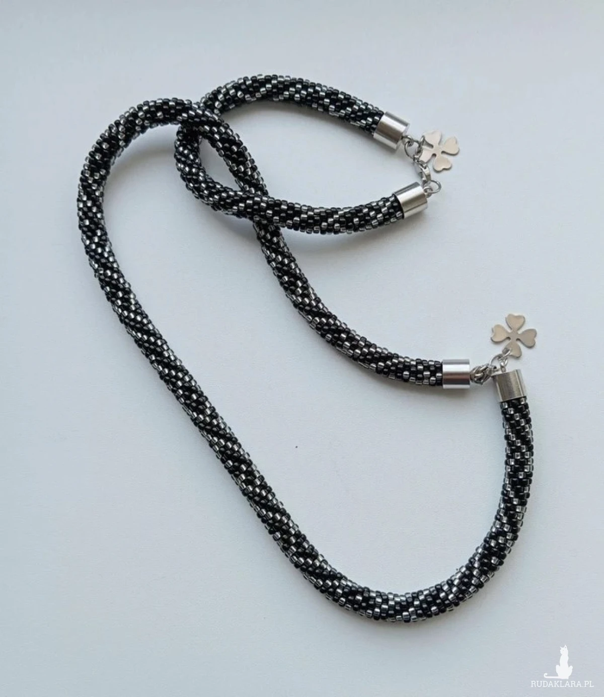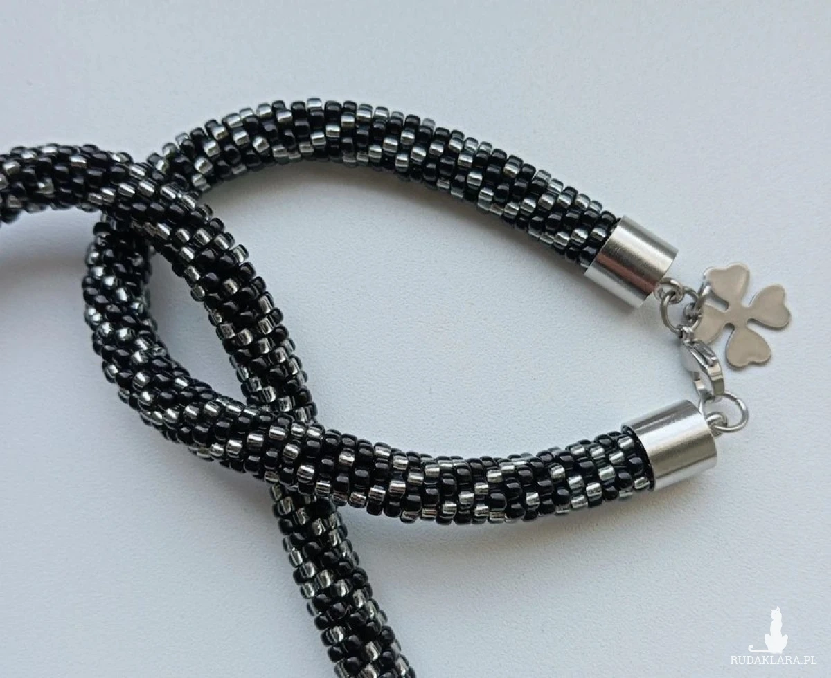Koralikowy srebrno-czarny komplet: naszyjnik i bransoletka ręcznie robione na szydełku z drobnych szklanych koralików. Długość naszyjnika 50,5 cm, bransoletki 21 cm. Zapięcia ze stali chirurgicznej, na życzenie mogę wstawić łańcuszki przedłużające naszyjnik i bransoletkę.