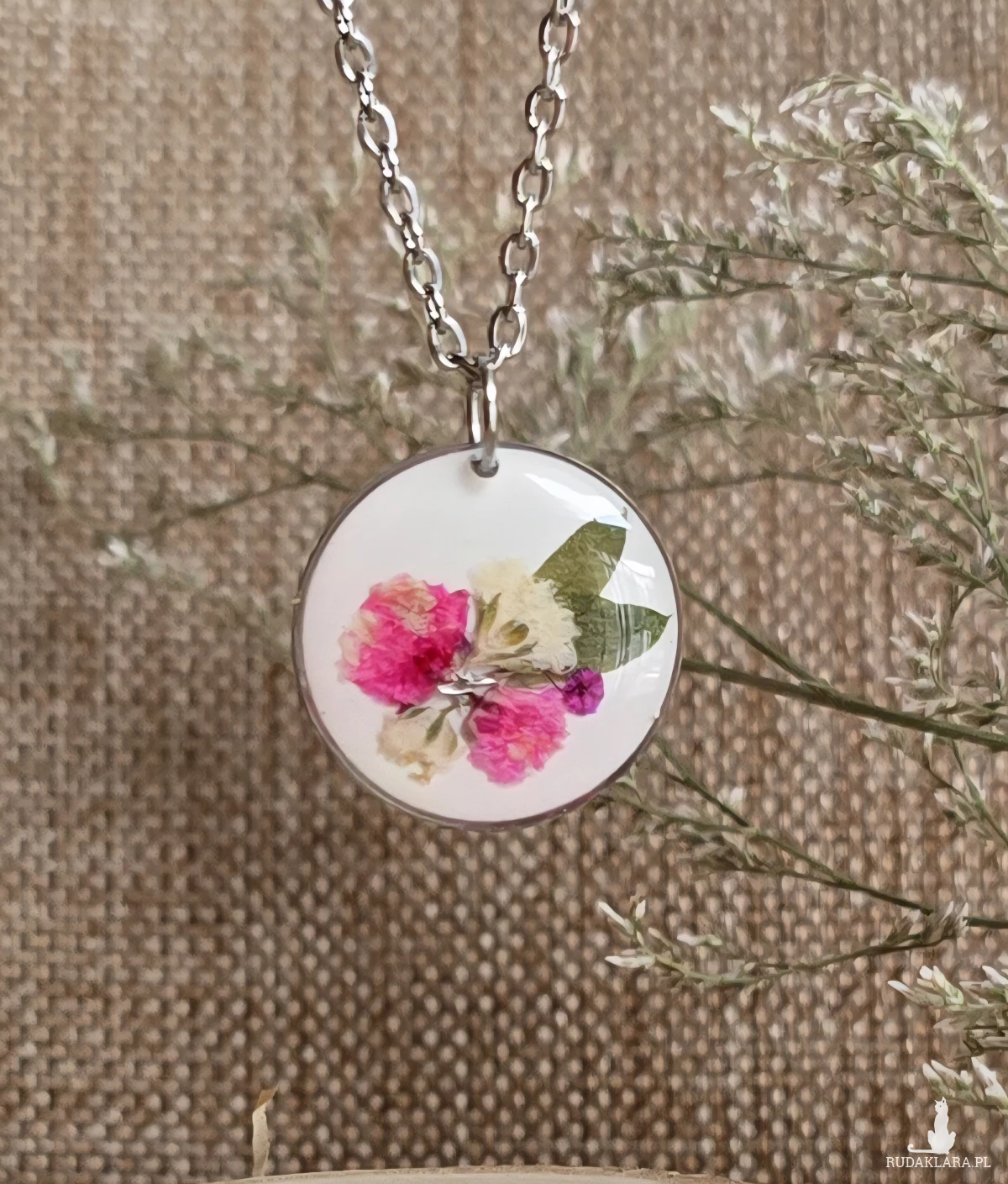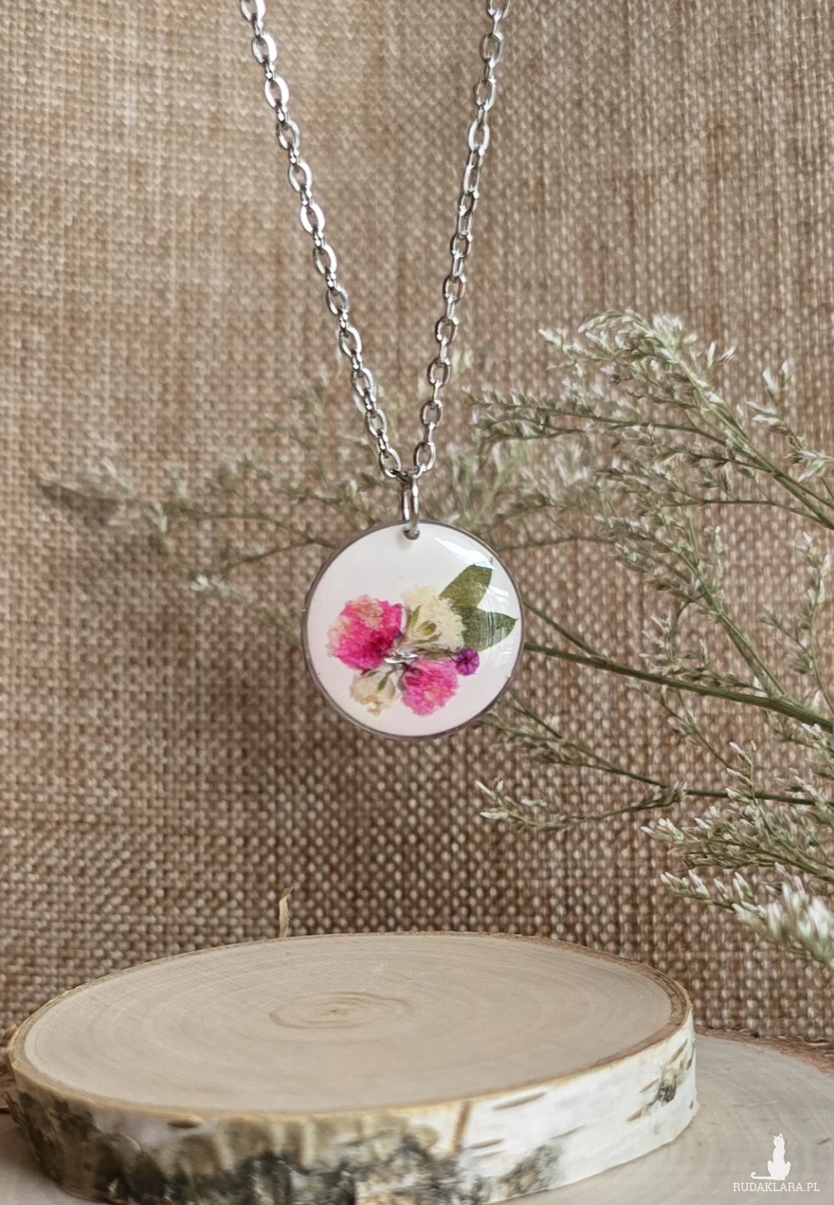 Oferuję Państwu unikalną biżuterię. Zawieszka jest wykonana z suszonych kwiatów i żywicy epoksydowej. Biżuteria jest wspaniałym i oryginalnym prezentem na lata.