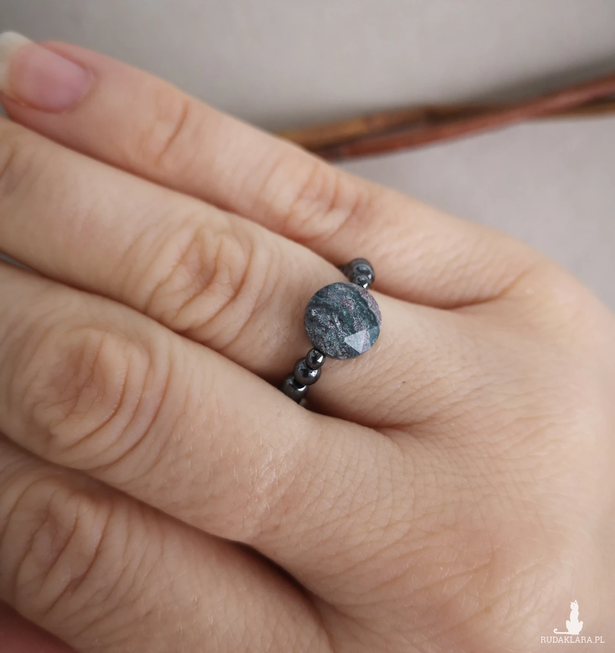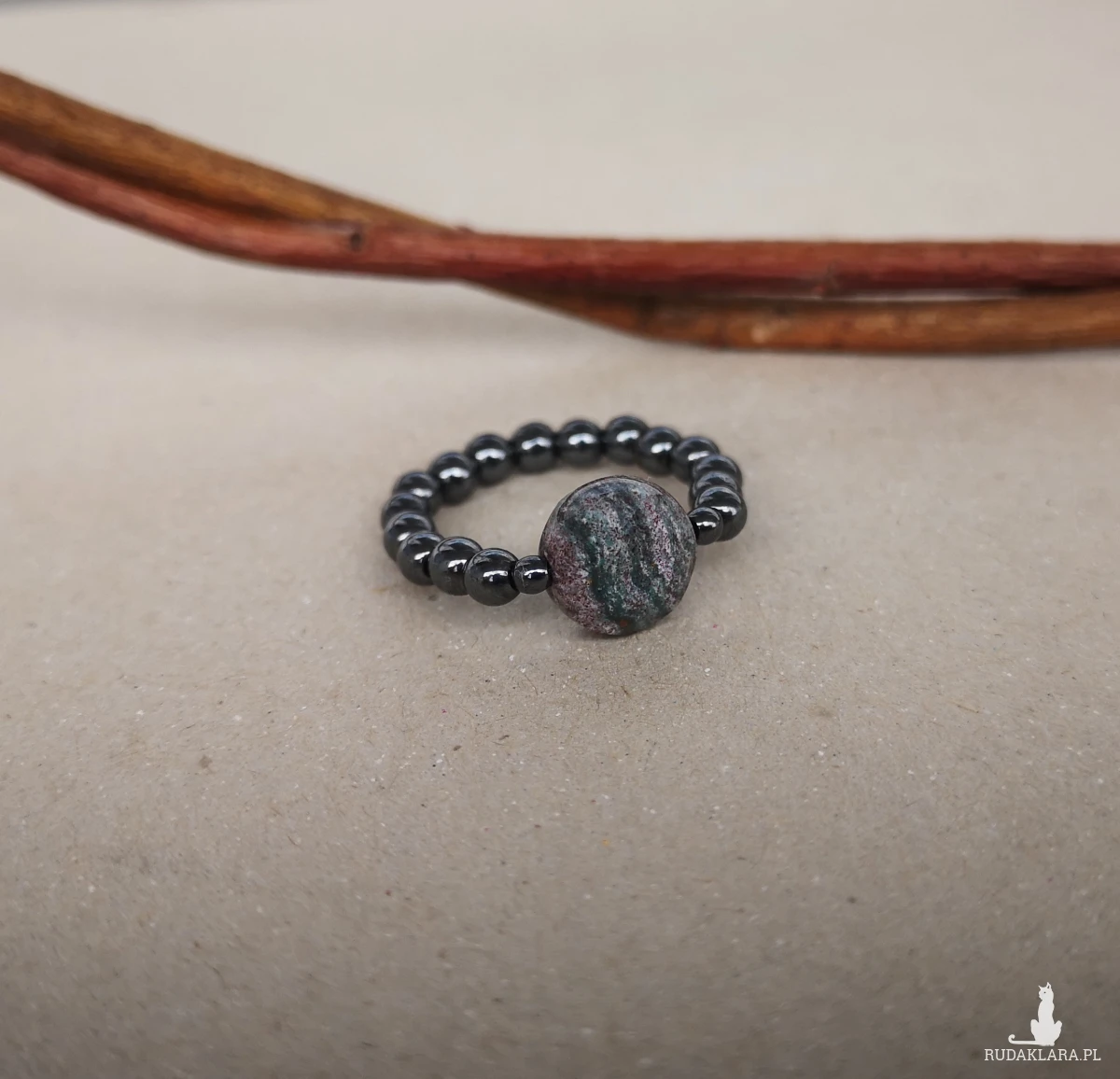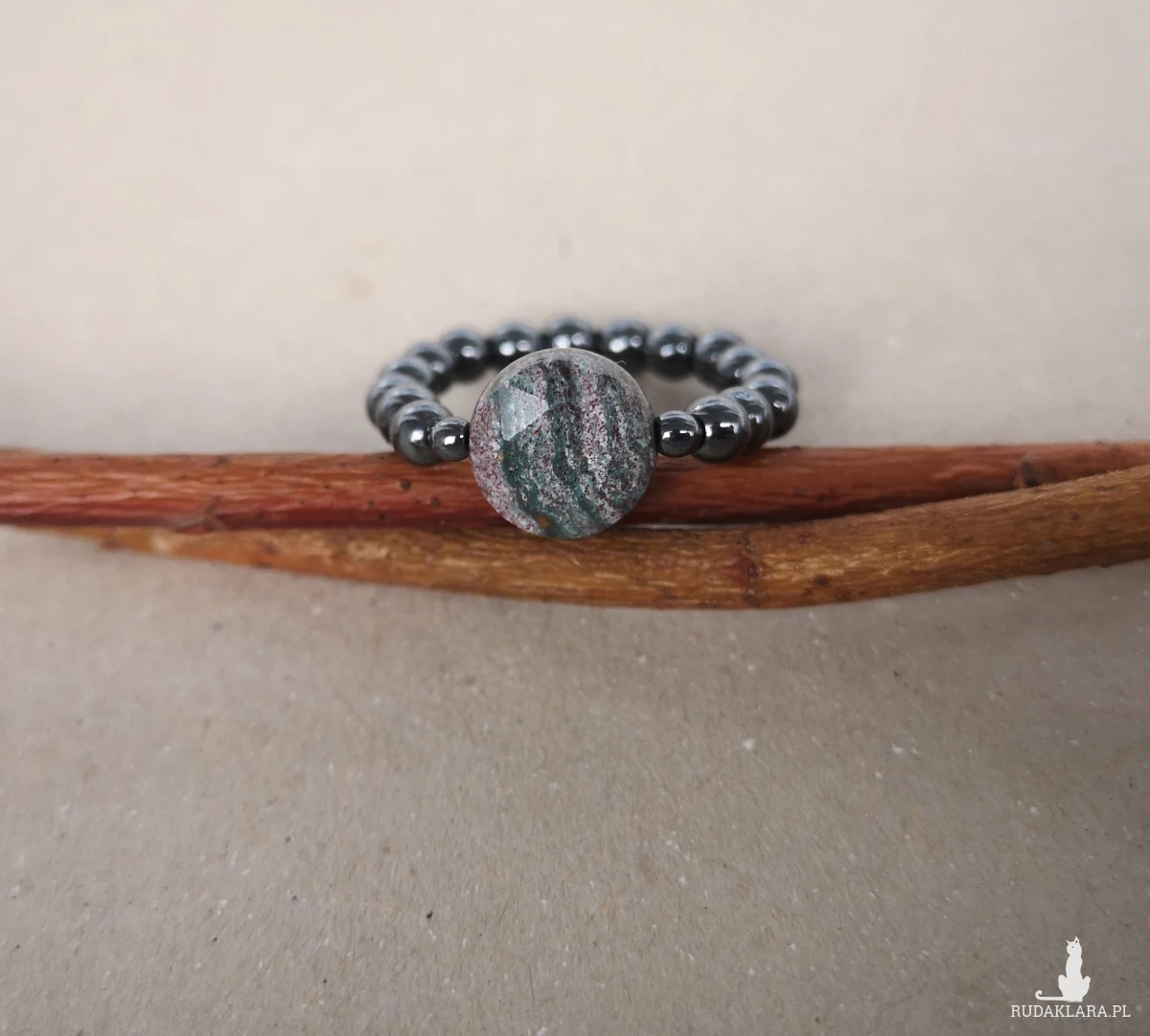 Pierścionek na gumce elastycznej, hematyt grafitowy i agat. Najlepszy na obwód palca 6 cm