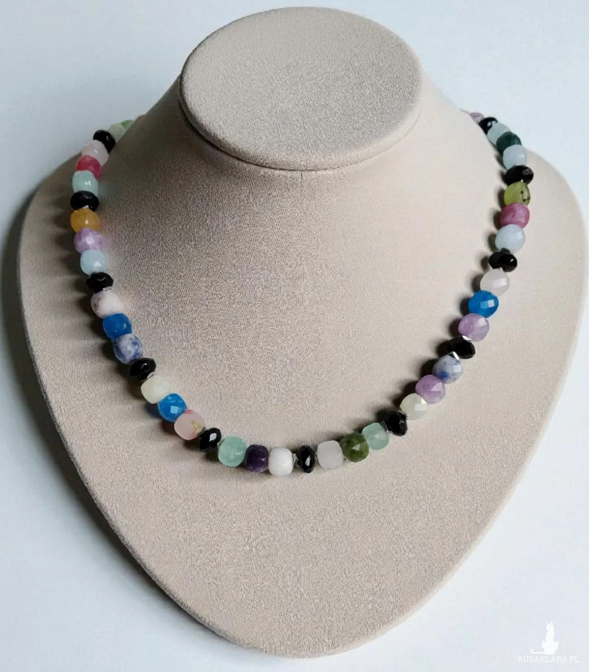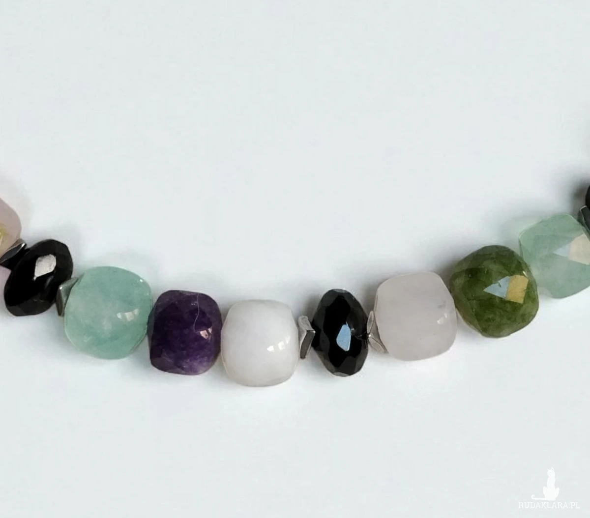 Naszyjnik wykonany z mixu fasetowanych kostek kamieni wielkości 8x8 mm przekładanych tej samej wielkości również fasetowanymi oponkami z onyksu oraz srebrzystymi hematytami. Elementy wykończenia oraz zapięcie ze stali szlachetnej. Długość 43 cm.