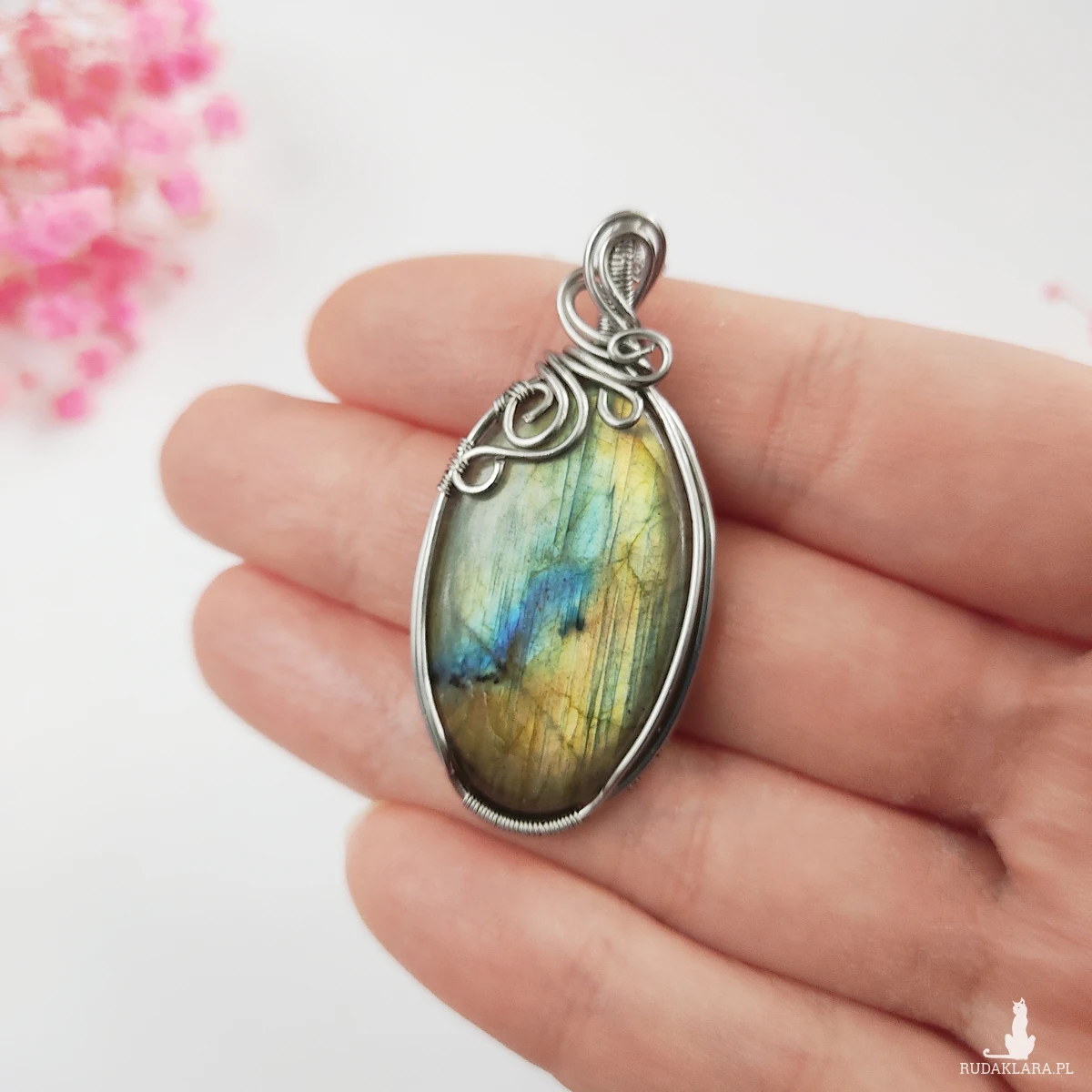 Naszyjnik Labradoryt Owal ręcznie wykonany z drutów ze stali chirurgicznej metodą wire wrapping.