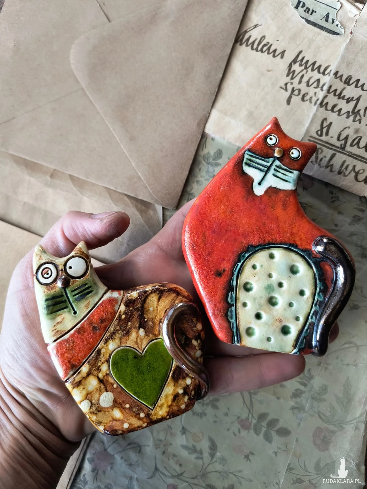 Figurki kotów do postawienia o wymiarach ok 8 cm x 10 cm większy oraz 7,5 c, x 98 cm mniejszy, wykonane z ceramiki. Polecam serdecznie.