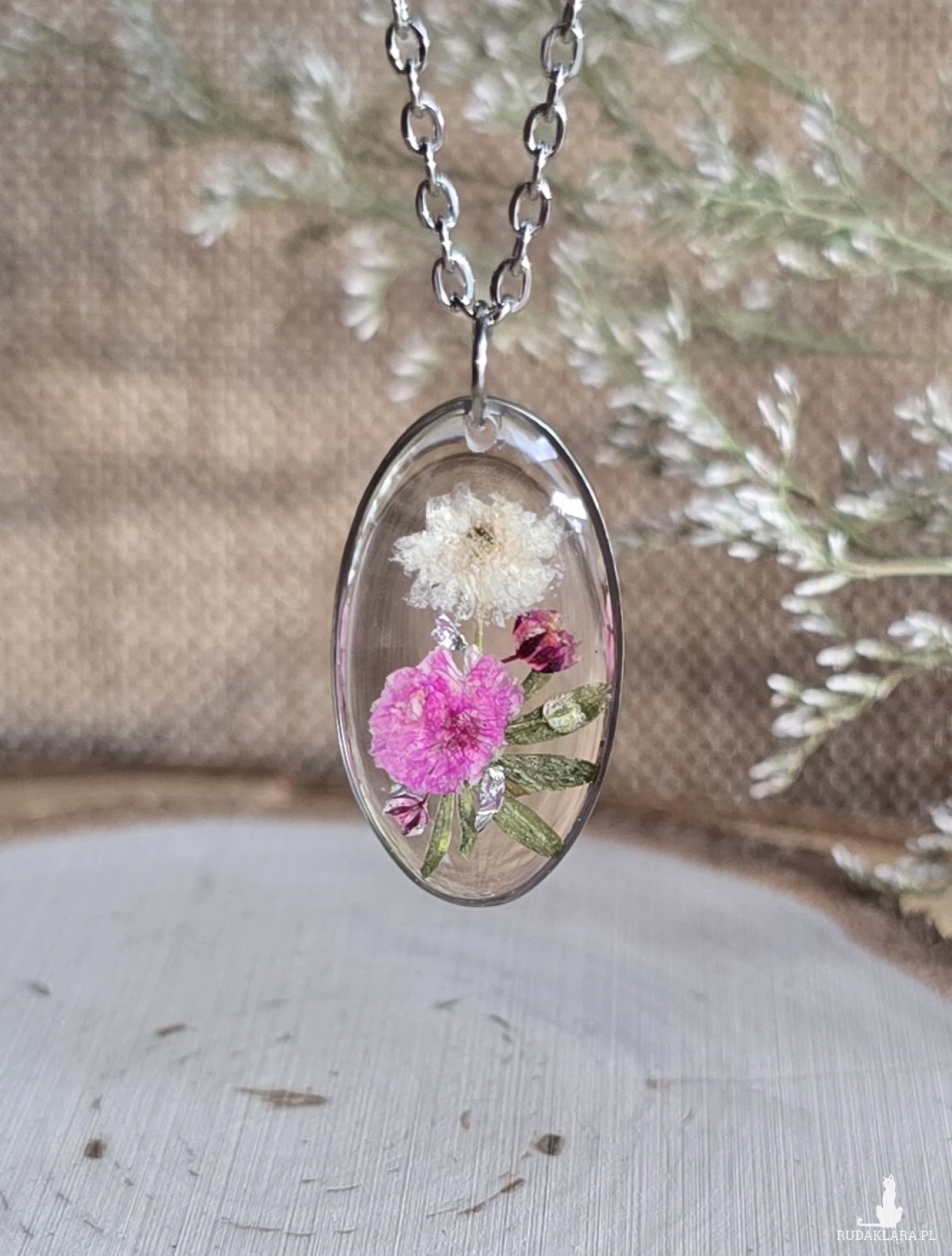 Oferuję Państwu unikalną biżuterię. Zawieszka jest wykonana z suszonych kwiatów i żywicy epoksydowej. Biżuteria jest wspaniałym i oryginalnym prezentem na lata.