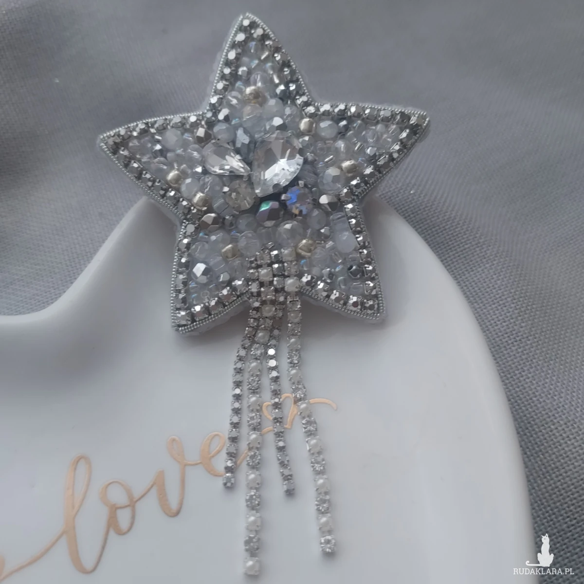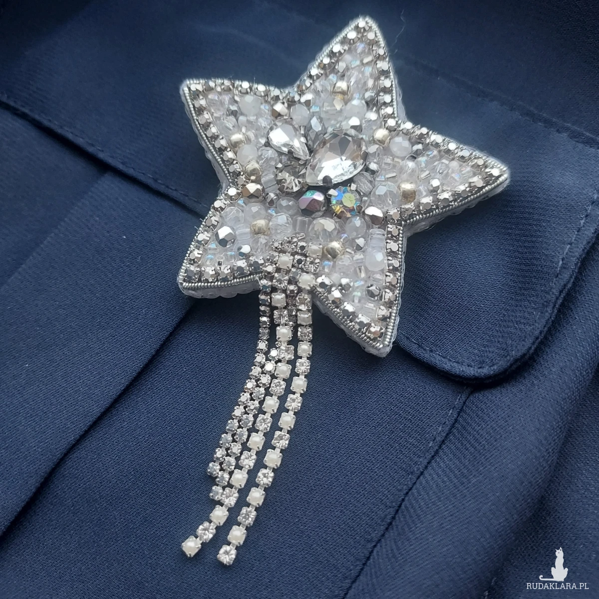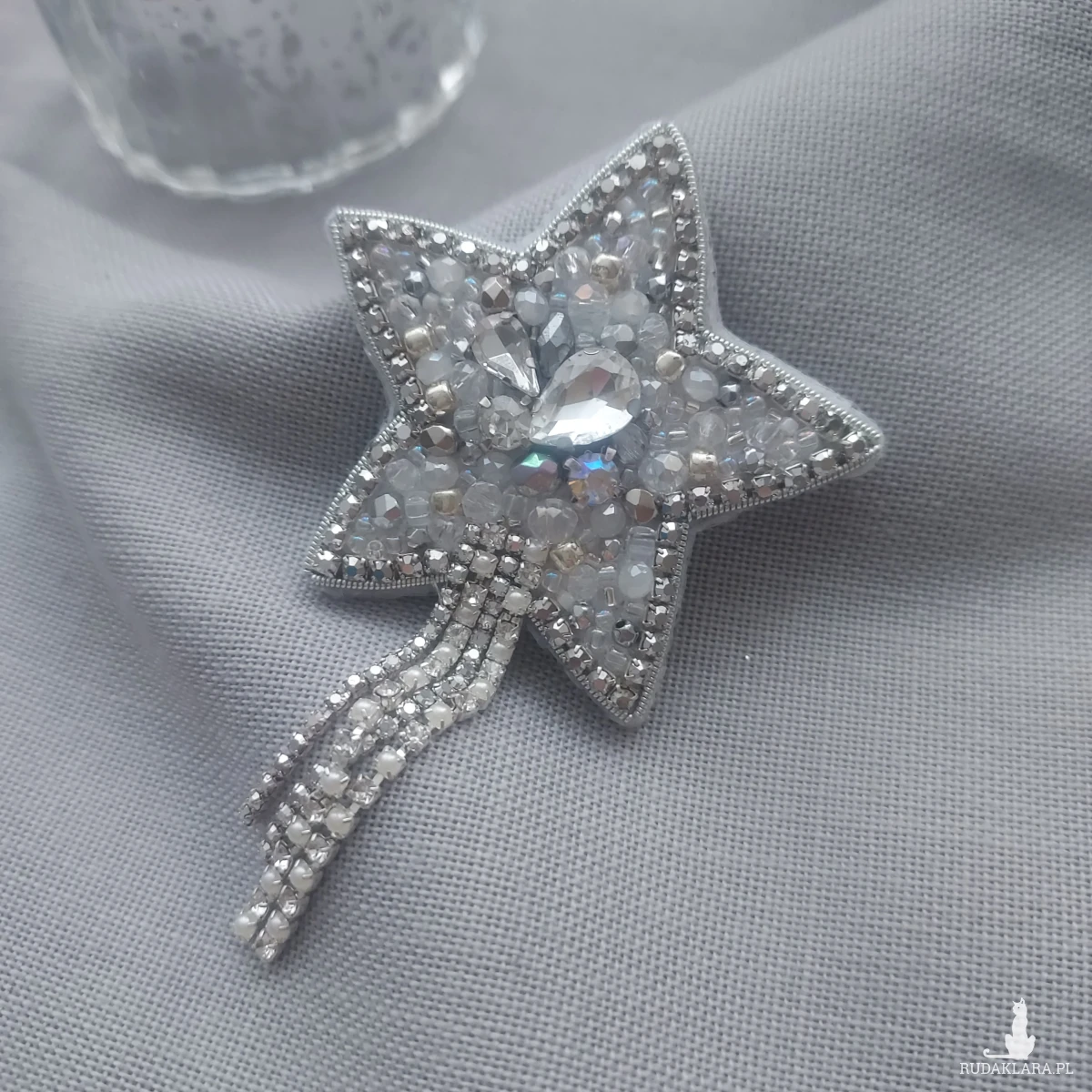 Broszka kryształkowo-srebrna gwiazda - wykonana techniką haftu koralikowego. Zdobiona taśmą cyrkoniową doda niebanalnego wyrazu i blasku zarówno codziennym, jak i eleganckim, wieczorowym kreacjom.
