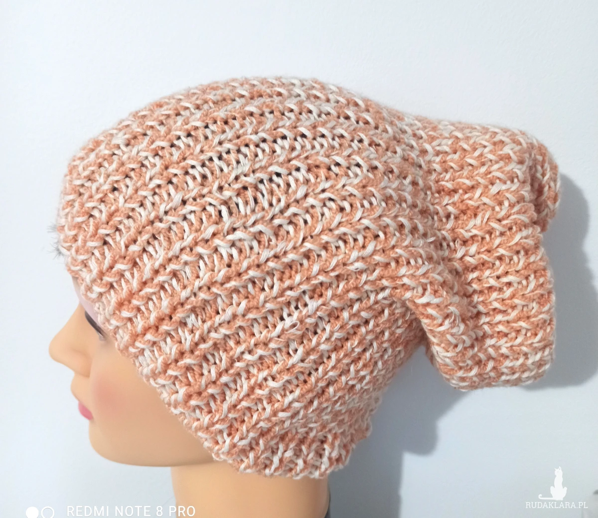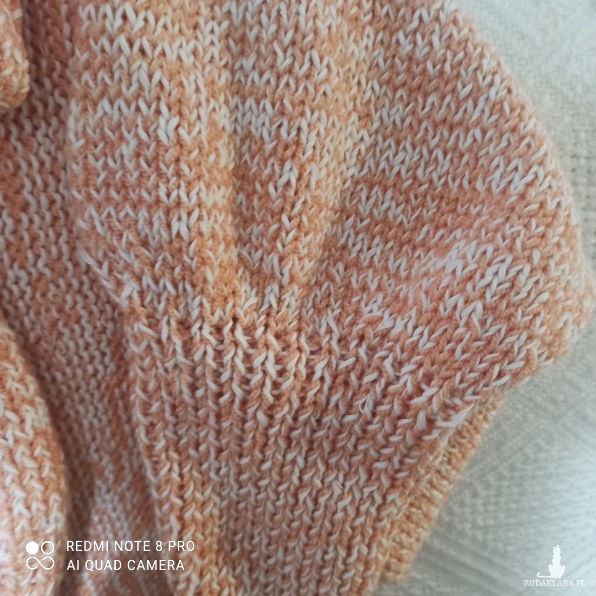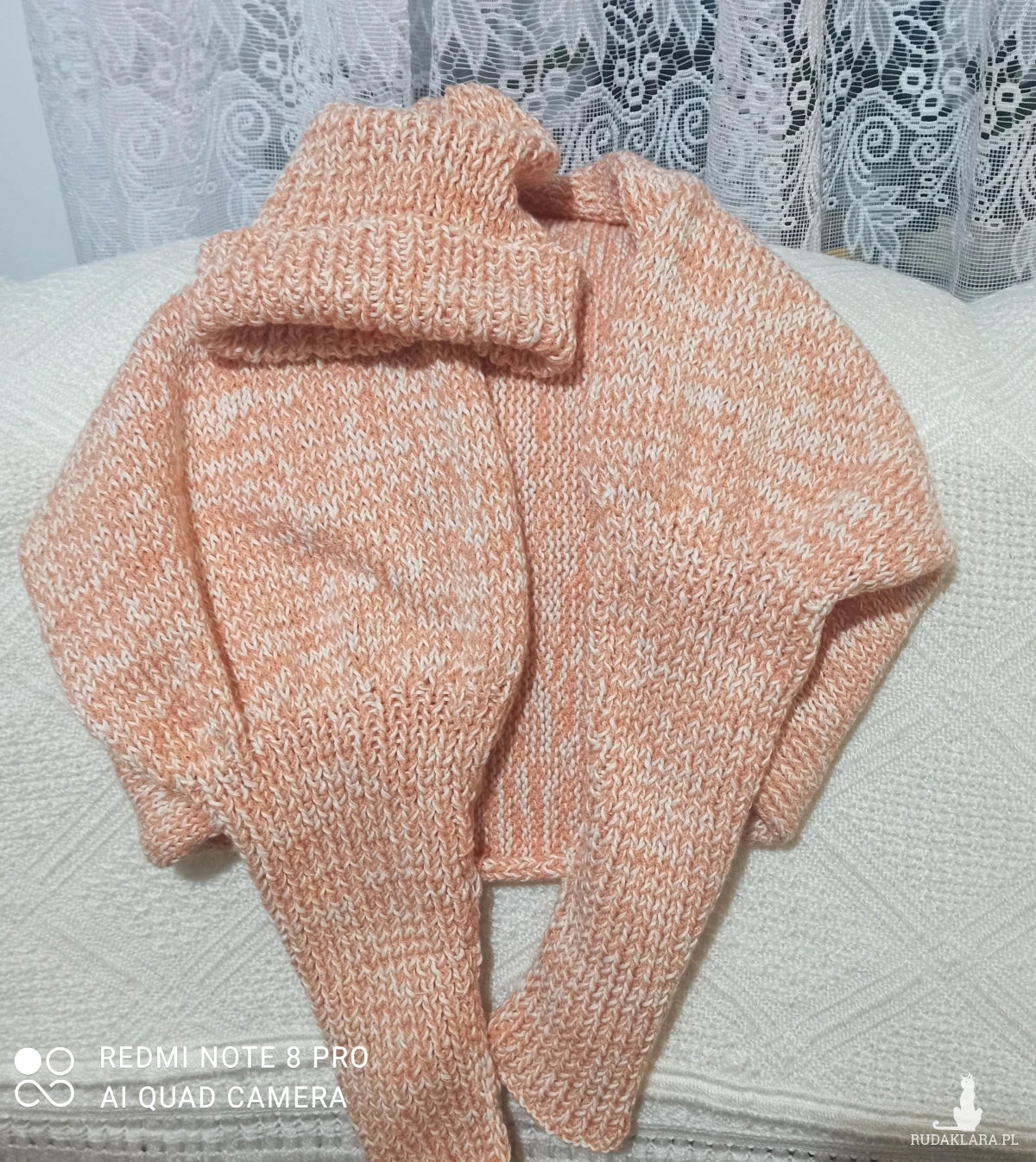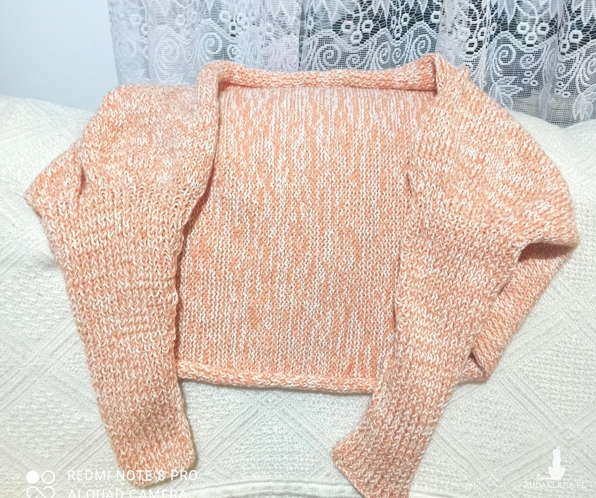 Komplet wykonany z nici bawełnianej Drops kolor ecru i drugiej akrylowej w kolorze jasnej pomarańczy. Wykonany na drutach składający się z : czapki noszonej jako wywijana lub smerfetka oraz narzutki zakładanej na ręce i plecy. Komplet średniej grubości. Mięciutki w dotyku. Skutecznie chroni przed zimnem. Wymiary czapki: długość bez wywijania 33 cm, obwód bez rozciągania 38 cm , max 61cm. Narzutka wysokość narzutki na całej długości pleców 68 cm, długość z rękawami 154 cm. Czapka wykonana ściegiem ściągaczowym1 oczko prawe, jedno lewe podobnie rękawy. Część zakrywająca plecy prawymi oczkami.
