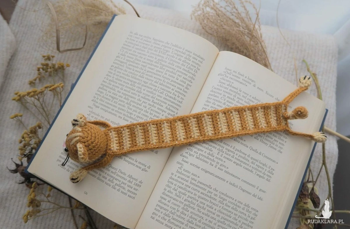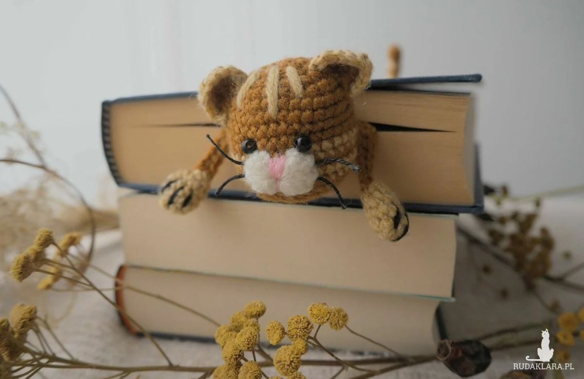 Zakładka do książki z sympatycznym kotem wykonana z włóczki na szydełku.