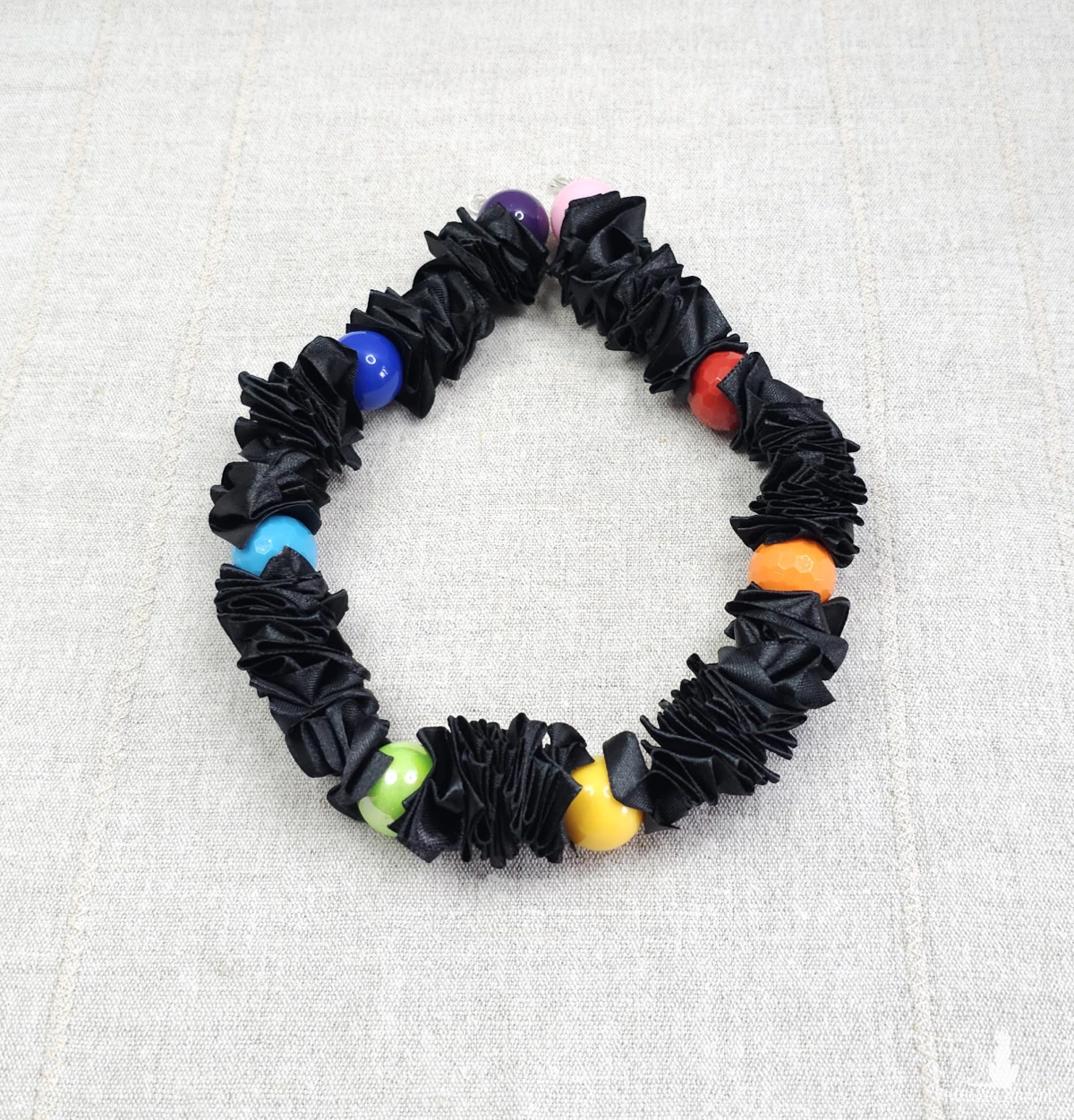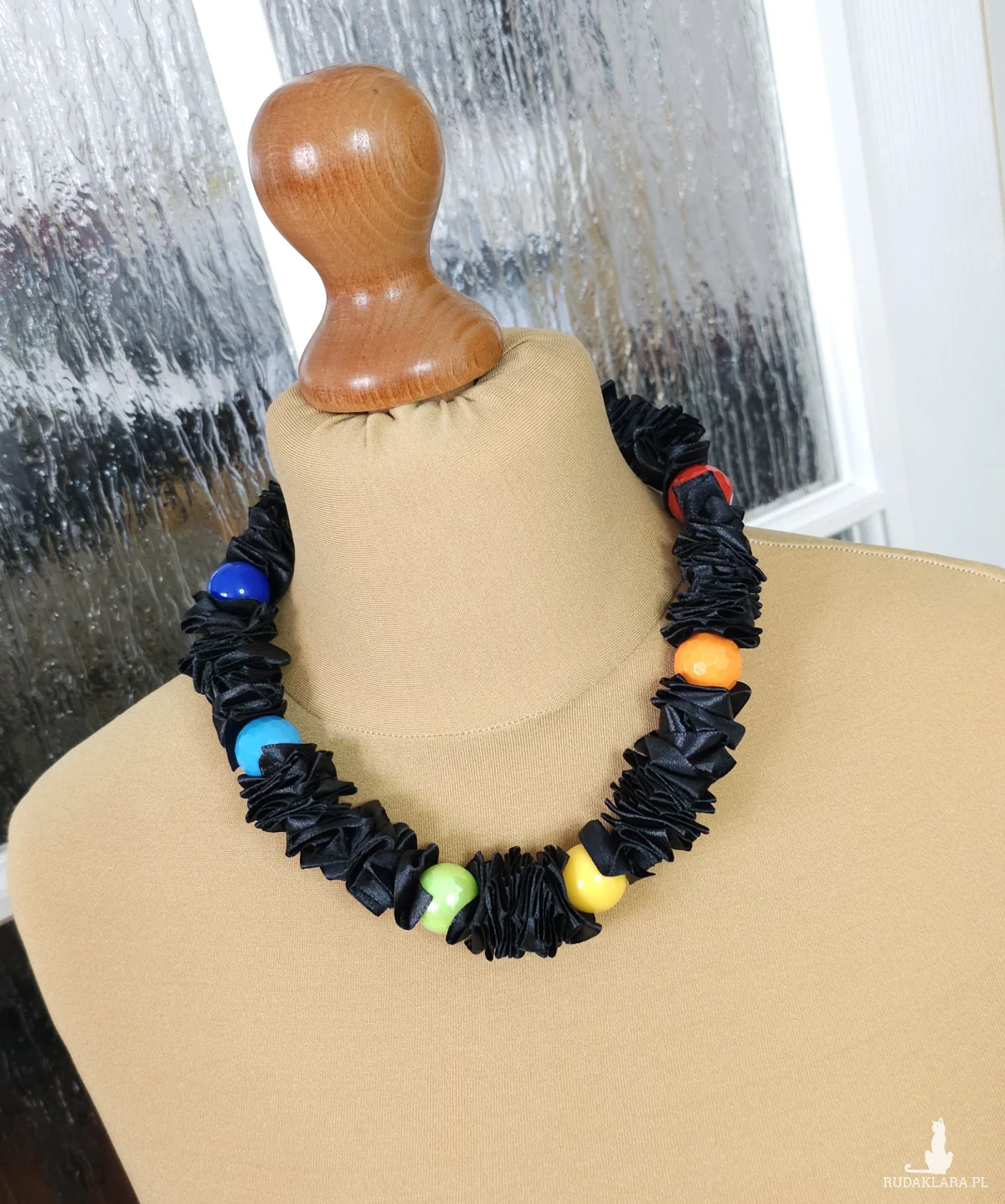Został wykonany z czarnej, marszczonej satyny, która tworzy bogatą, teksturowaną bazę. Na tym tle wspaniale wyróżniają się gładkie, kolorowe kulki akrylowe o średnicy 20 mm, które przyciągają wzrok i dodają energii.