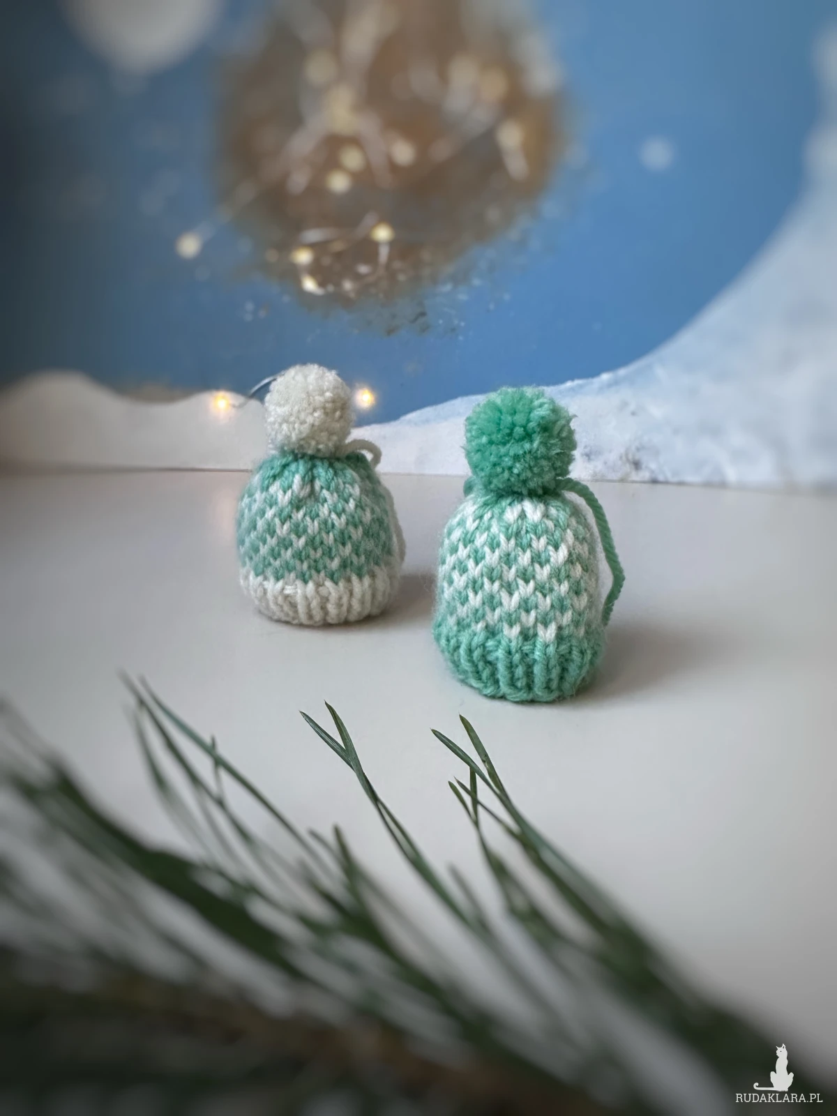 Zestaw 2 szt. zawieszek choinkowych, mini-czapeczek, wykonanych ręcznie na drutach z wełny owczej.