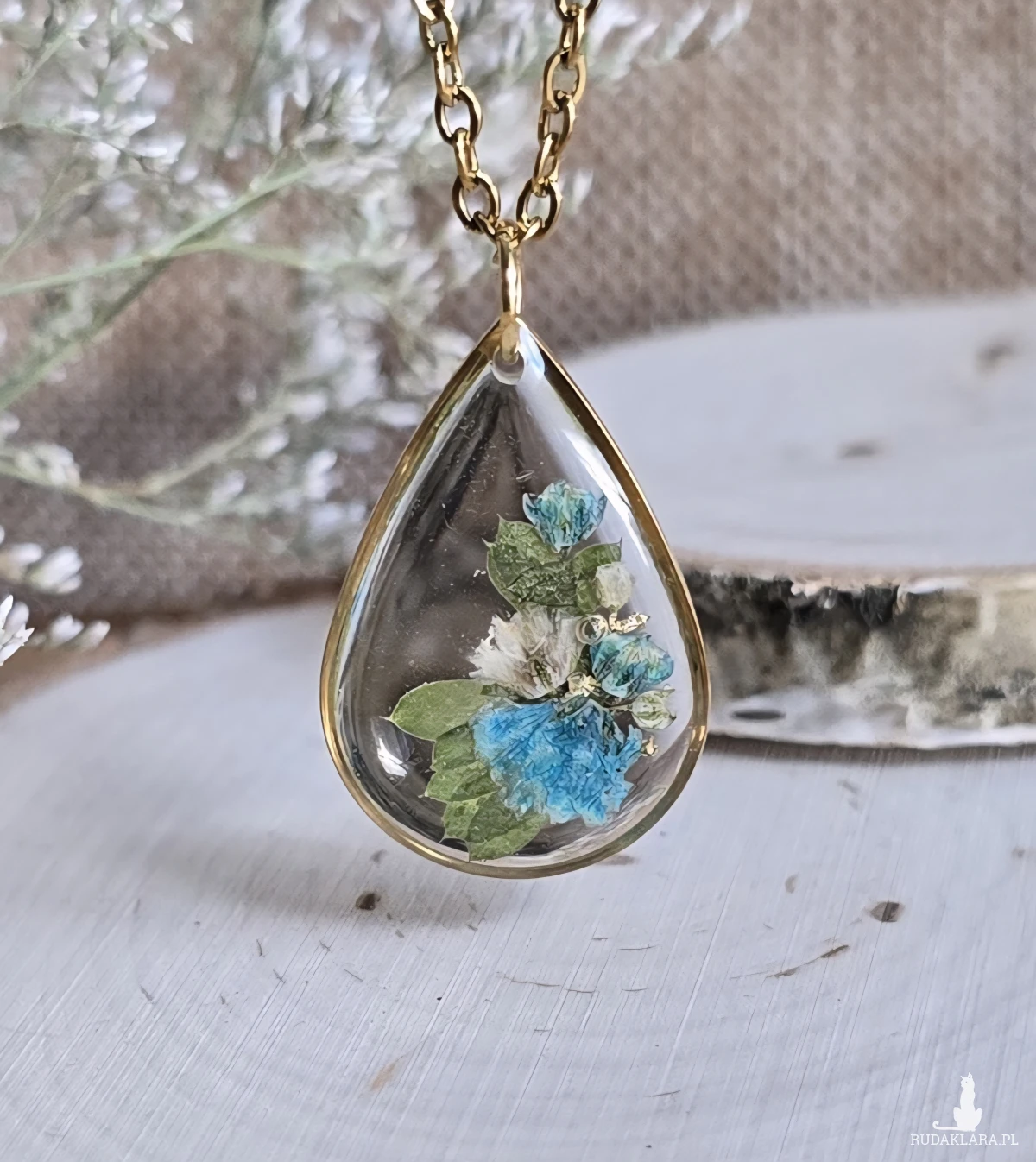 Złota zawieszka złoty wisiorek kwiat naszyjnik żywica z żywicy kwiaty łezka łza kropelka gipsówka niebieska