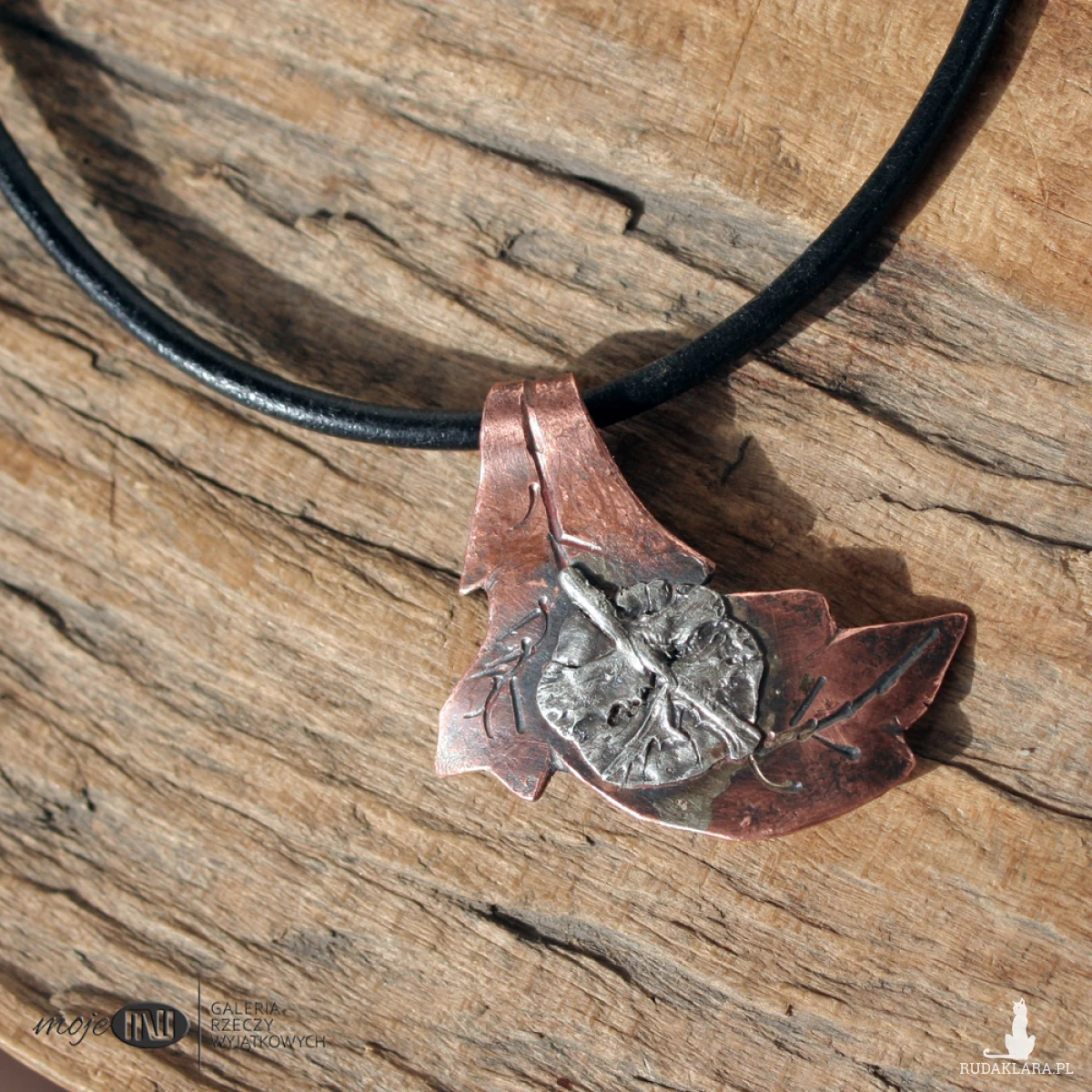 Wisior z miedzi i srebra w formie stylizowanego liścia. Wisior zawieszony jest na czarnym skórzanym rzemieniu o grubości 3 mm i długości ok. 50 cm, końcówki rzemienia i zapięcie ze stali chirurgicznej.