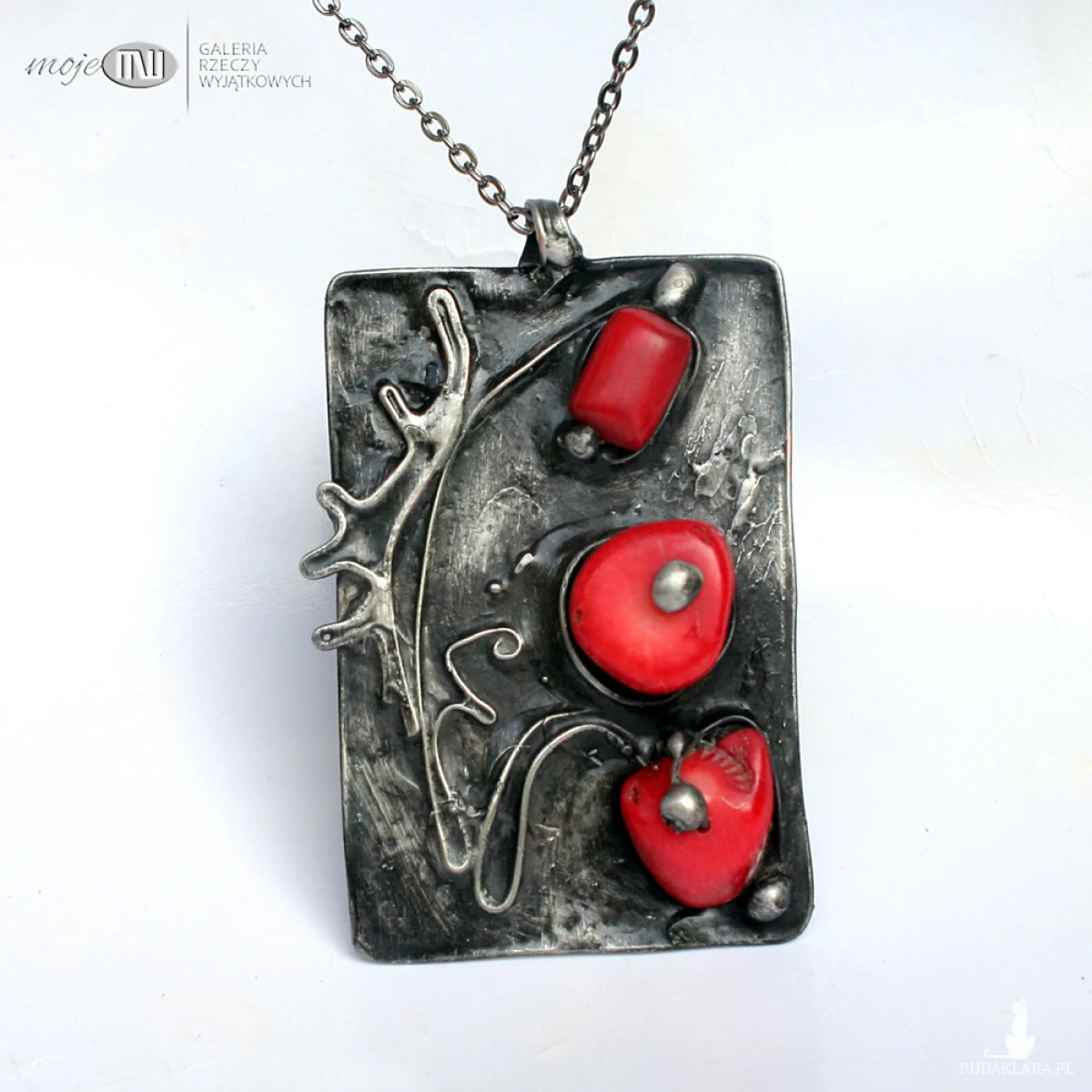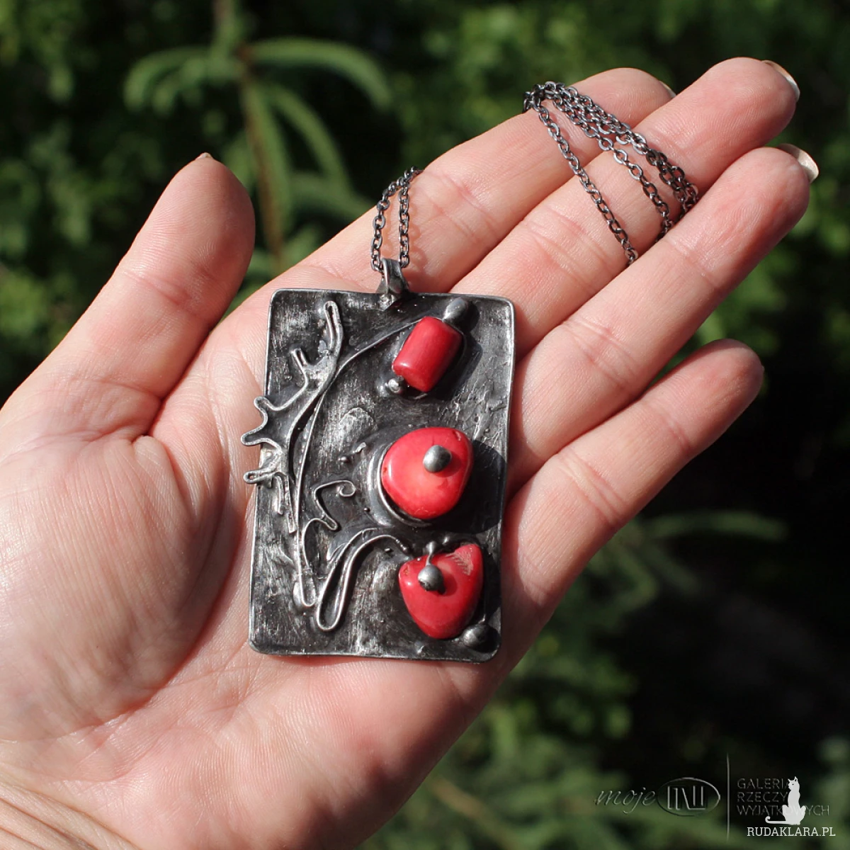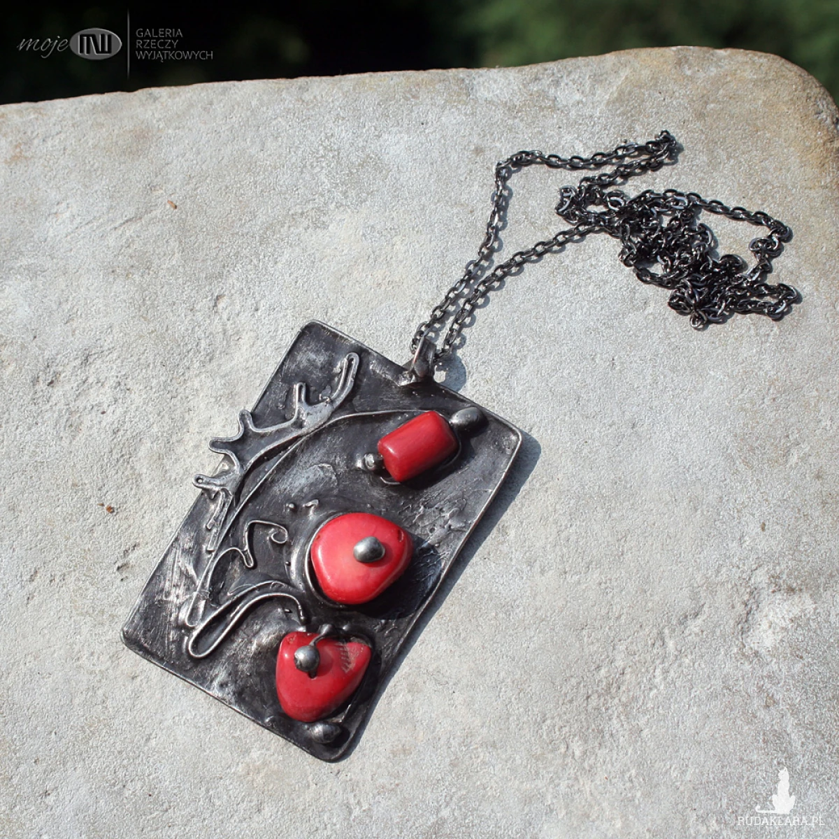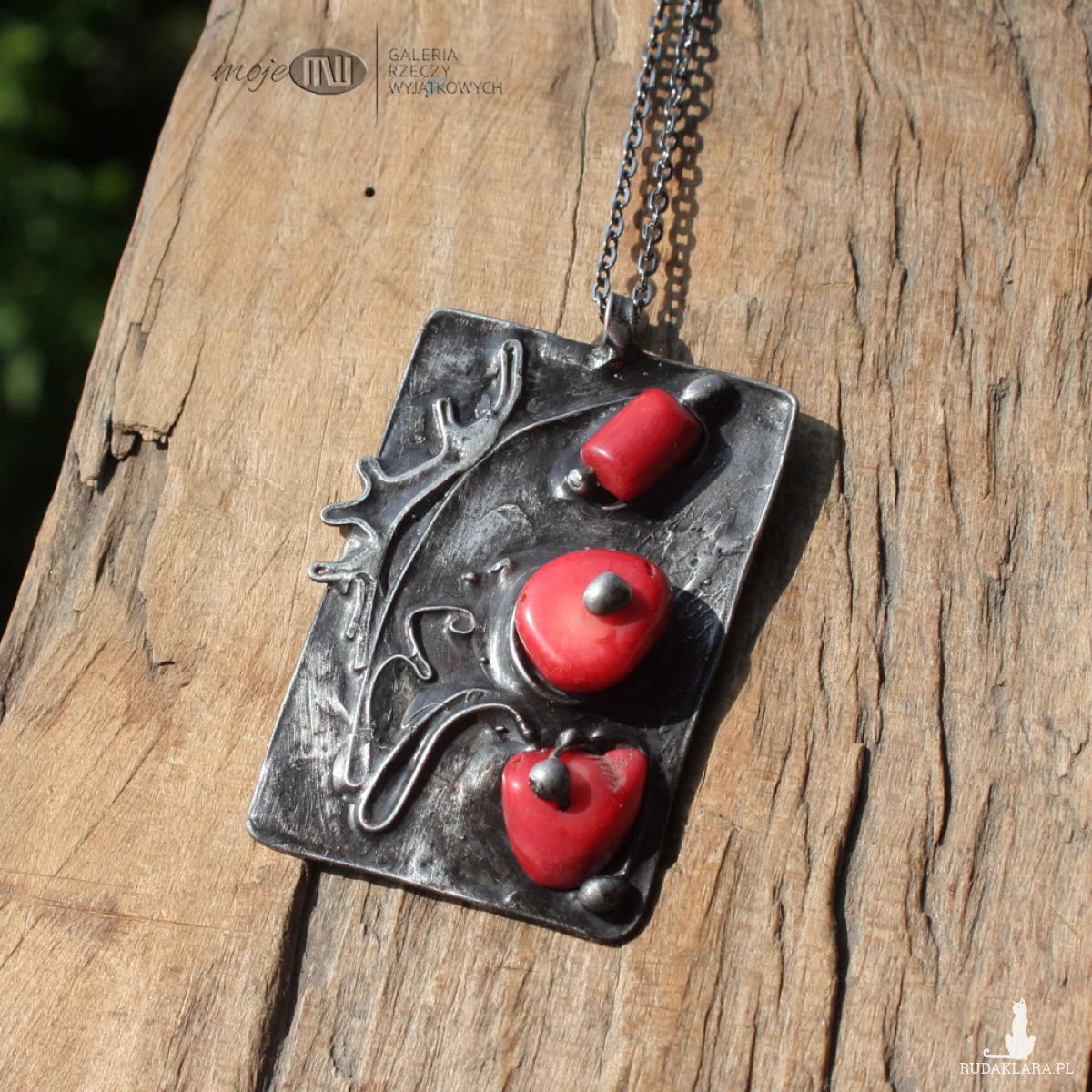 Prostokątny wisior z miedzi pokrytej cyną i patynowanej na kolor starego srebra. Koloru dodają czerwone plastry i oponka prawdziwego korala, jako stylizowane kwiaty maków. Wisior zawieszony jest na łańcuszku w kolorze grafitowym. Zazwyczaj dodaję łańcuszek o długości 60 - 70 cm, ale klient przy zamówieniu może podać długość, która go interesuje.