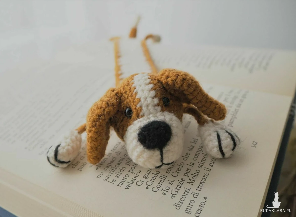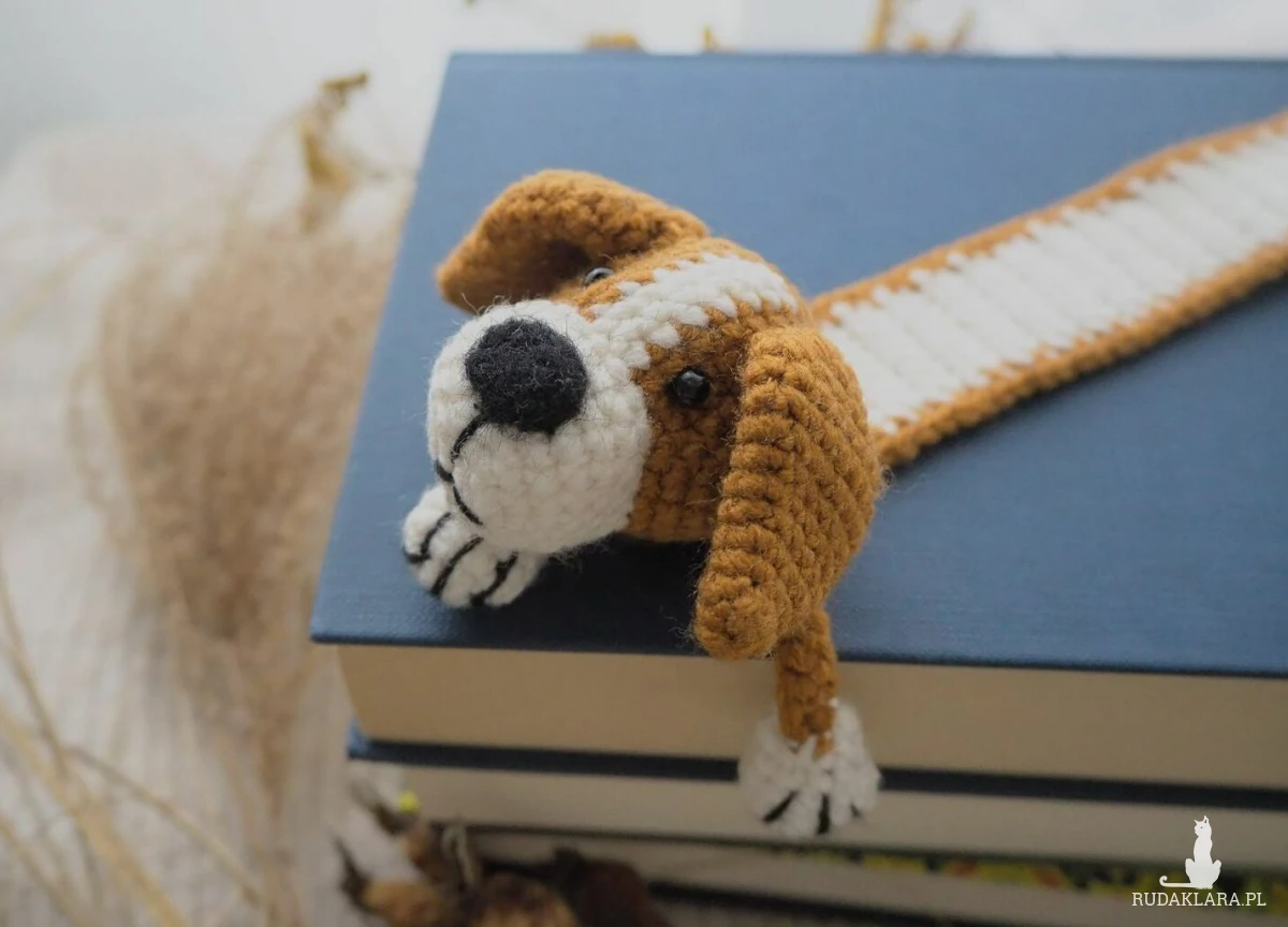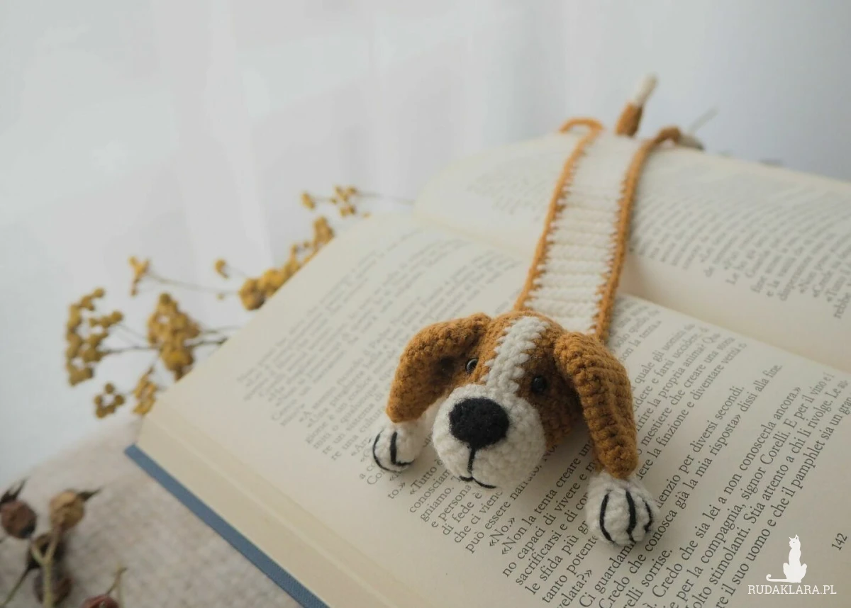 Zakładka do książki z sympatycznym pieskiem wykonana z włóczki na szydełku.