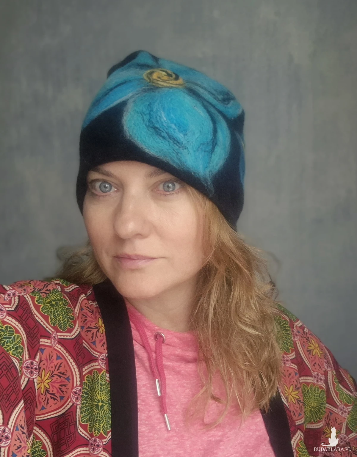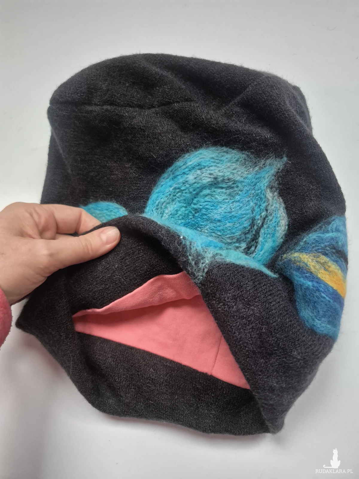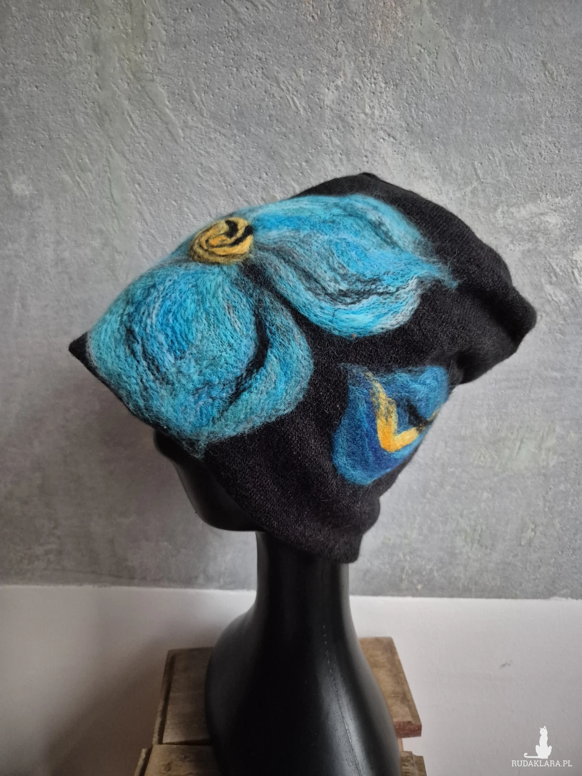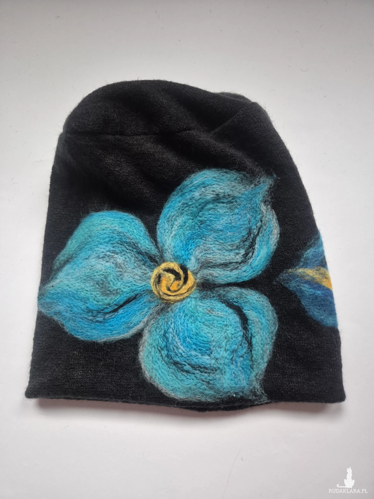 czapka wełniana filcowana zimowa czarna handmade w kwiaty na podszewce-- rozmiar uniwersalny, wełniana, filcowana wełną merynosów, bardzo ciepła, fantastyczna, miła, miękko układa się na głowie, niesamowicie zwraca uwagę, doskonałą na codzienne noszenie jak i na prezent, zawsze możesz ją założyć po basenie i przeżyjesz,box w1