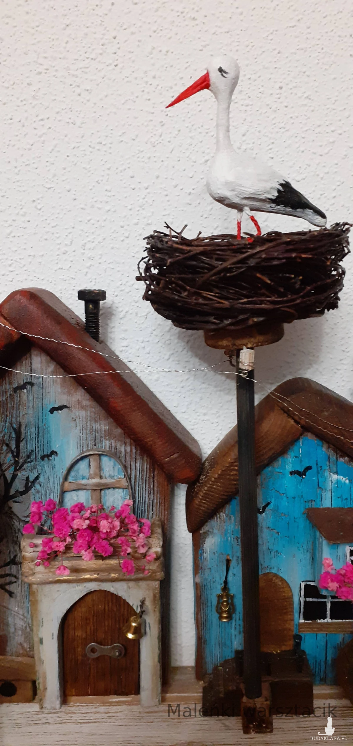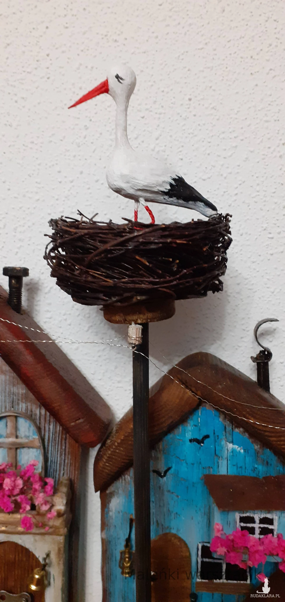 Praca w całości wykonana własnoręcznie z przypadkowej ramy okiennej, starych desek oraz drewna opałowego. Bocian wyrzeźbiony z drewna sosnowego. Do malowania zostały użyte farby akrylowe oraz pasta woskowa. Całość zabezpieczona jest akrylowym lakierem satynowym.