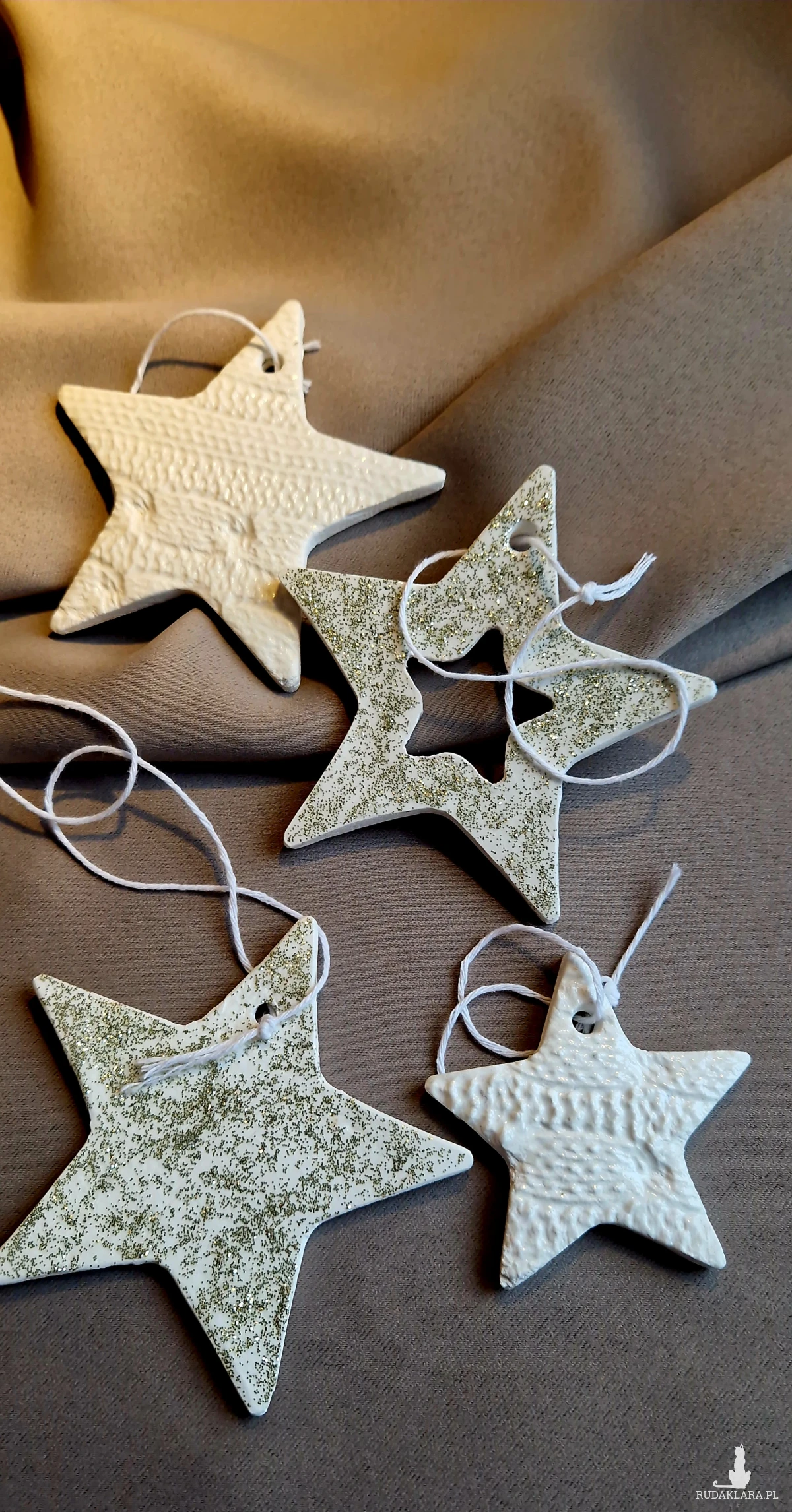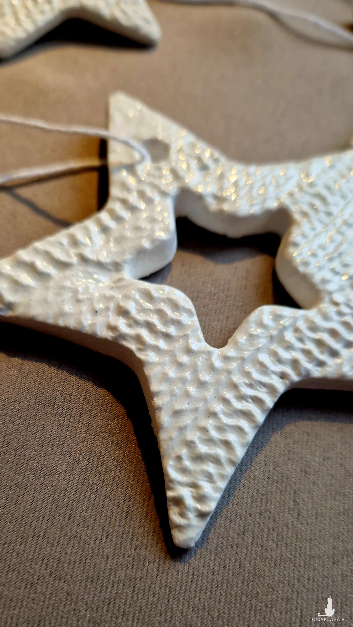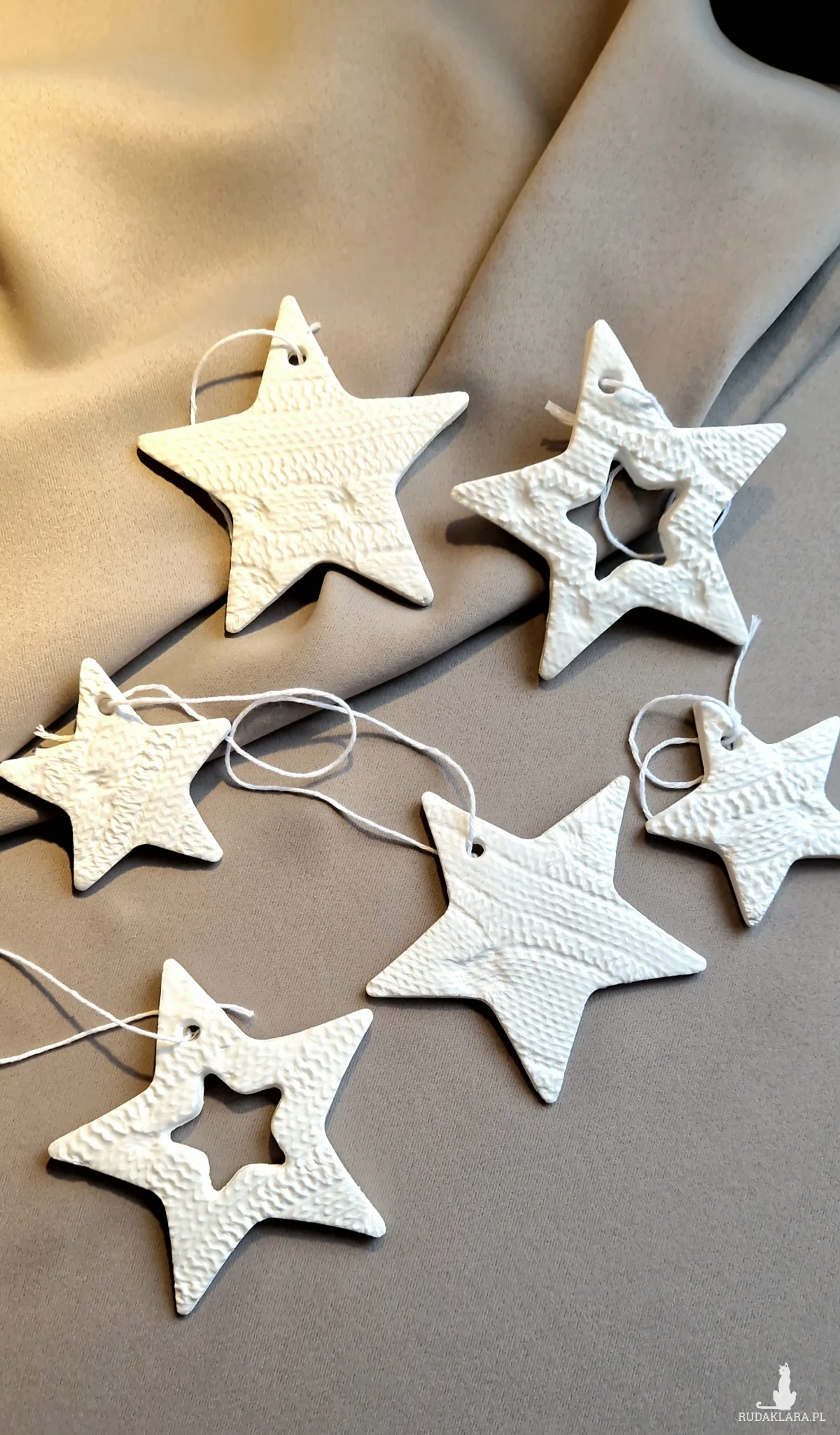 Wyjątkowe zawieszki w kształcie gwiazdek, w dwóch rozmiarach. Każda gwiazdka ma odciśnięty delikatny wzór sweterkowy, który nadaje jej ciepły, świąteczny charakter.