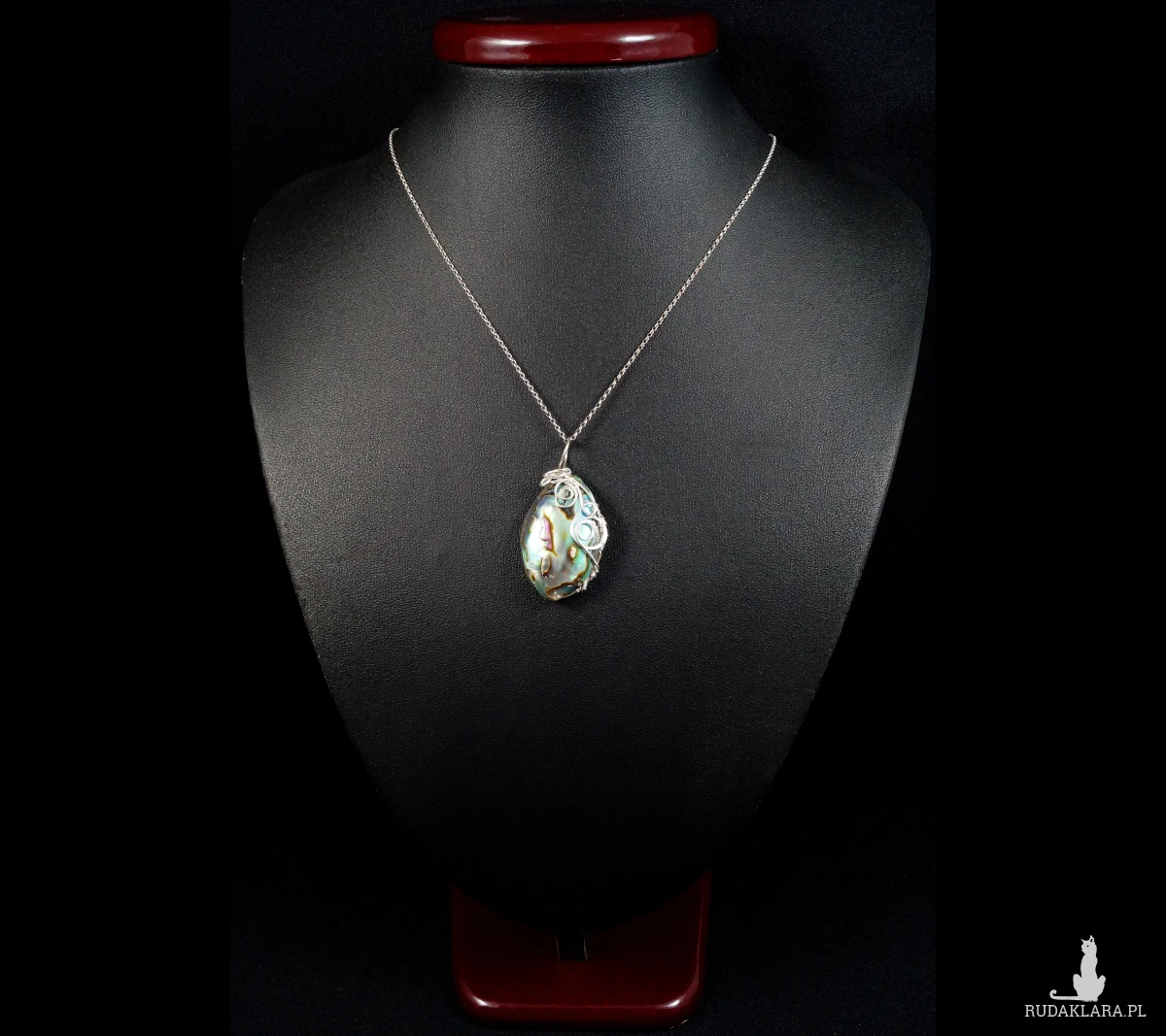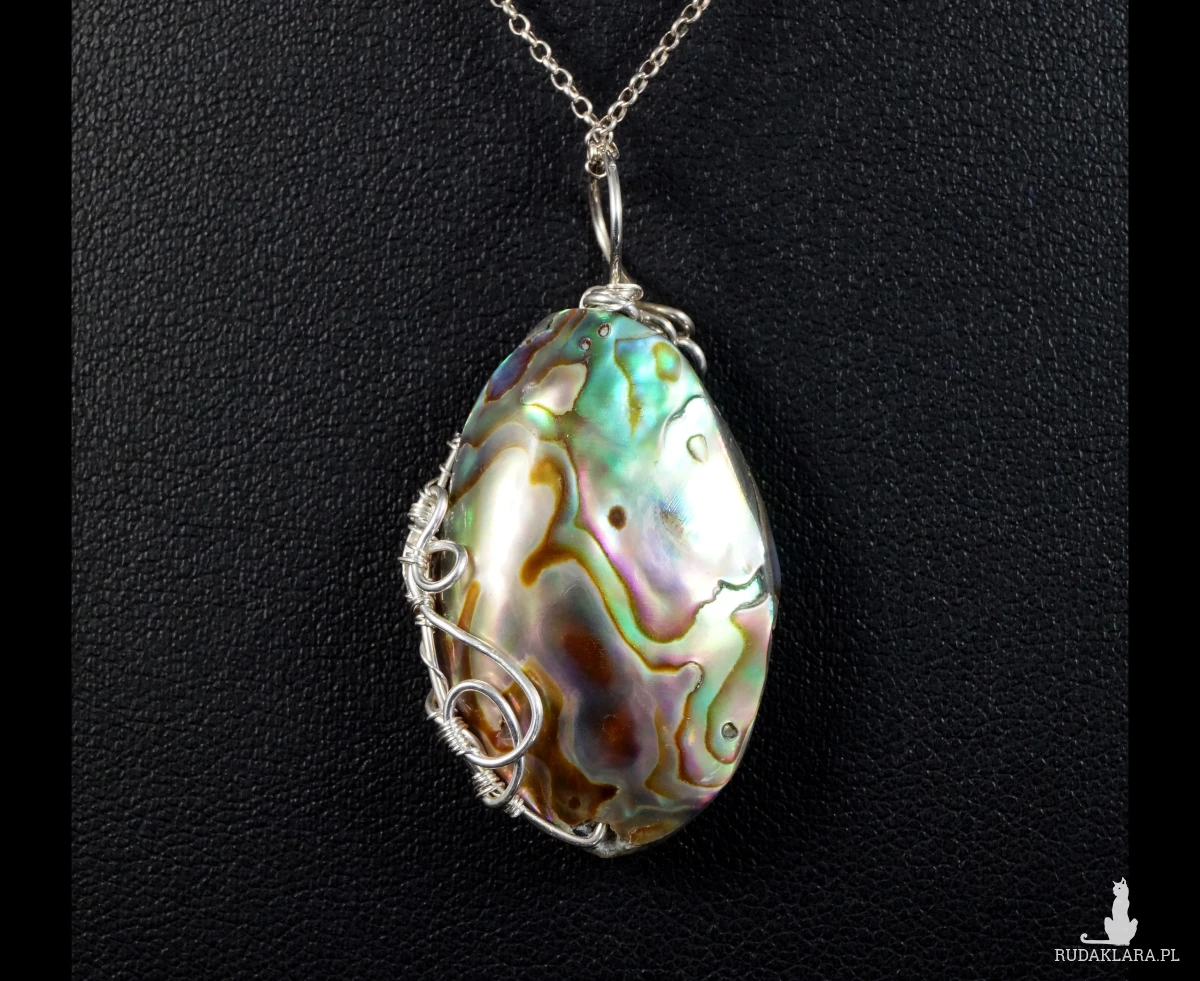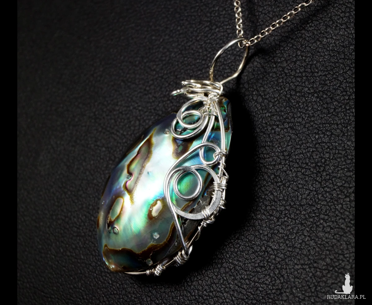 Niepowtarzalny, misternie pleciony wisior z muszlą abalone.